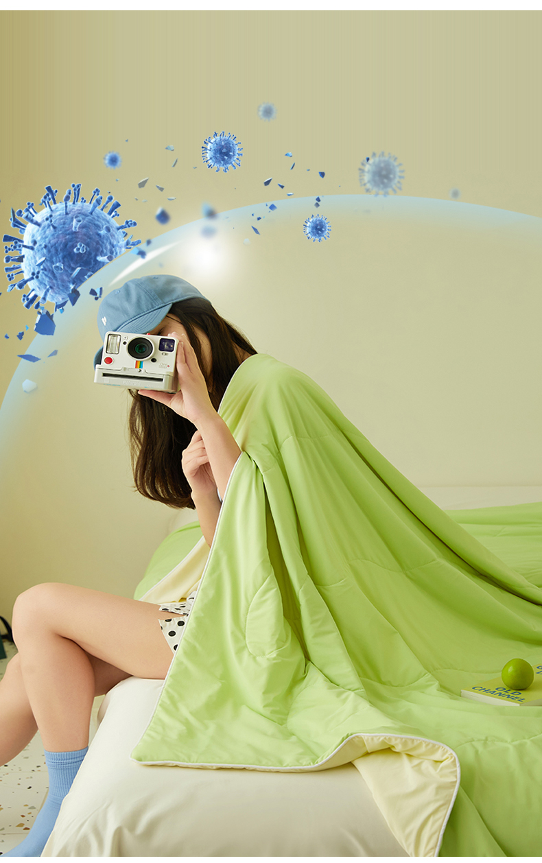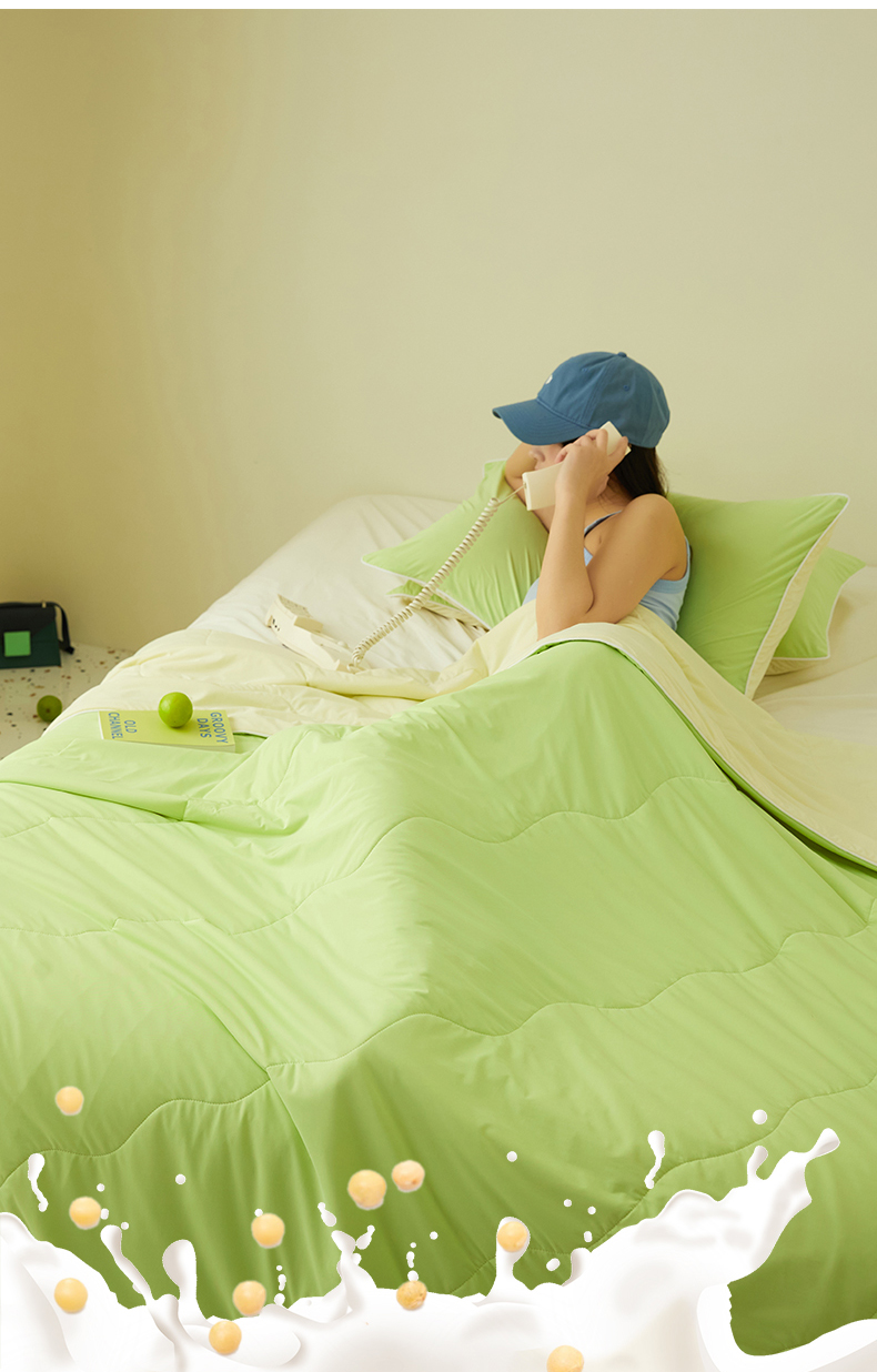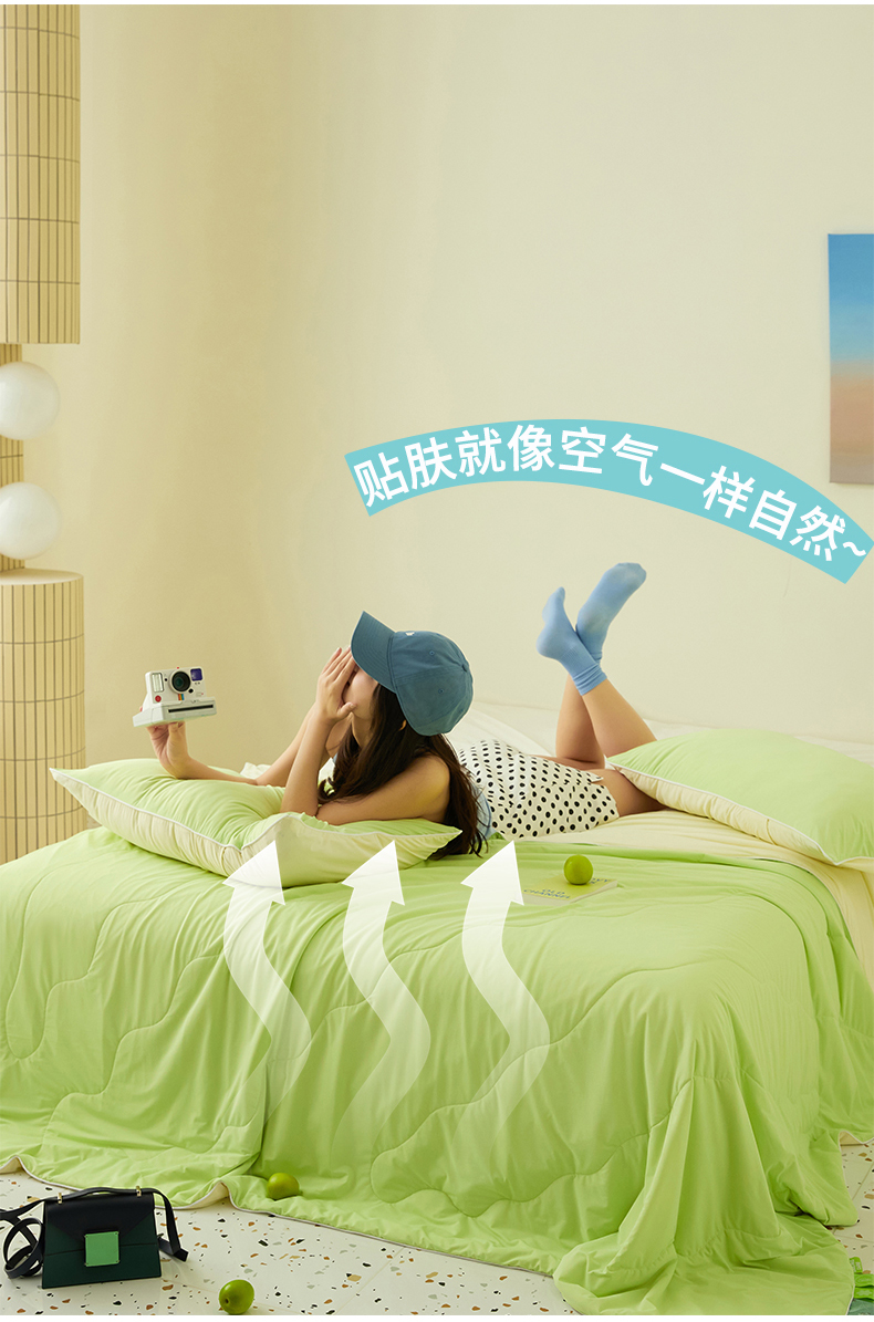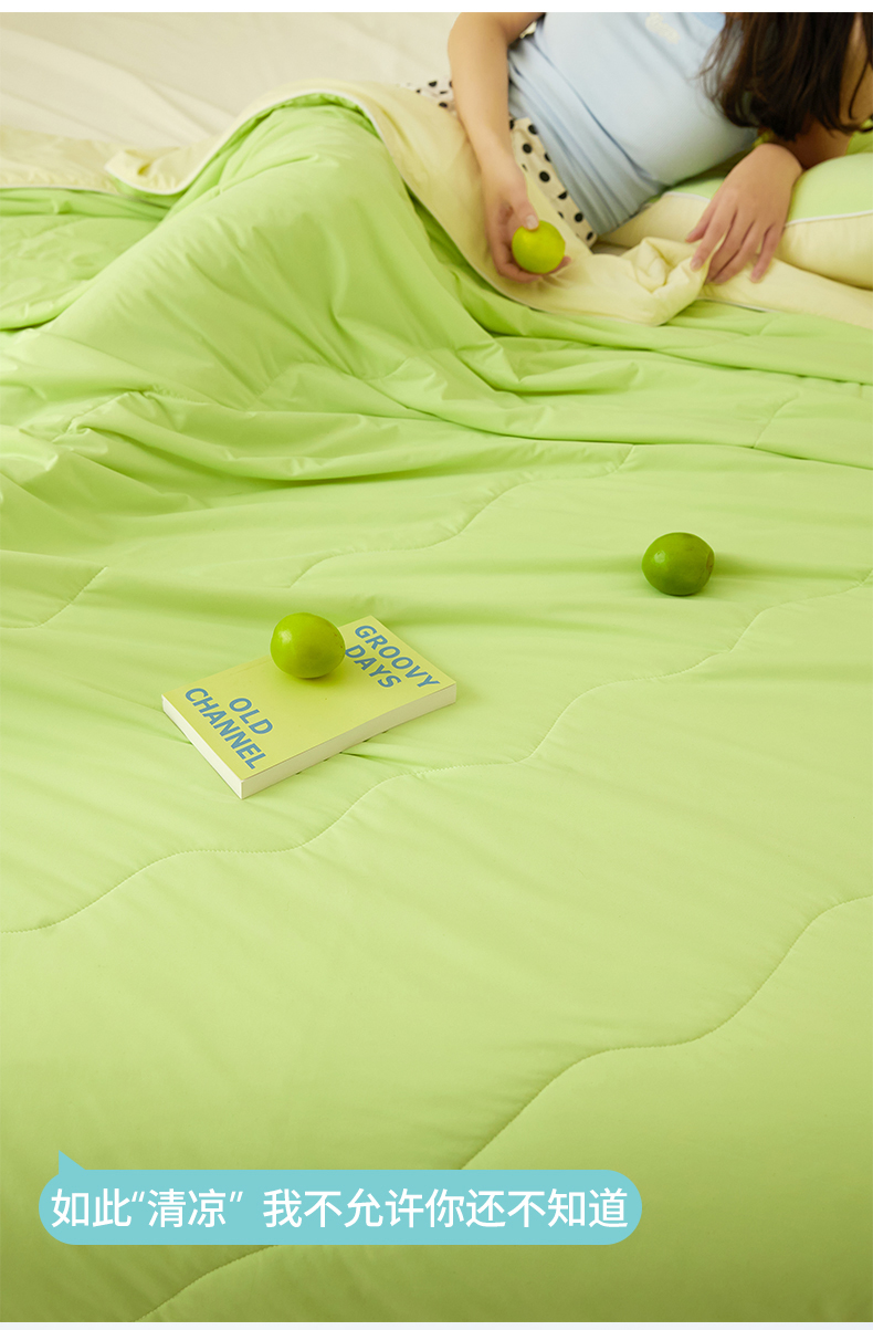 商品名称:头等舱 2025新款锦氨凉感A类20大豆7A抗菌纯色空调被夏凉被夏被模特图(配礼盒) 活力绿+米黄