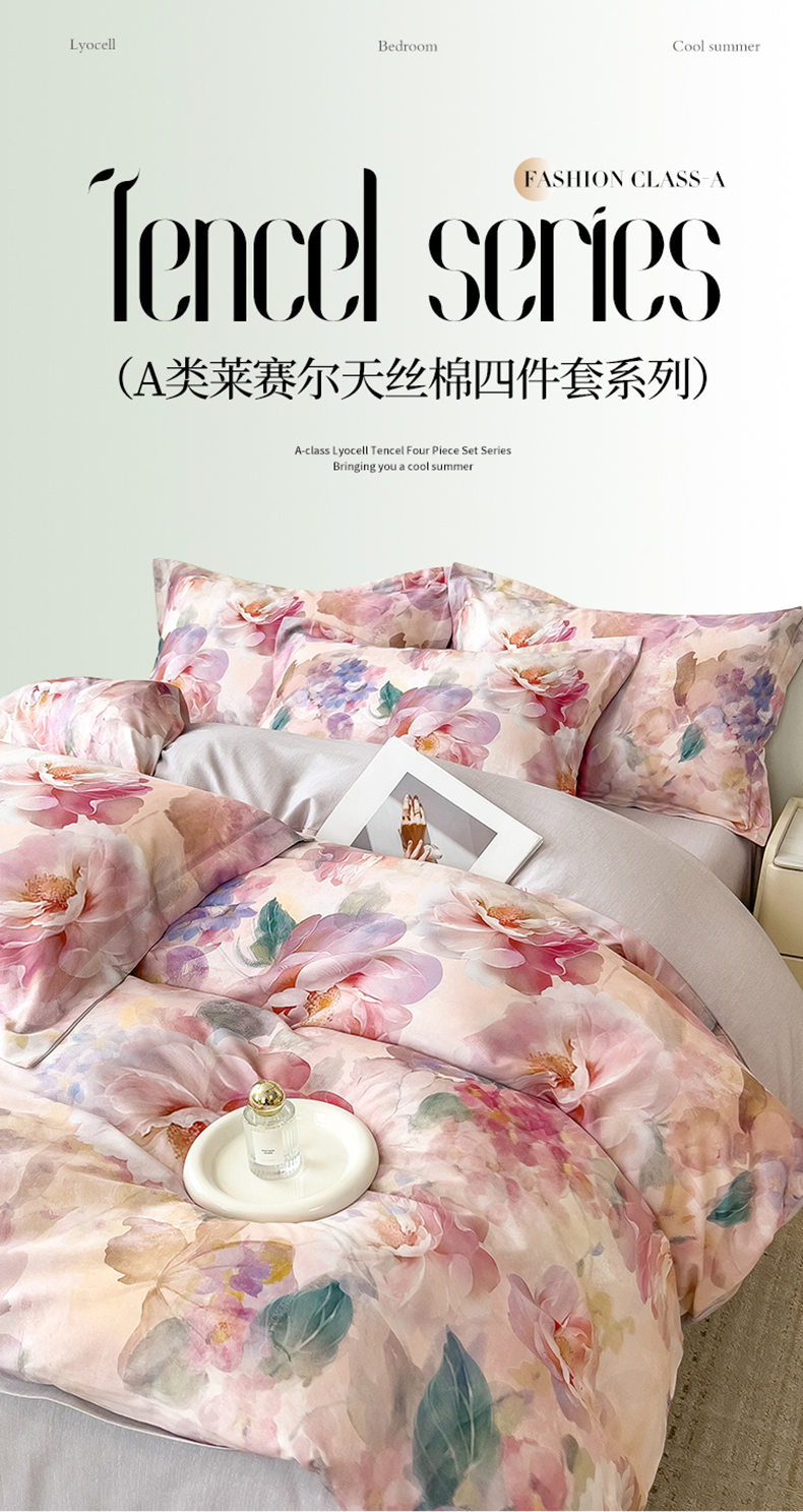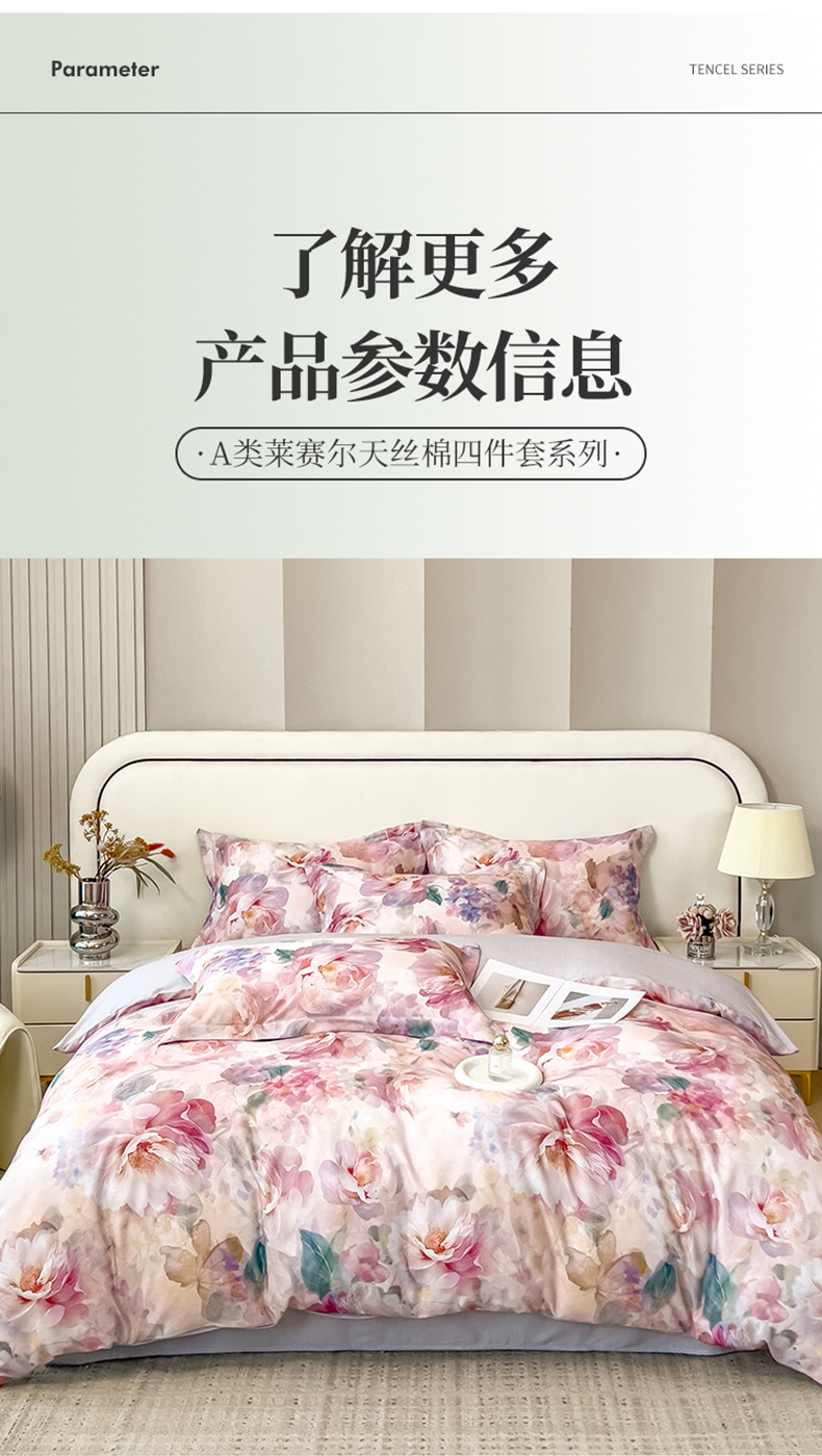 (总)芃成家纺 2025新款A类莱赛尔天丝棉四件套,梦幻花海,缤纷花语,国色天香,花开如画,花舞,奥斯汀玫瑰,春暖花开-粉,春暖花开-紫,春色写意-灰,春色写意-兰,冬雪寒香,繁花满庭,古典玫瑰,国色花韵-粉,国色花韵-玉,花涧入梦,秘境灰,莫奈花园,青花瓷,秋日私语,水墨花卉,晚秋,絮语,烟云牡丹