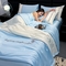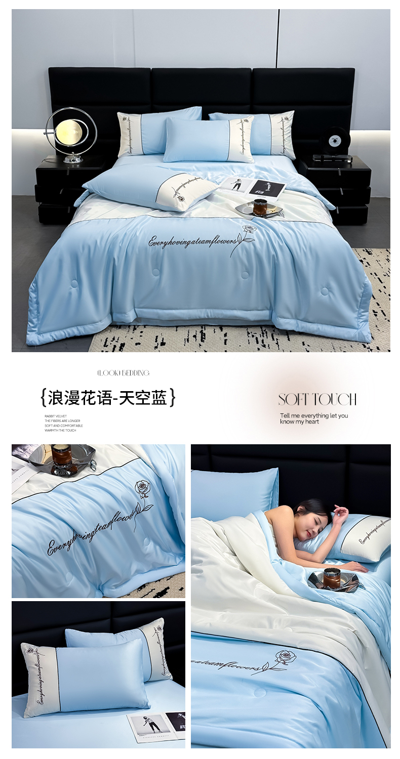 • 91家纺网 家纺一手货源 找家纺 卡罗兰 2025新款水洗真丝夏凉被空调被拼接款手工包边浪漫花语系列 浪漫花语-天空蓝