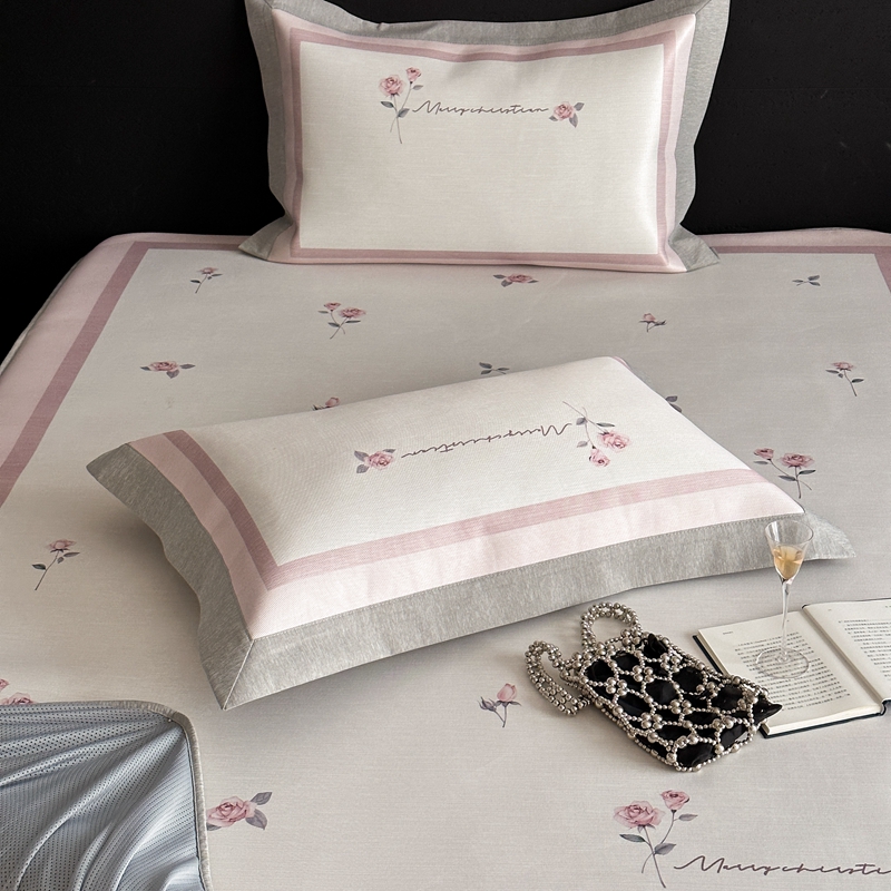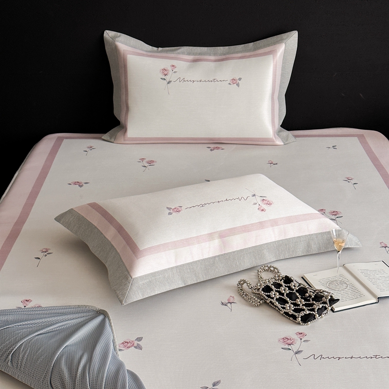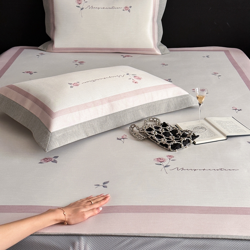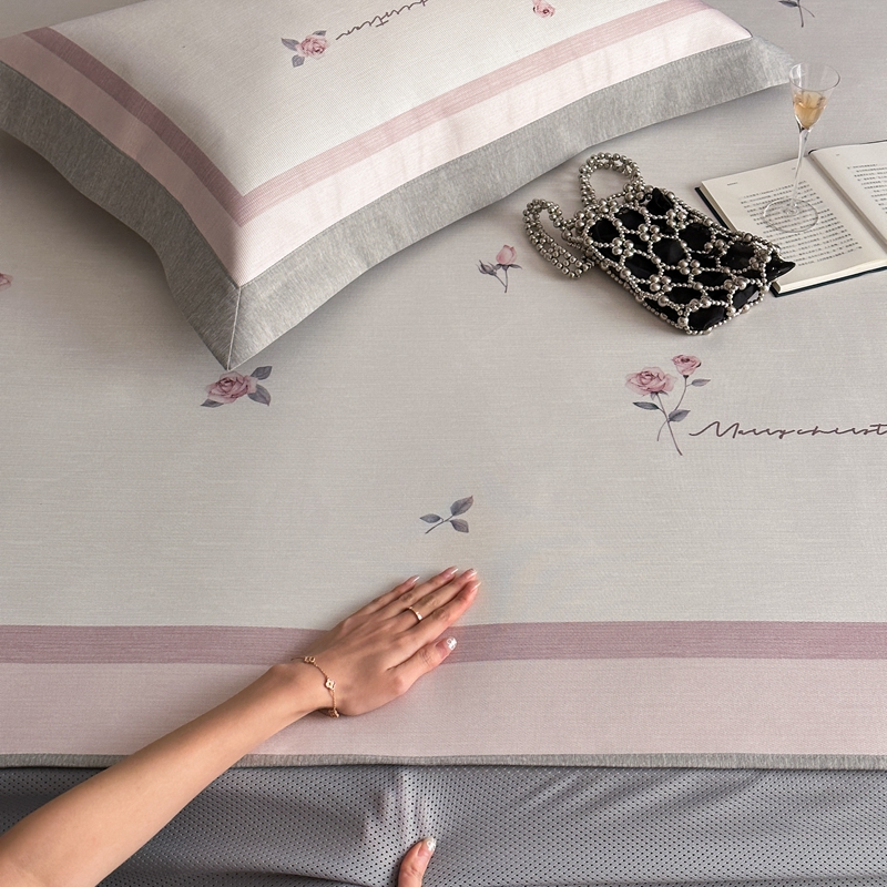 商品名称:三味舒屋 2025新款凉感抗菌南法恬谧系列大版数码印花冰丝床席-床笠 米蕾粉-床笠款
