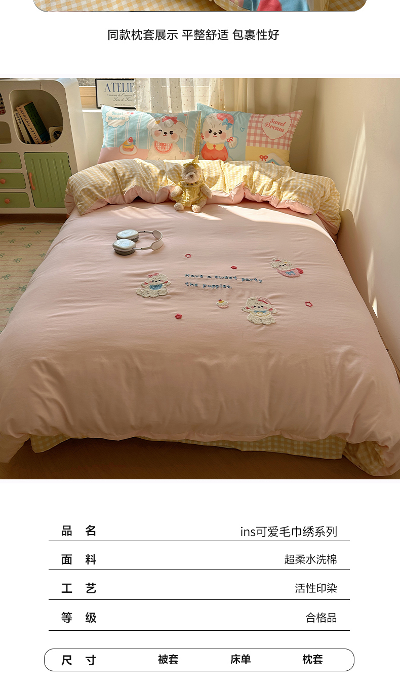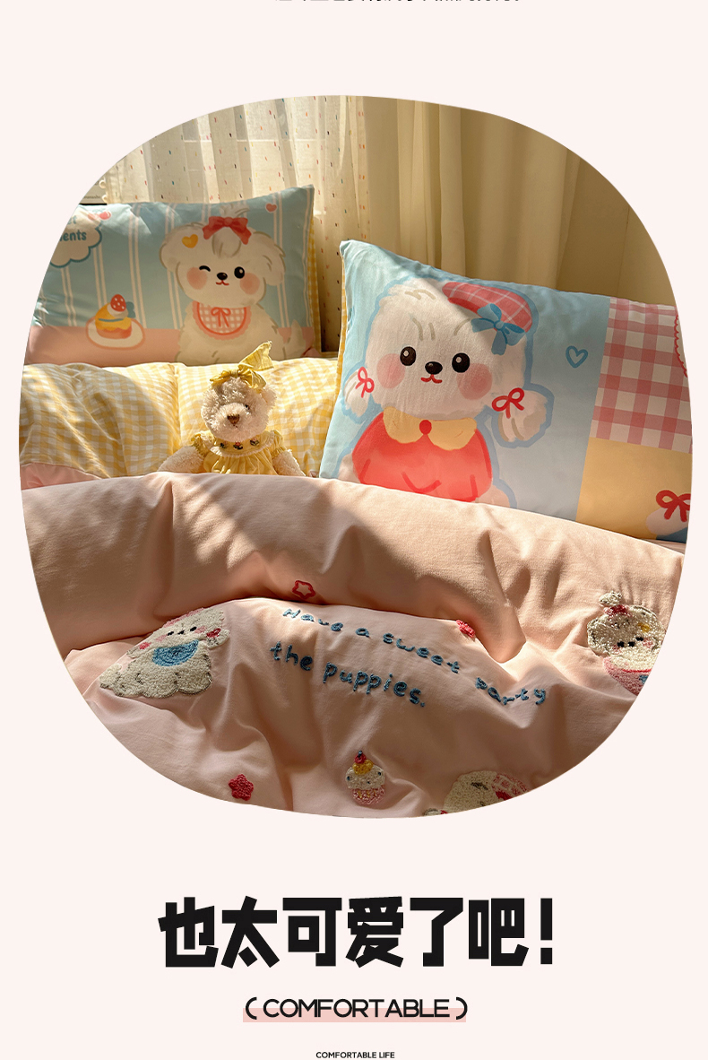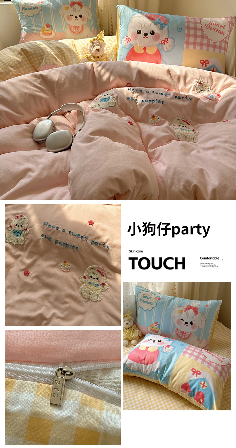 当前位置: 91家纺网 > 商品网购 > 床品套件 > 四件套 > 毛巾绣四件套 > 贝扬思家纺 2025新款萌萌哒卡通毛巾绣四件套 小狗仔party