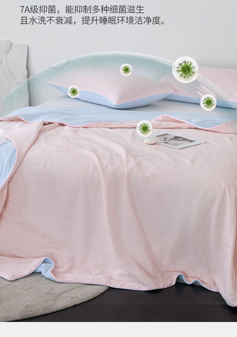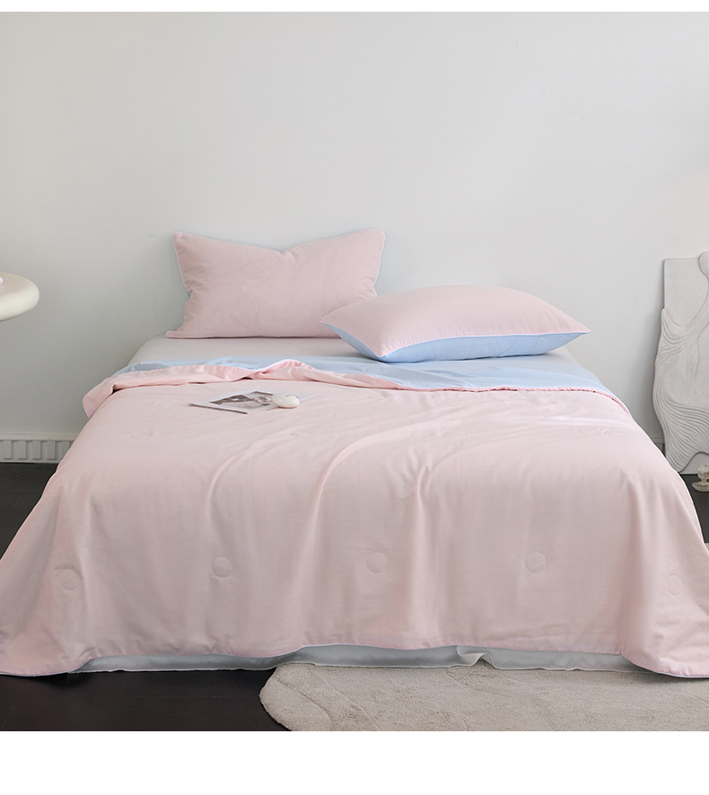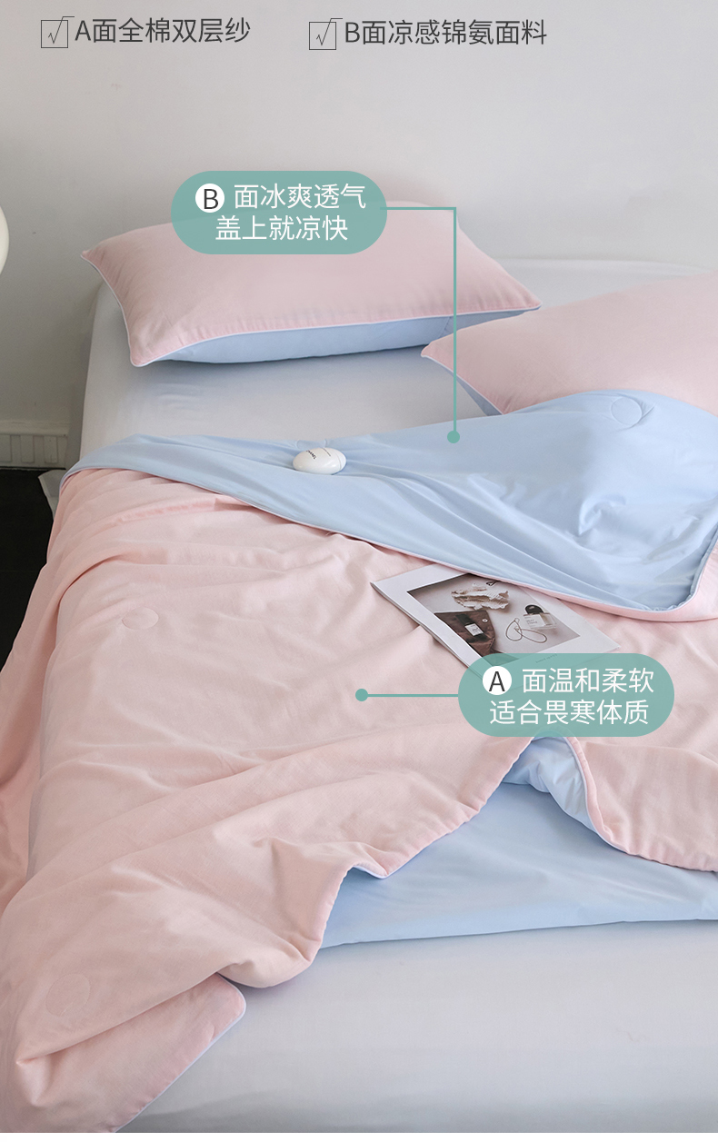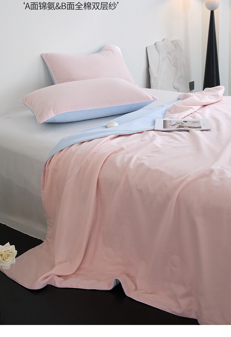 商品名称:头等舱 2025新款锦氨&全棉双层纱一被两用A类20大豆7A抗菌夏被(配礼盒) 嫩粉天蓝