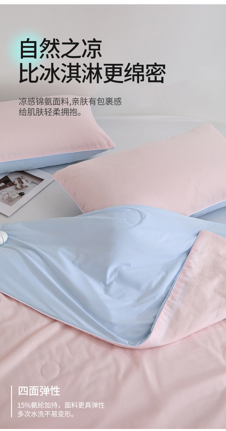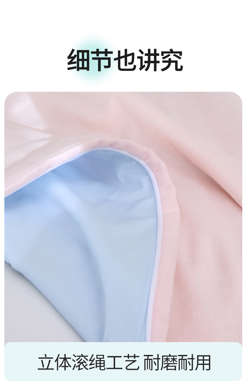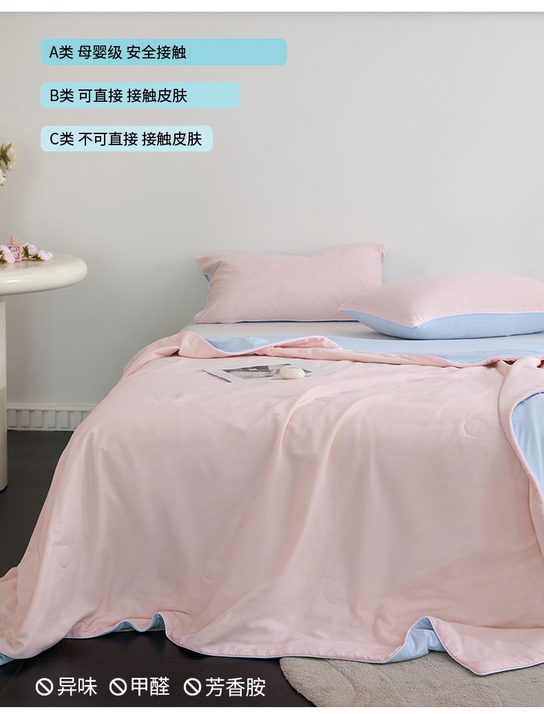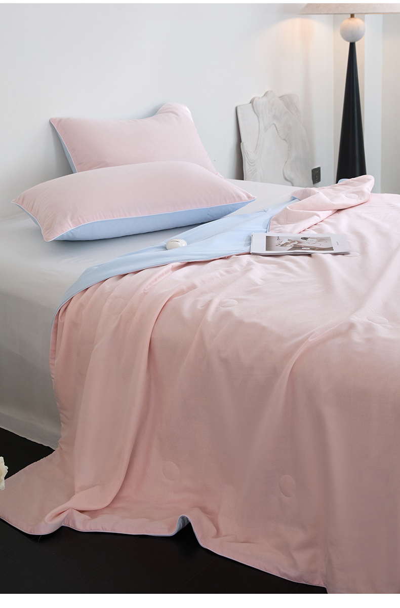 商品名称:头等舱 2025新款锦氨&全棉双层纱一被两用A类20大豆7A抗菌夏被(配礼盒) 嫩粉天蓝