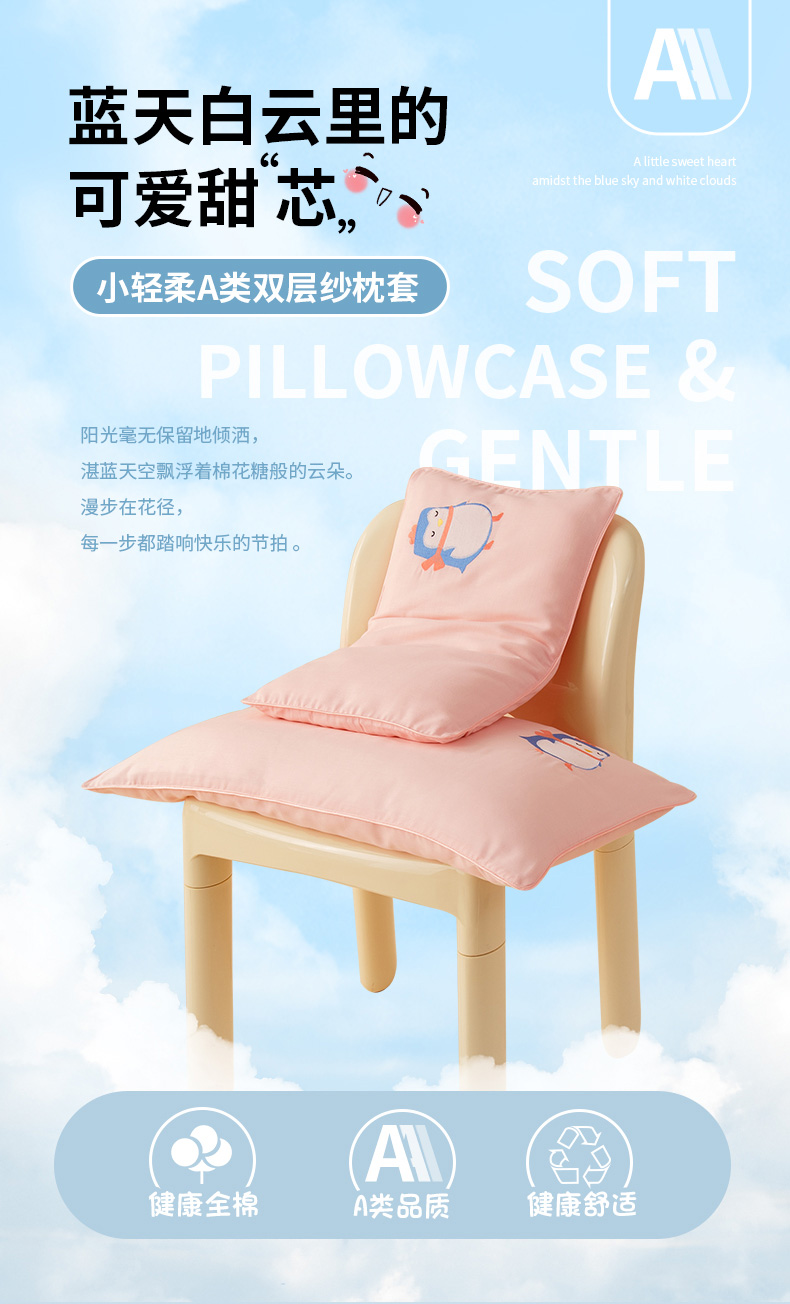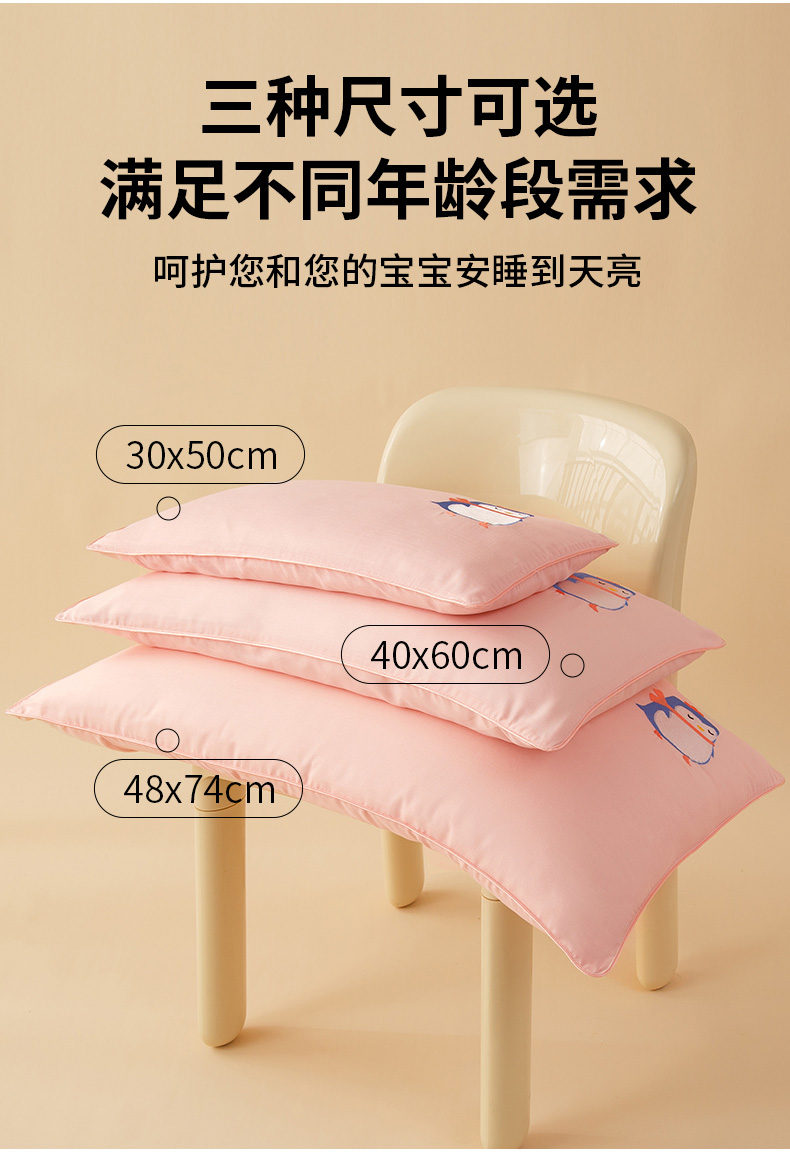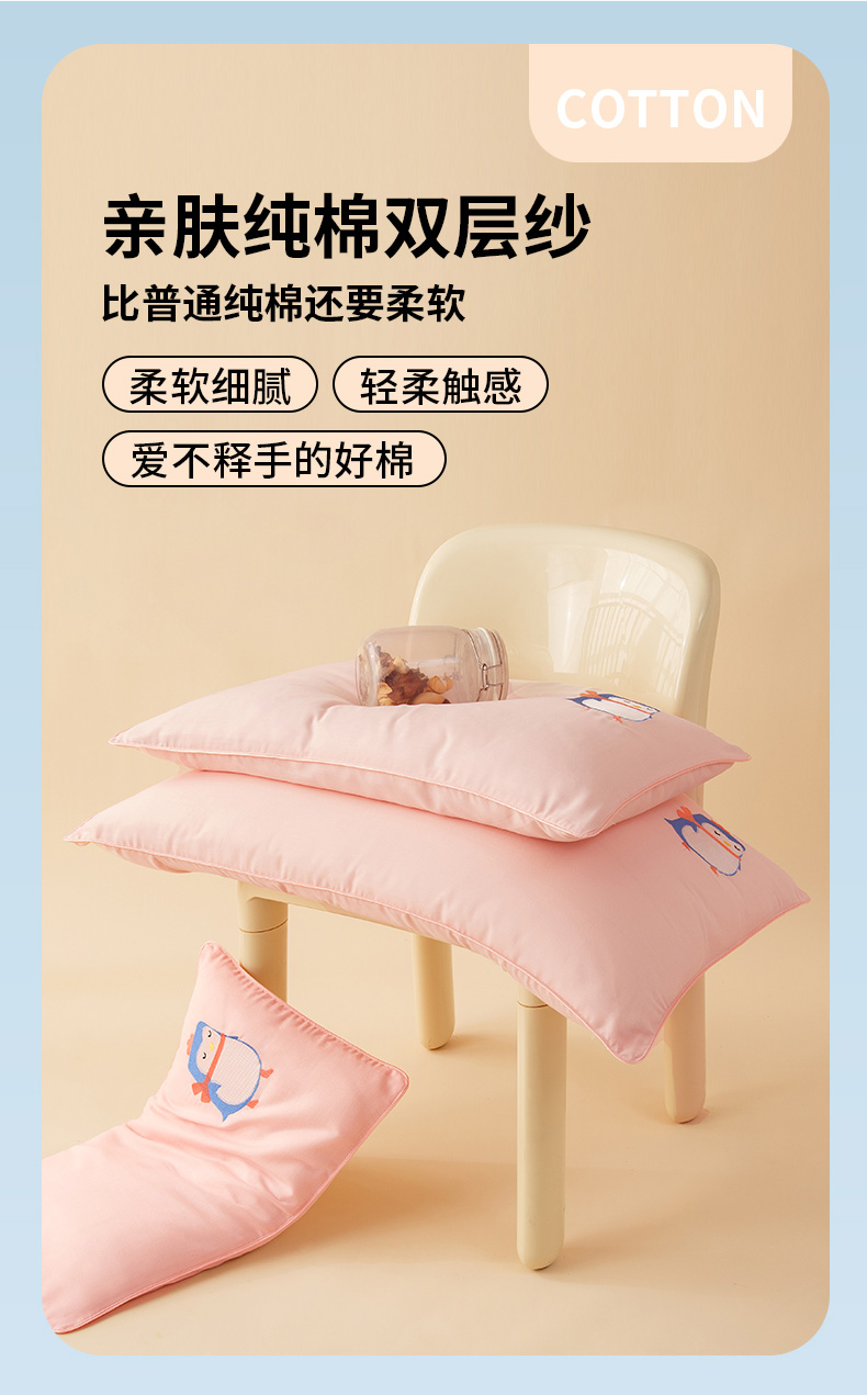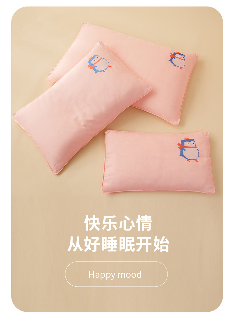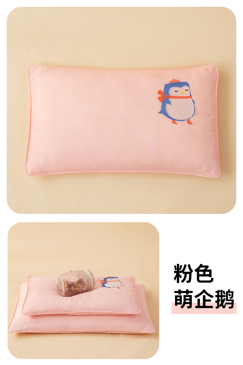 商品名称:喜多兔2025新款小轻柔纯棉双层纱枕套枕头 粉色萌企鹅
