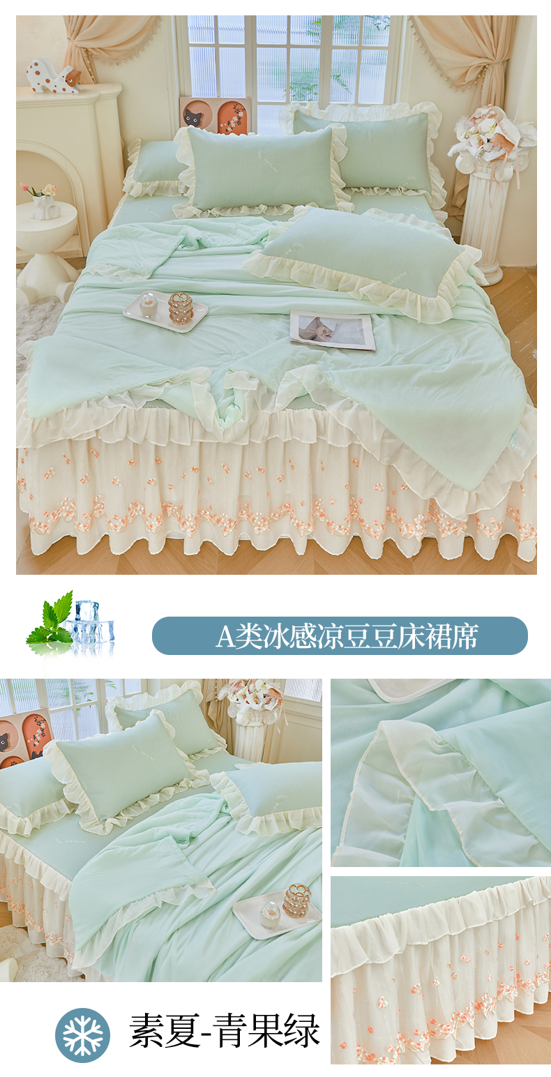 锦格2025年新款A类冰感凉豆豆床裙席夏被四件套 素夏-青果绿