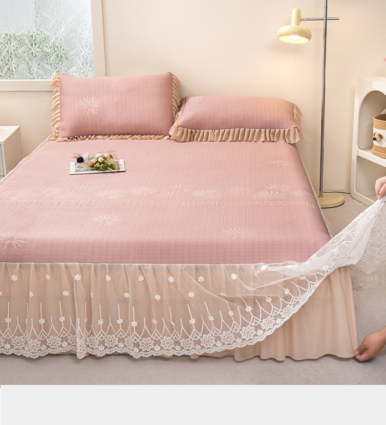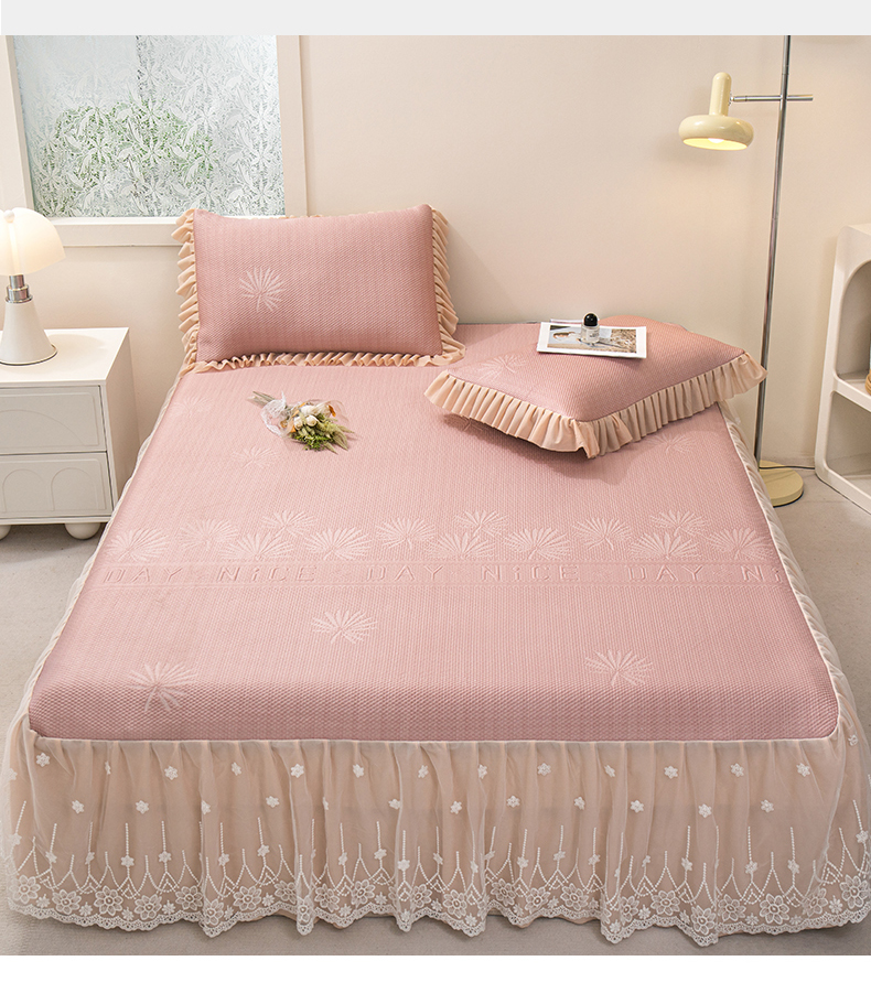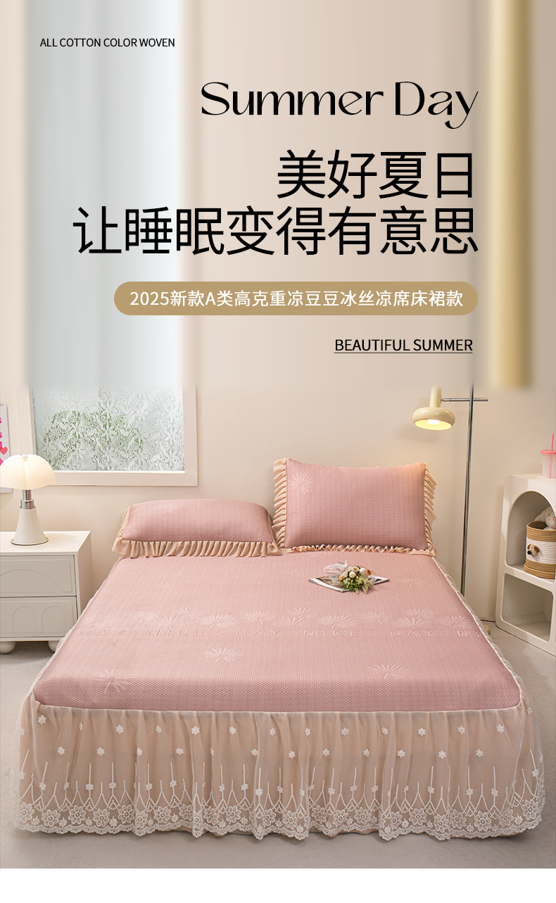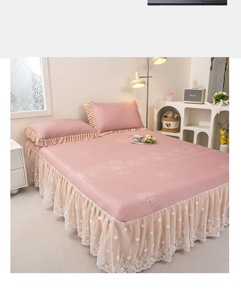 (总)美洲琳 2025新款650克凉豆豆凉席床裙三件套,湖蓝,浅灰,水绿,香槟,心粉