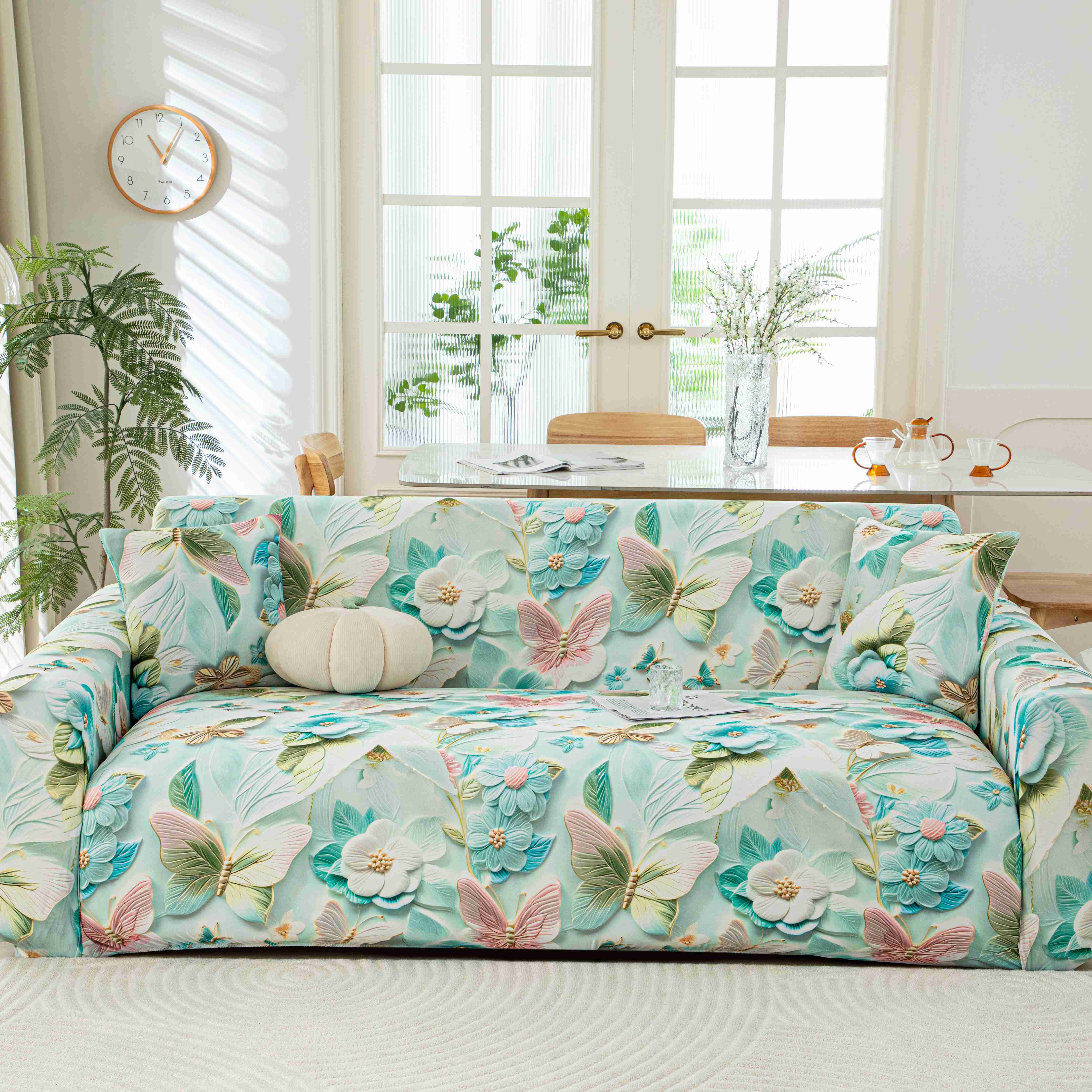(总)沐沐家纺 2026新款双人位臻品提花沙发套,孔雀蓝,米白,浅灰,浅紫,青色