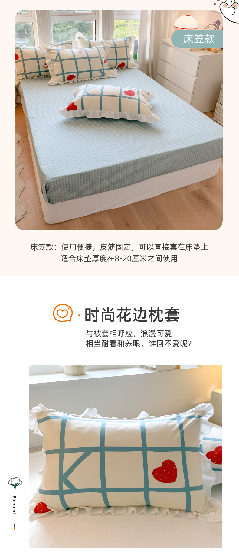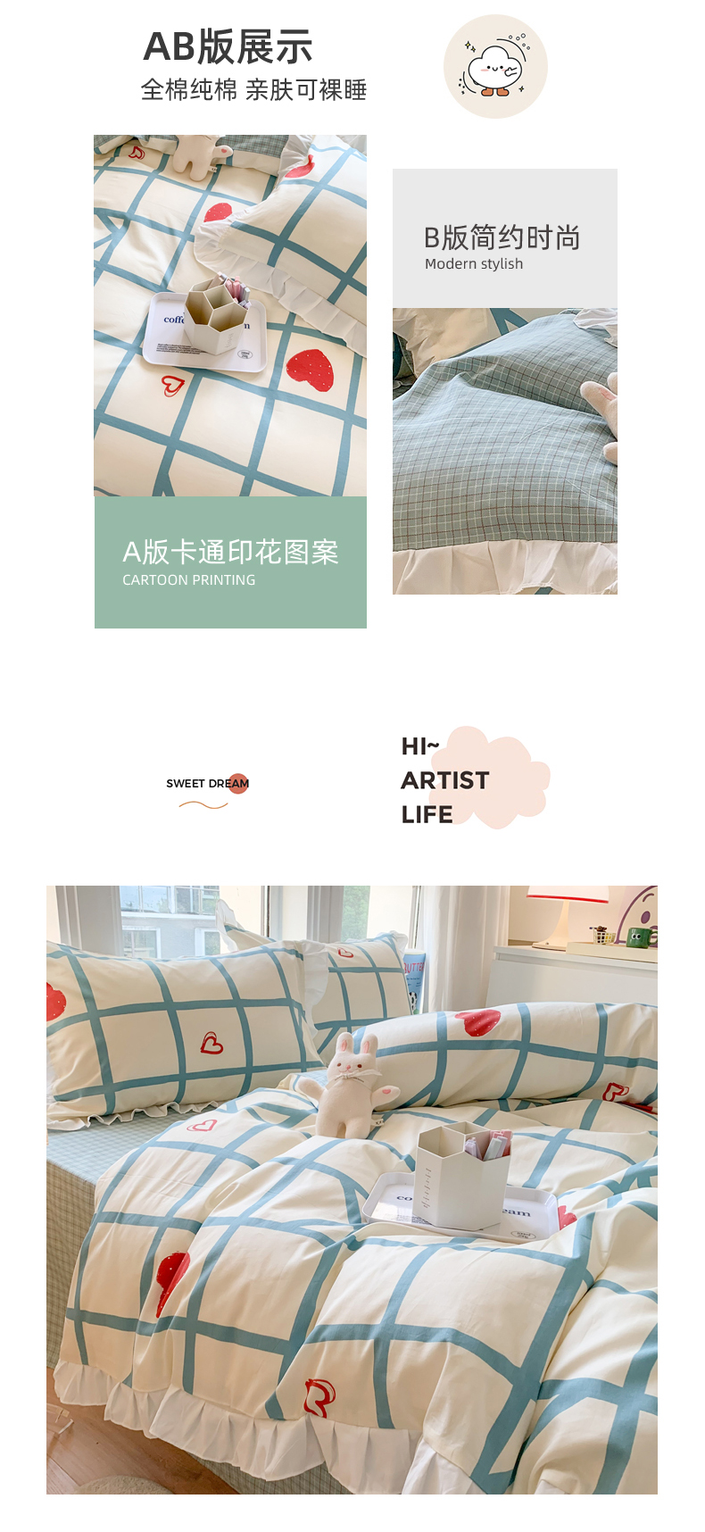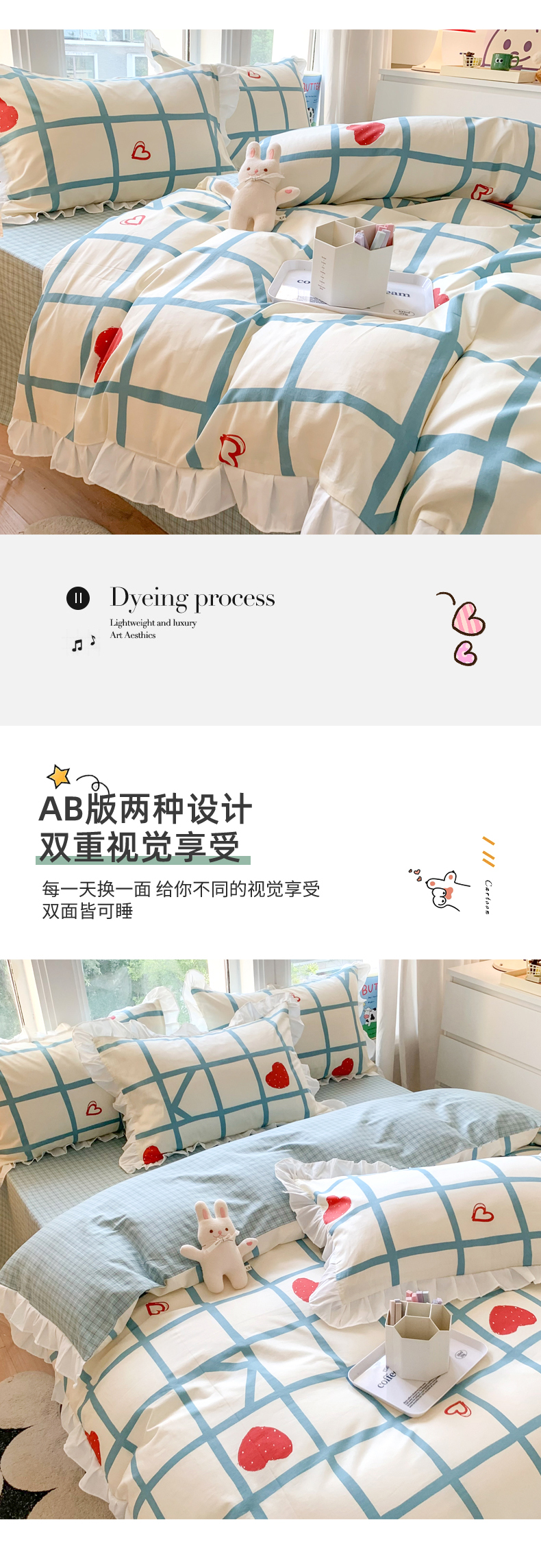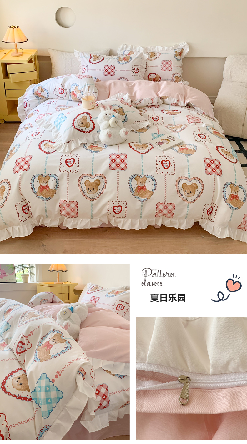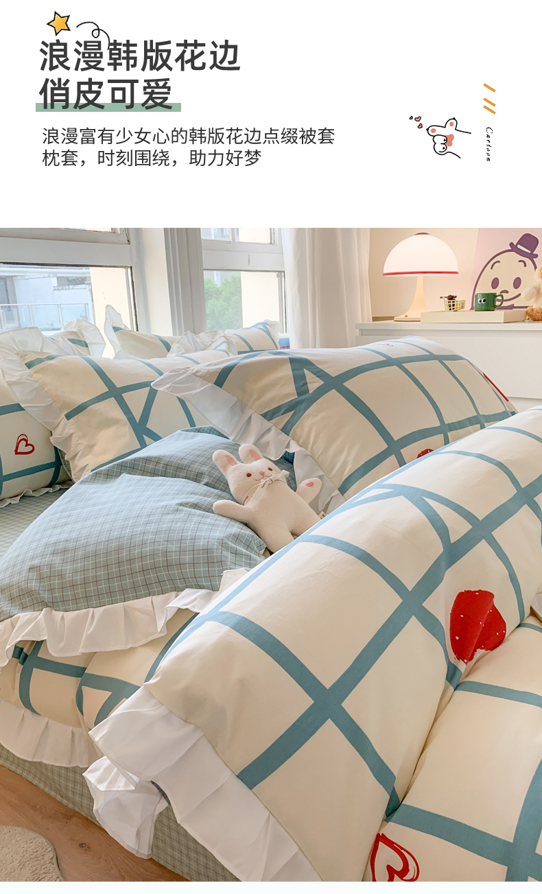 商品名称:玉元坊 2025春夏新款公主风全棉纯棉花边被套床单四件套 心心格