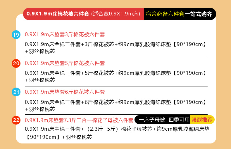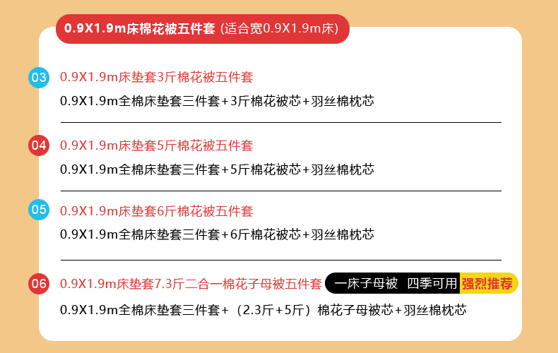 0.9X2.0m床垫套7.3斤羽丝棉子母被五件套 | ¥189.00 |