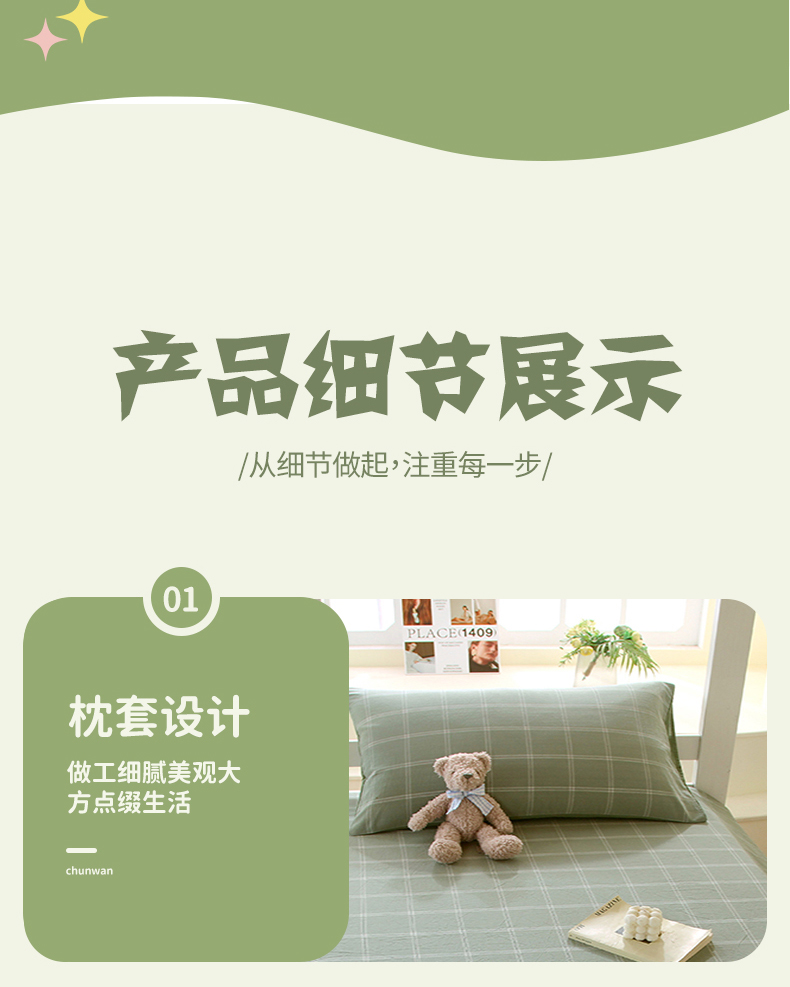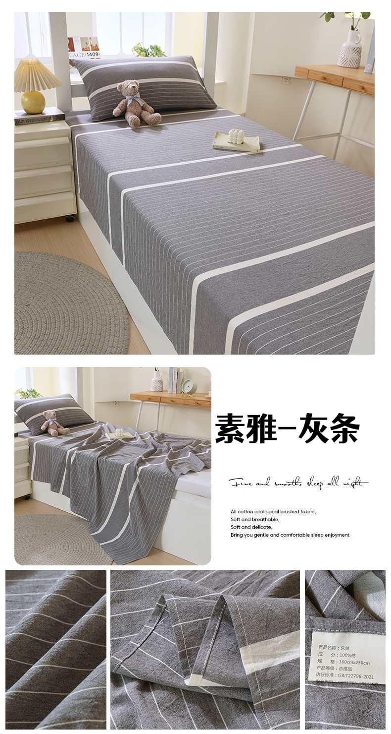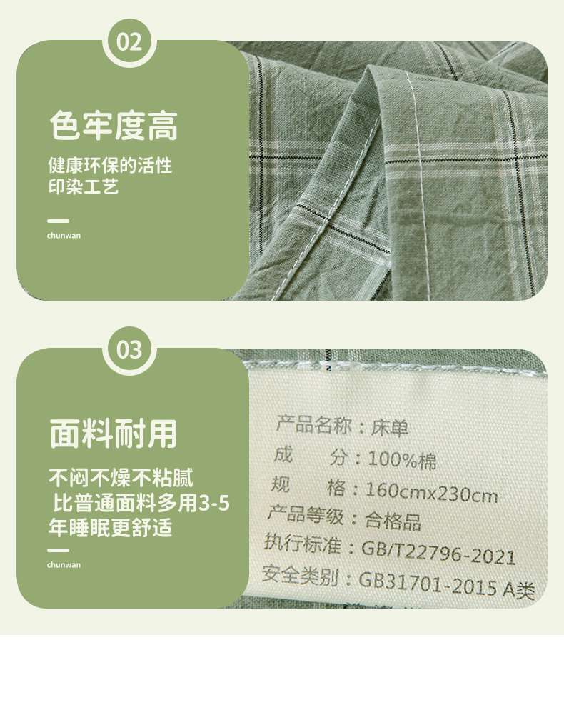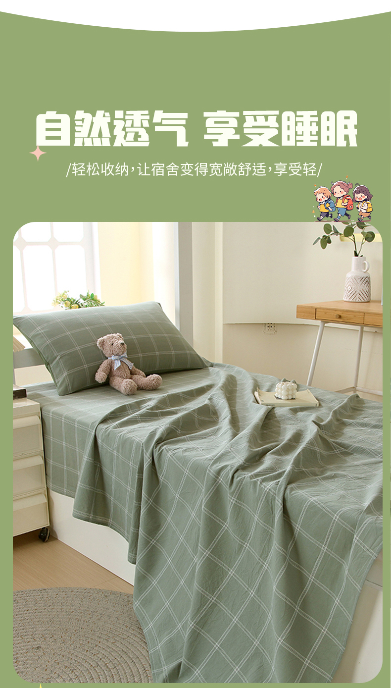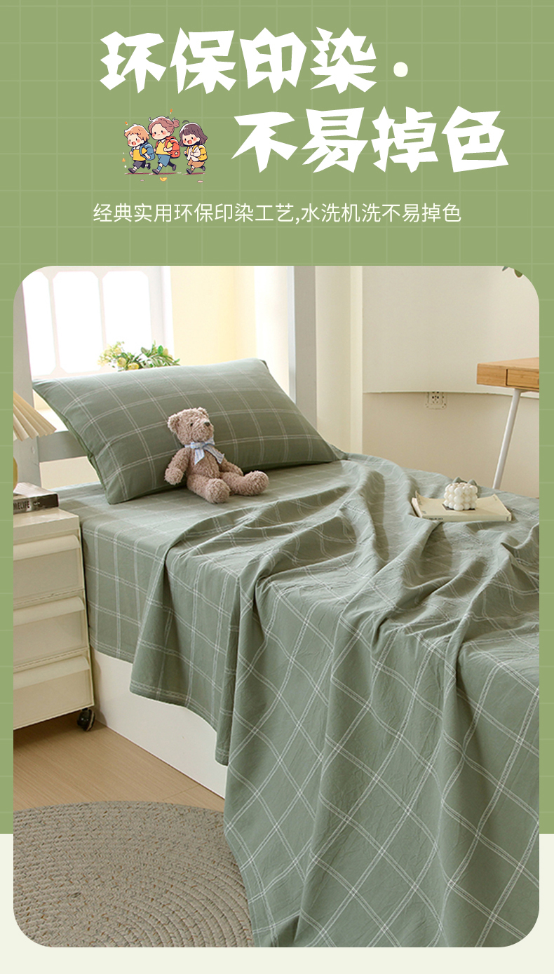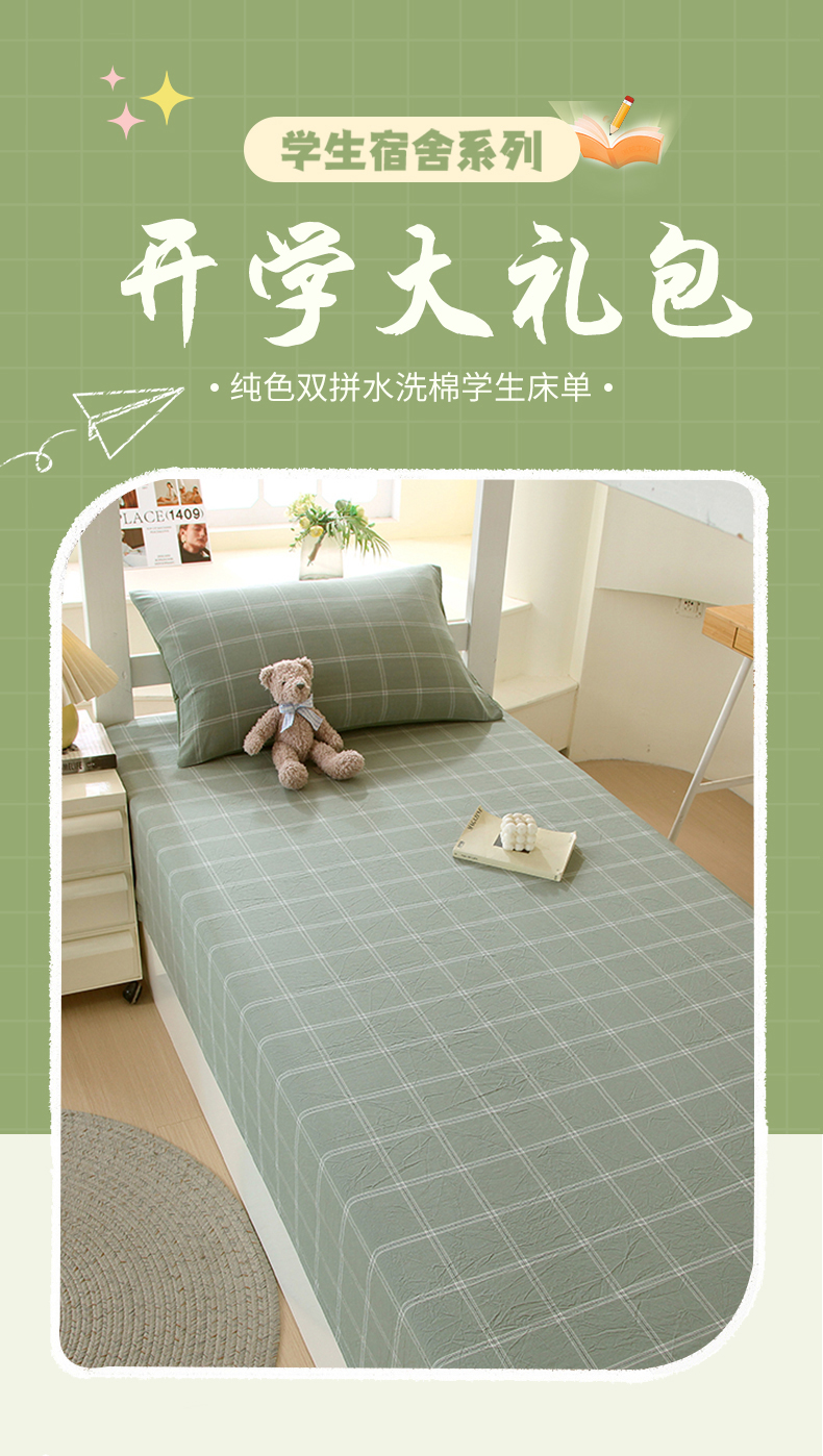 商品名称:春皖家纺 2025新款学生季全棉纯棉色织AB版水洗棉单品系列-单床单 床单单件 素雅-韵绿