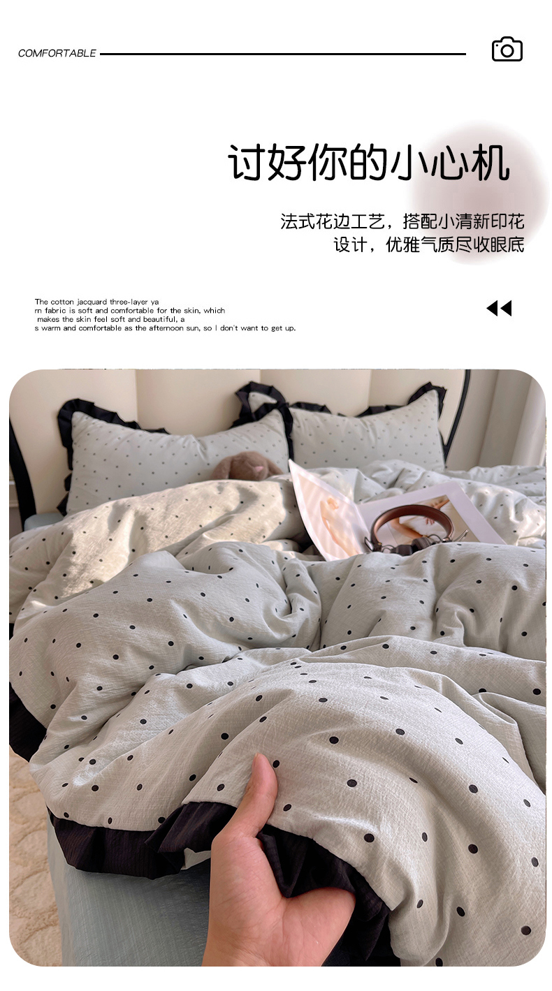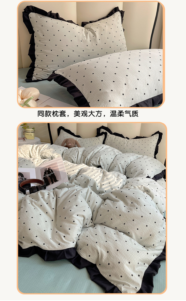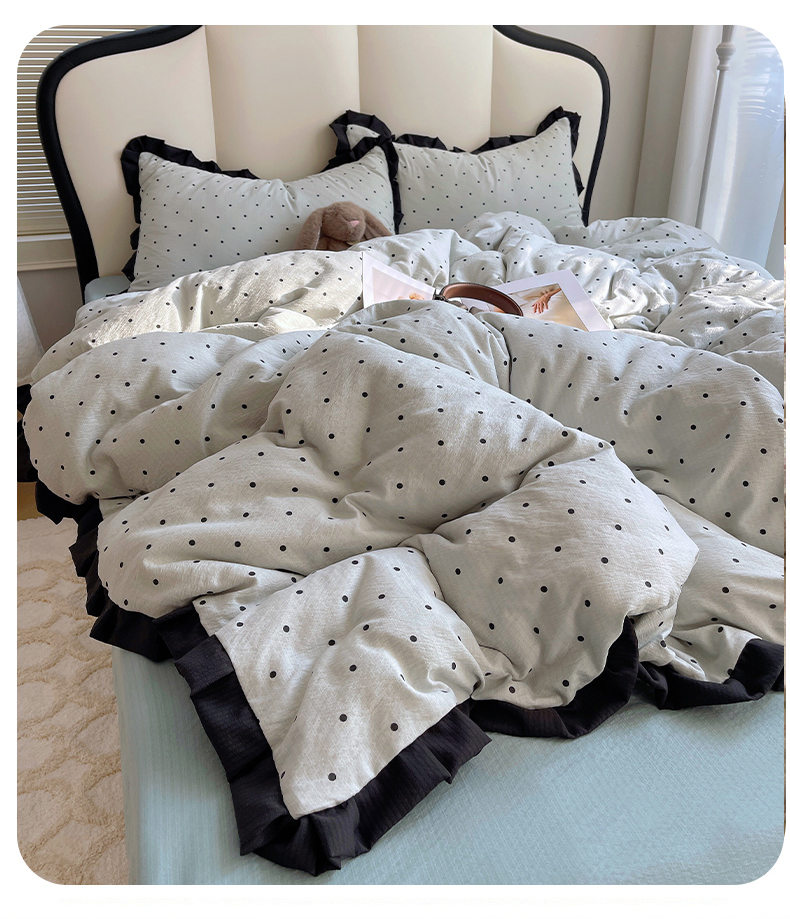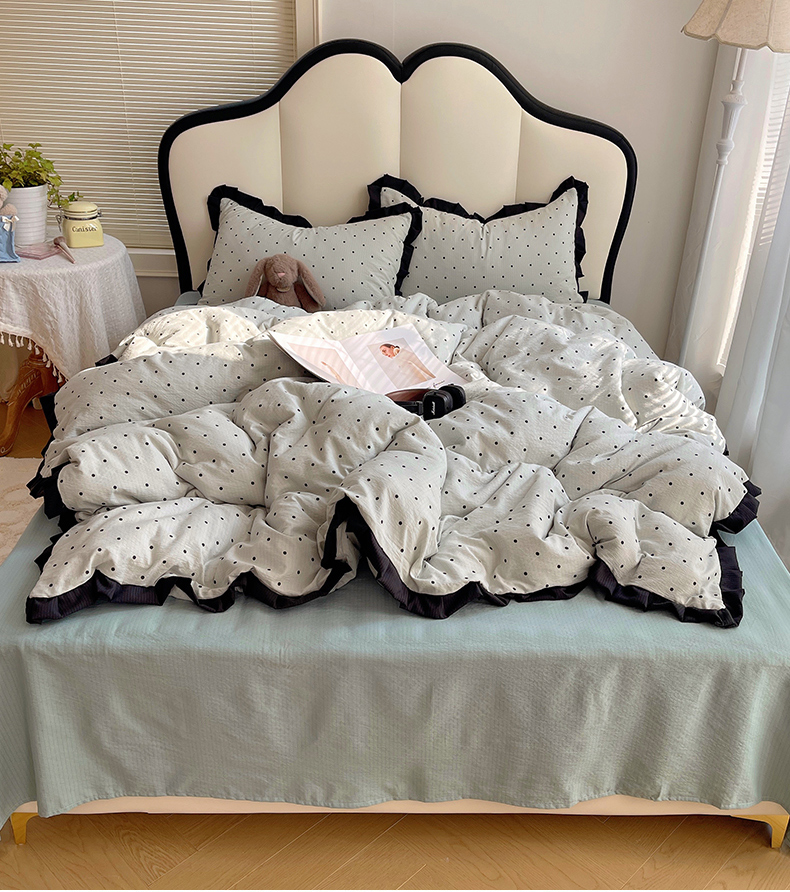当前位置: 91家纺网 > 商品网购 > 床品套件 > 四件套 > 其它四件套 > 韩巢家纺 2025新款黑皱皱双层纱花边款被套四件套直播热销款学生宿舍床单三件套-(提供卖家秀) 蓝灰波点【黑皱皱花边款】