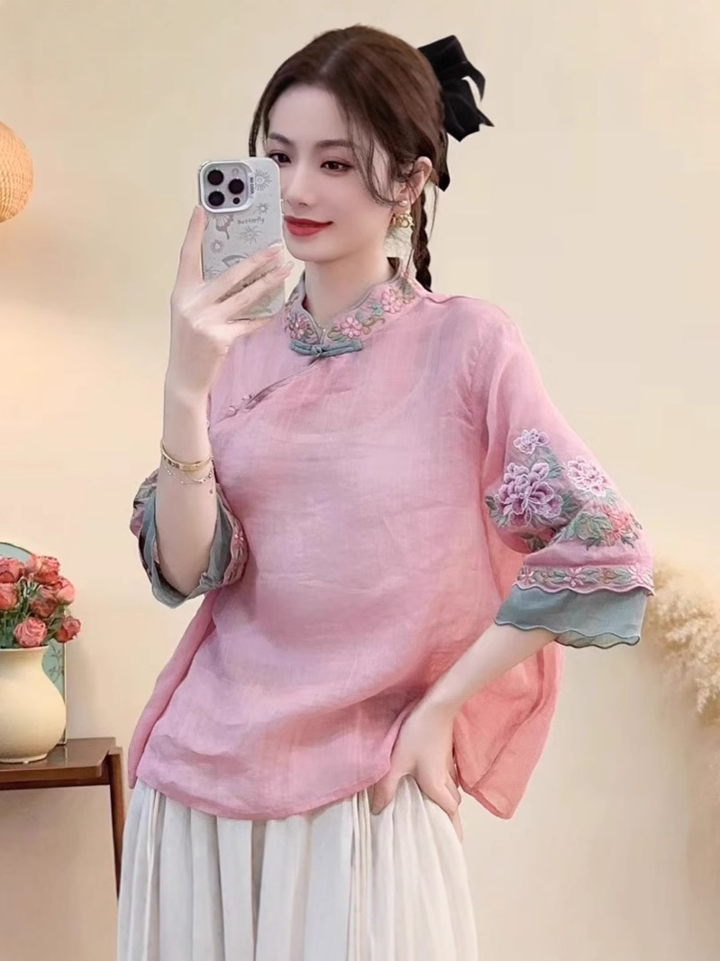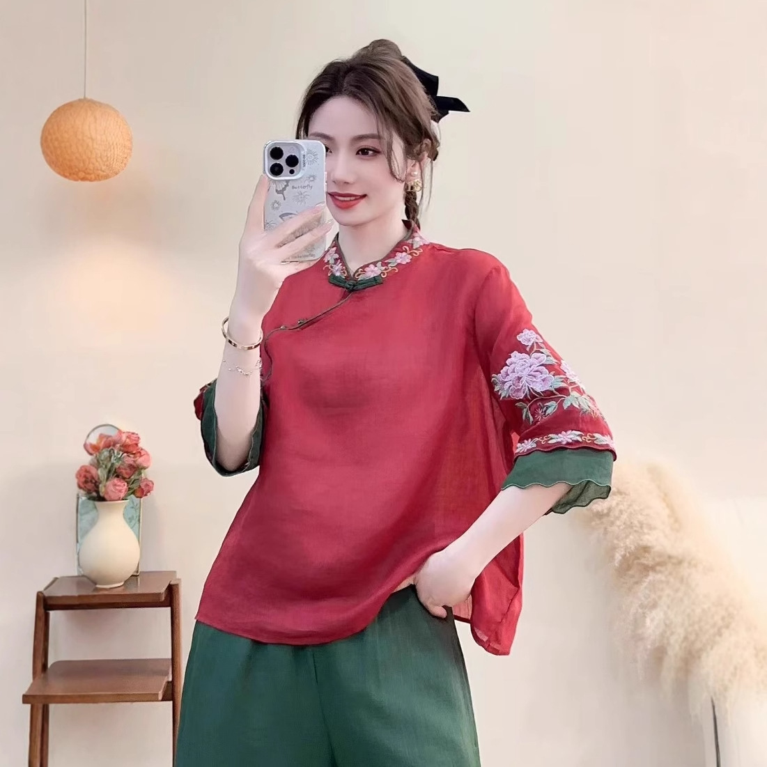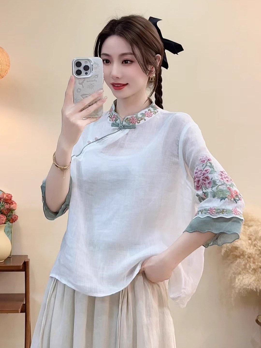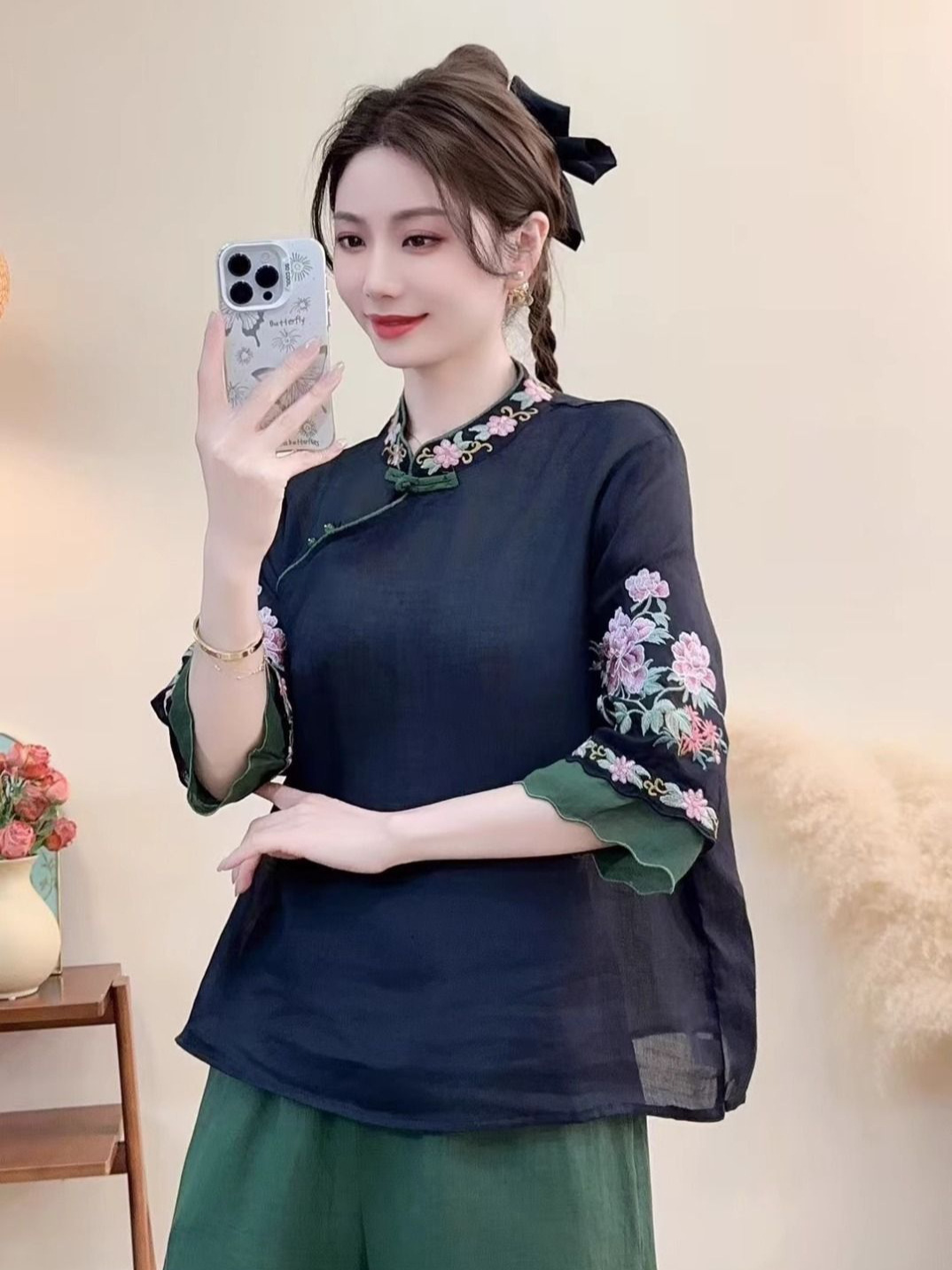 (总)洛兰沙家居馆【只代发】【只代发】 2025春夏新款复古立领斜襟盘扣七分袖T恤文艺刺绣苎麻显瘦上衣女