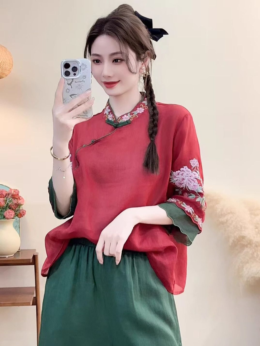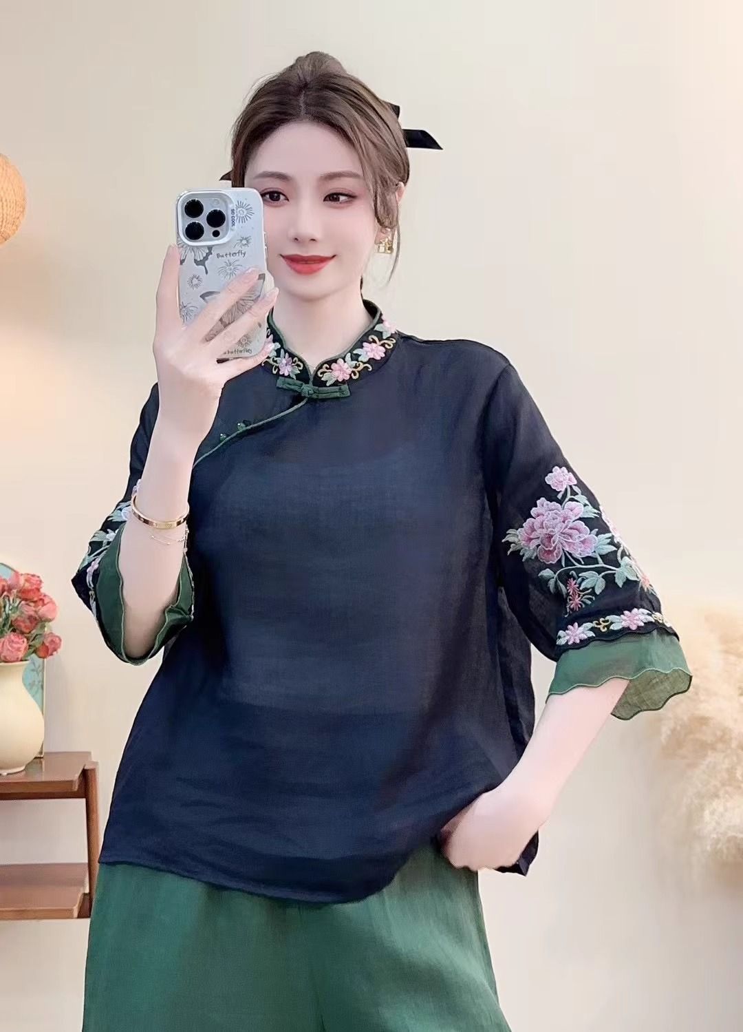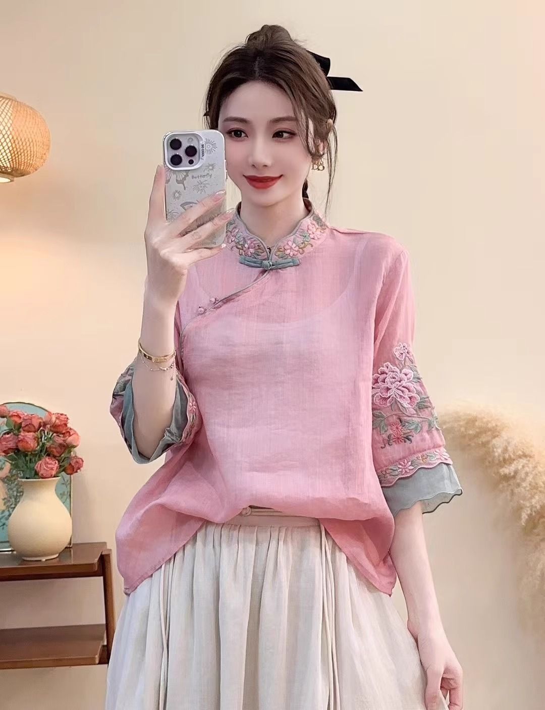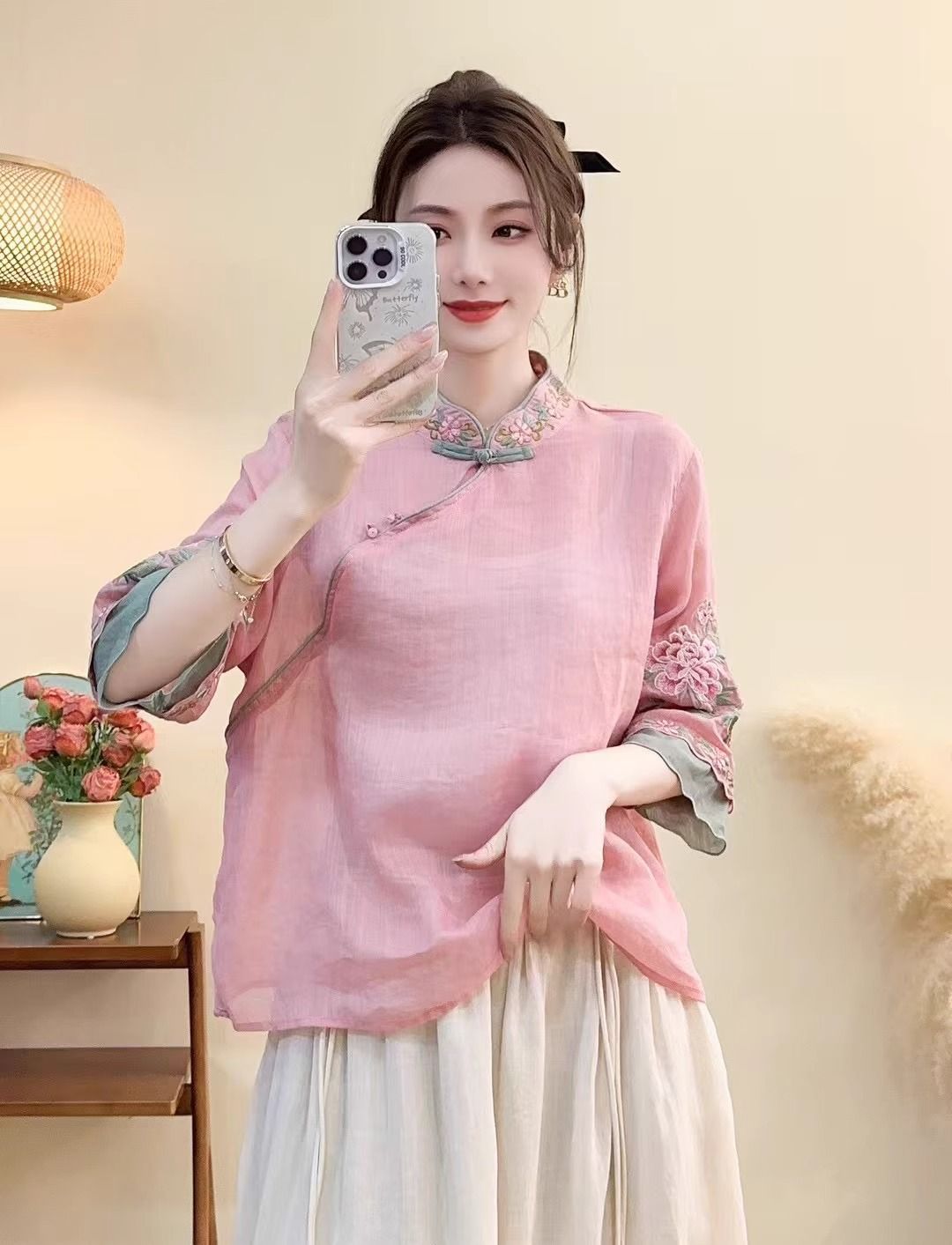 (总)洛兰沙家居馆【只代发】【只代发】 2025春夏新款复古立领斜襟盘扣七分袖T恤文艺刺绣苎麻显瘦上衣女