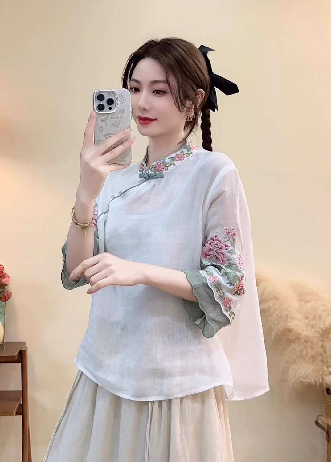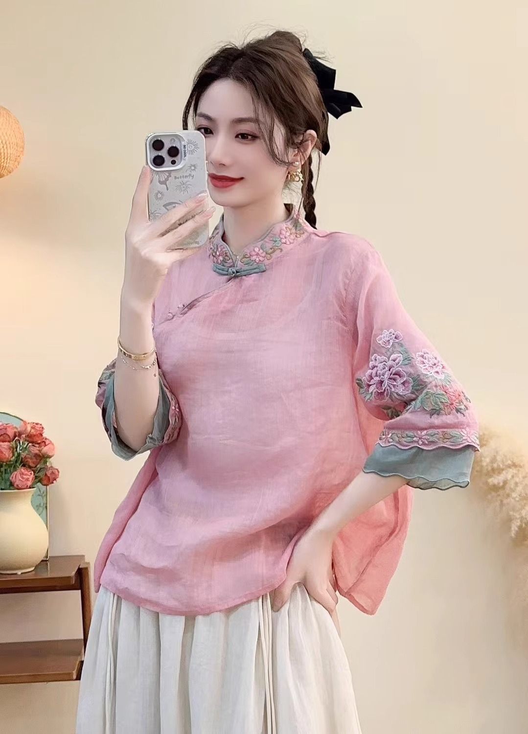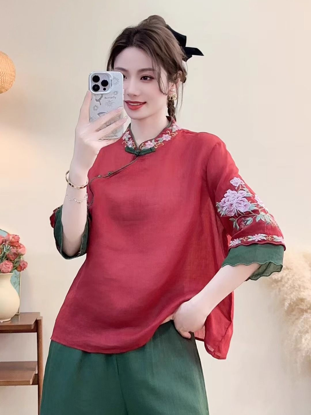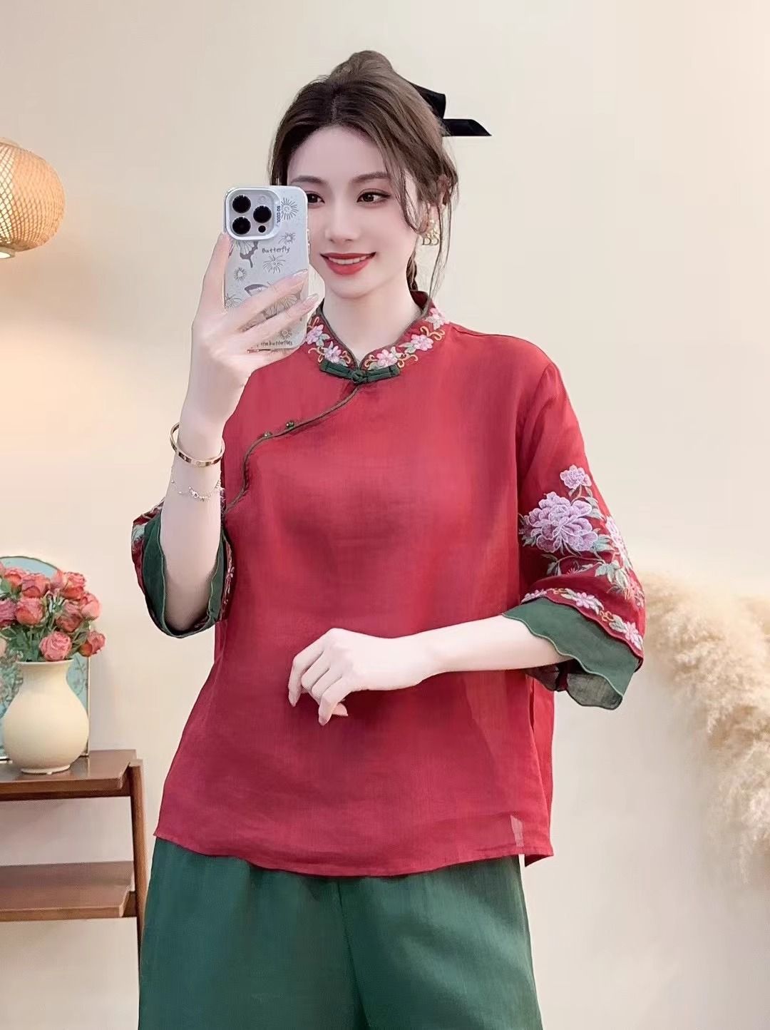 (总)洛兰沙家居馆【只代发】【只代发】 2025春夏新款复古立领斜襟盘扣七分袖T恤文艺刺绣苎麻显瘦上衣女