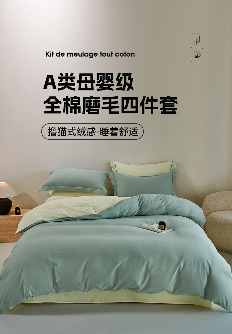 当前位置: 91家纺网 > 商品网购 > 床品套件 > 四件套 > 全棉普通四件套 > 憨豆家纺 2026新款全棉磨毛四件套正宗加厚长绒棉贡缎100%纯棉四件套(含买家秀)莫兰迪 莫兰迪-甘草绿拼奶昔黄