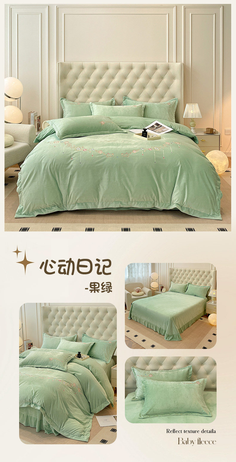 商品名称:艺玲家纺 2025新款婴儿绒高端绣花四件套 心动日记-果绿