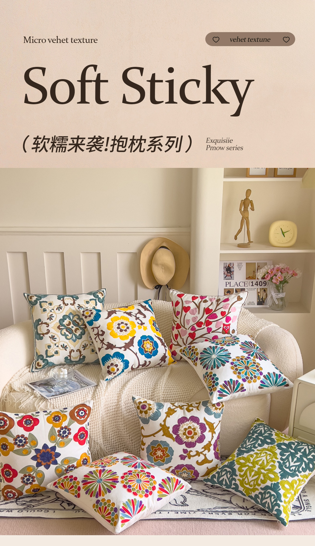 (总)诺可 2025新款全棉毛巾绣抱枕跨境花物语系列,组合,模特图,彩色石,蝶影,繁华拾光,粉蝴蝶,禾穗,花环,花卉-橙,花卉-粉,花雾,花盏,岚山,林礼,绿蝴蝶,蔓藤,木瑾花,南瓜,霓虹,柠檬叶,山奈,石榴蓝,石榴紫,树叶,禧朵,夏日铃兰,向阳花,星葵,叶坊,雨棠,枝瑾,紫蝴蝶,紫蕊,磨毛布单抱枕芯