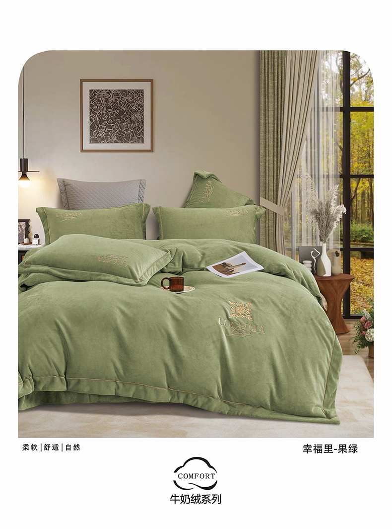 (总)绒博士 2025新款270克牛奶绒双拼角刺绣宽边款四件套--维也纳系列,维也纳-粉豆沙,维也纳-果绿,维也纳-浅咖,维也纳-浅蓝