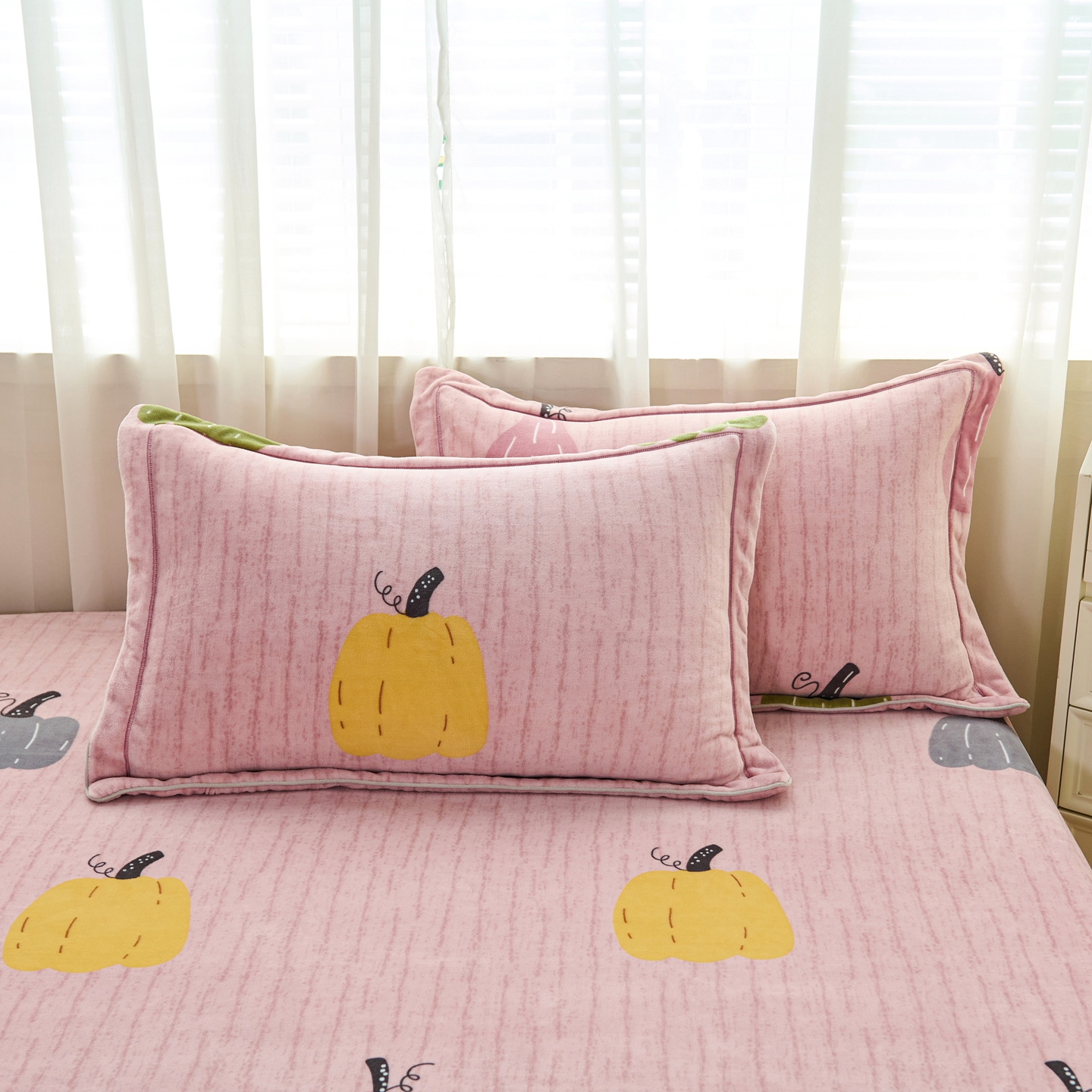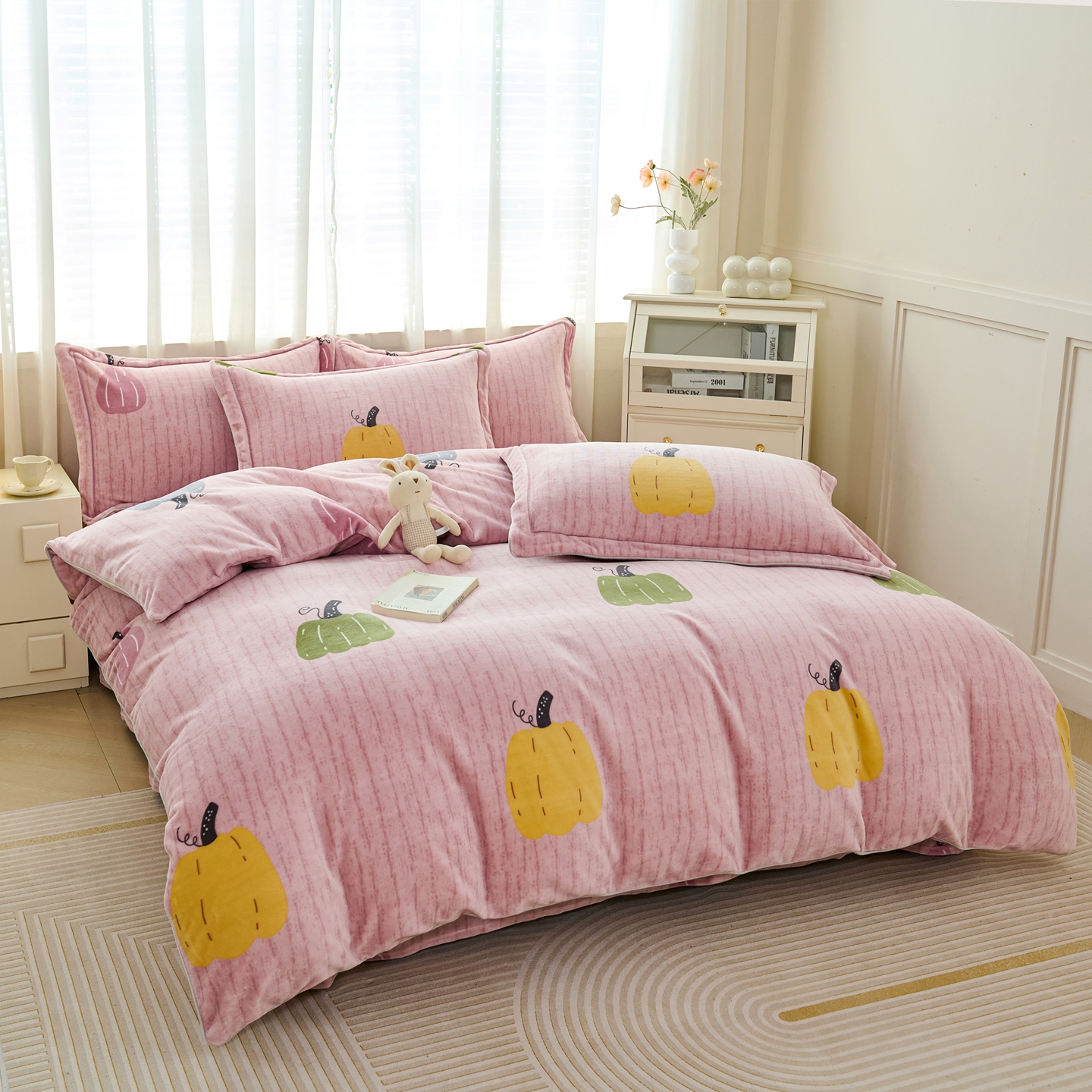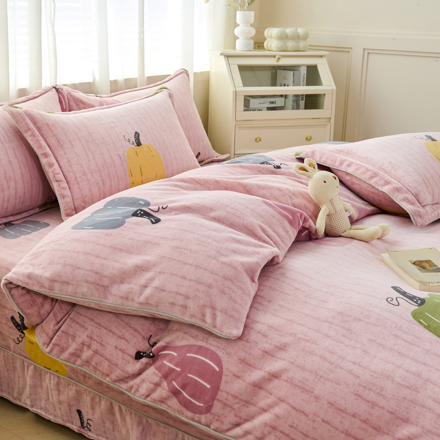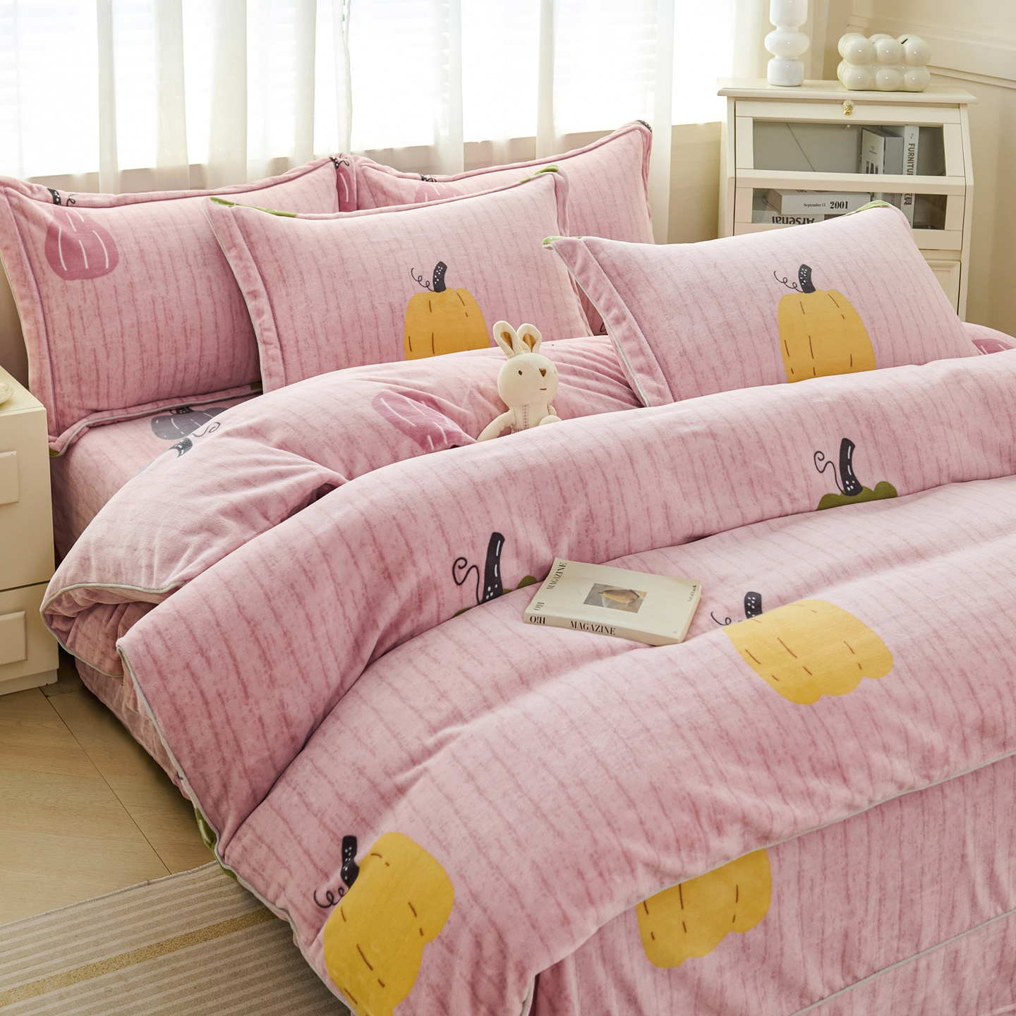 商品名称:尚品凤凰2025新款高克重印花牛奶绒四件套-工艺款 南瓜-粉