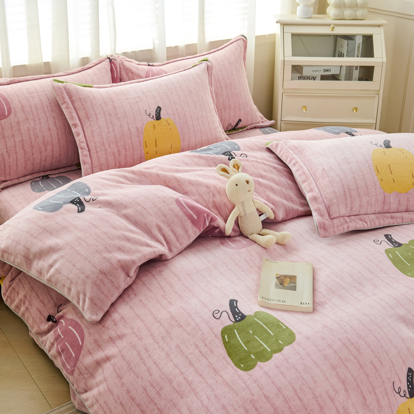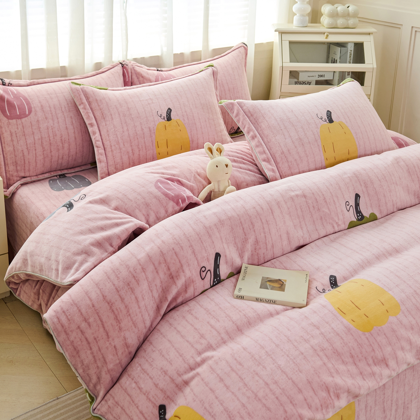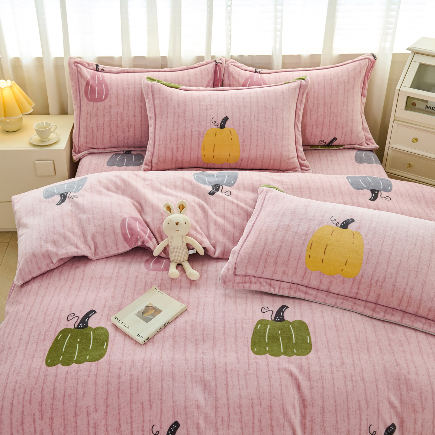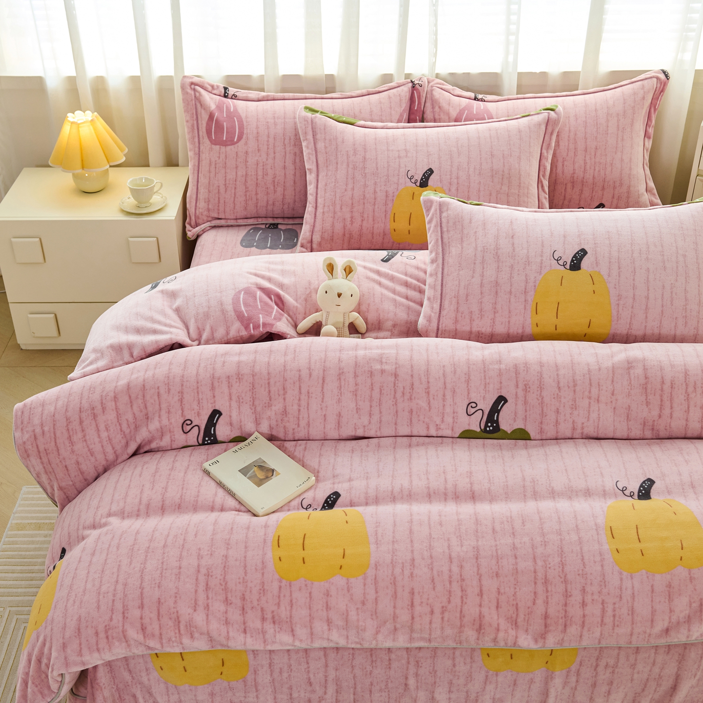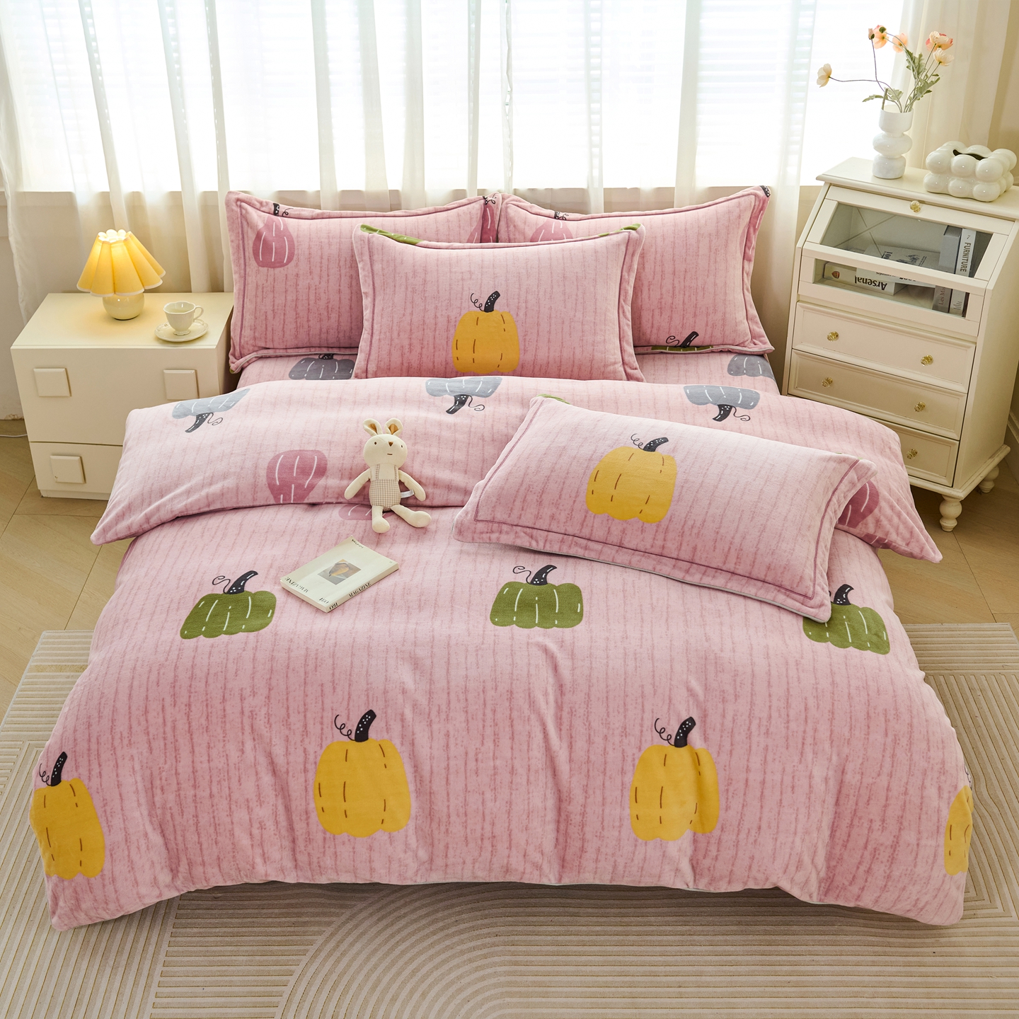 商品名称:尚品凤凰2025新款高克重印花牛奶绒四件套-工艺款 南瓜-粉