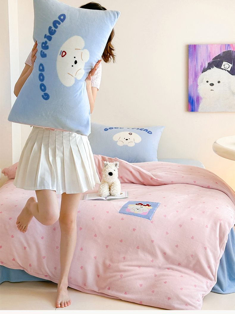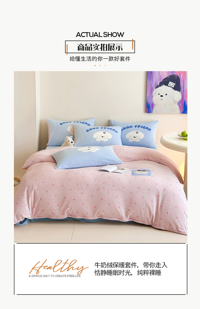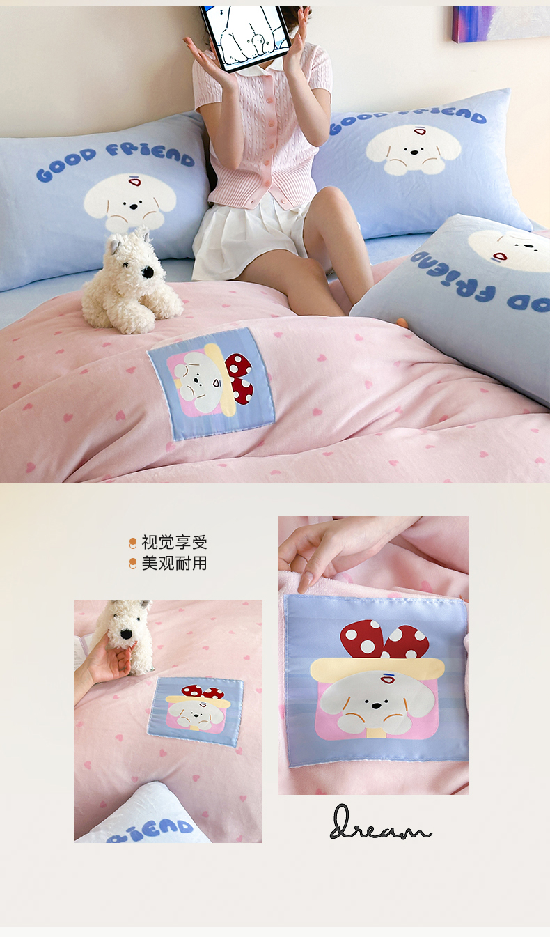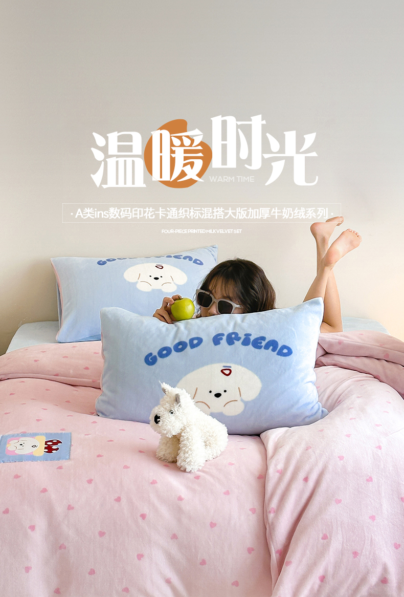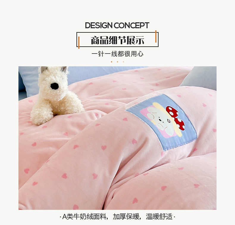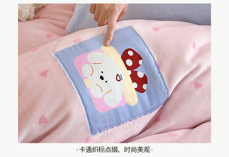 商品名称:桃子家居 2025新款A类ins数码印花卡通织标混搭大版加厚牛奶绒系列四件套 绒-织标甜心粉粉