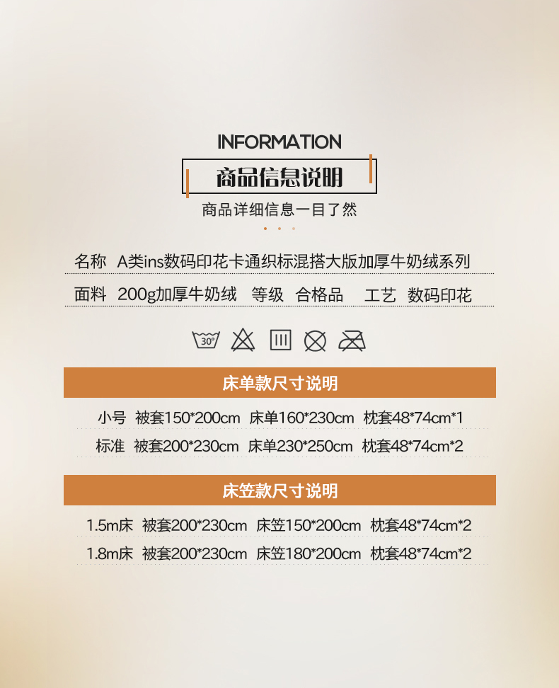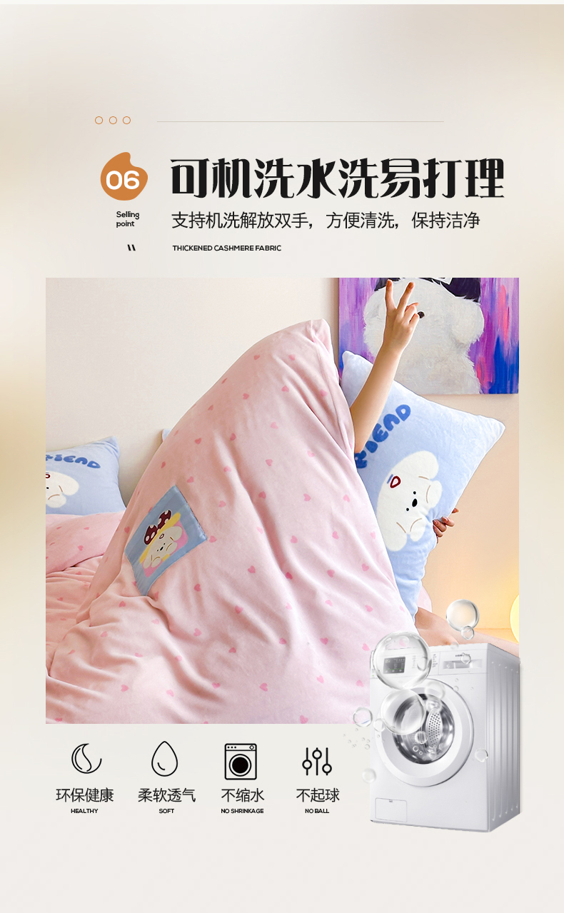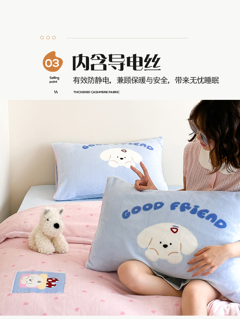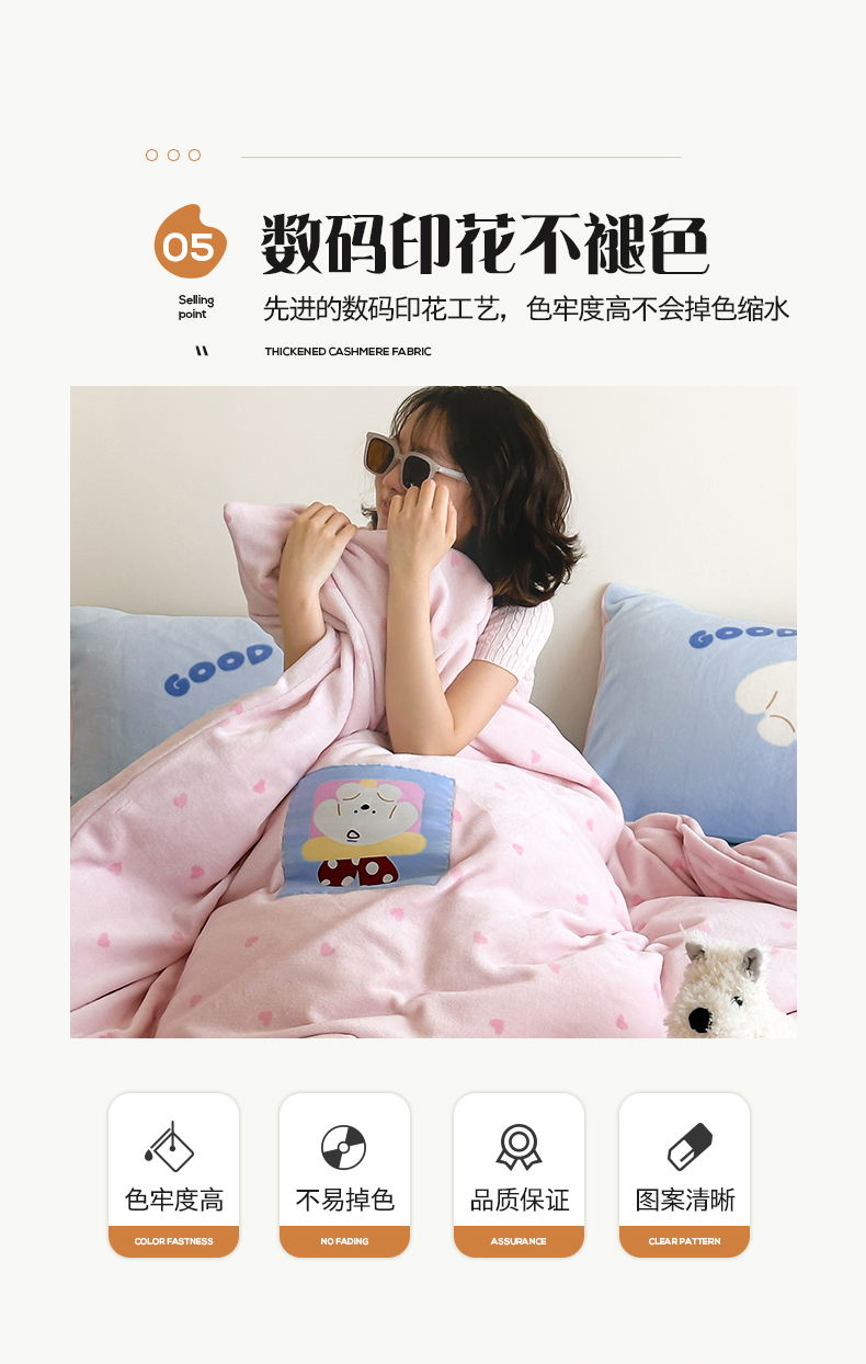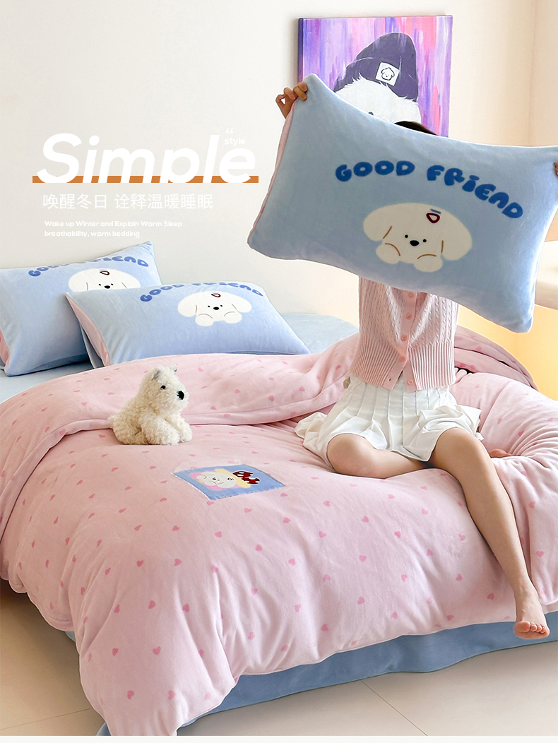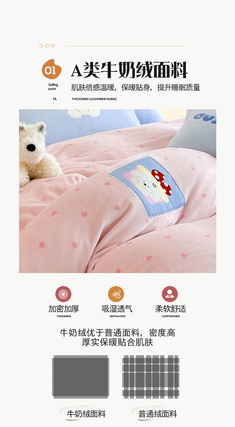 商品名称:桃子家居 2025新款A类ins数码印花卡通织标混搭大版加厚牛奶绒系列四件套 绒-织标甜心粉粉