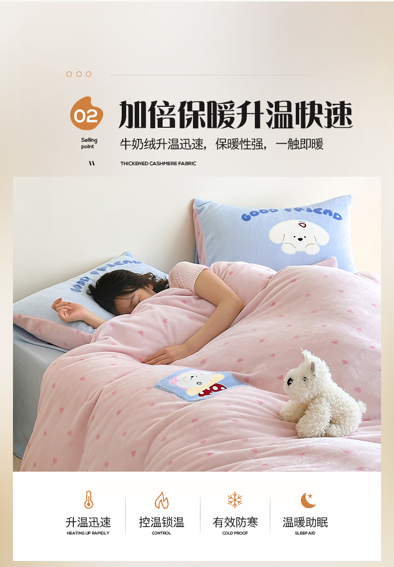 桃子家居 2025新款A类ins数码印花卡通织标混搭大版加厚牛奶绒系列四件套 绒-织标甜心粉粉