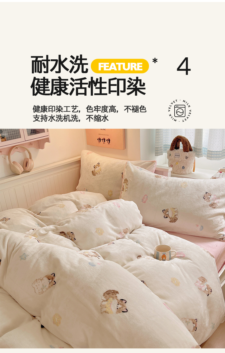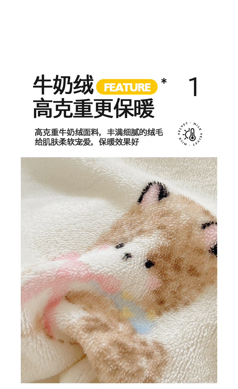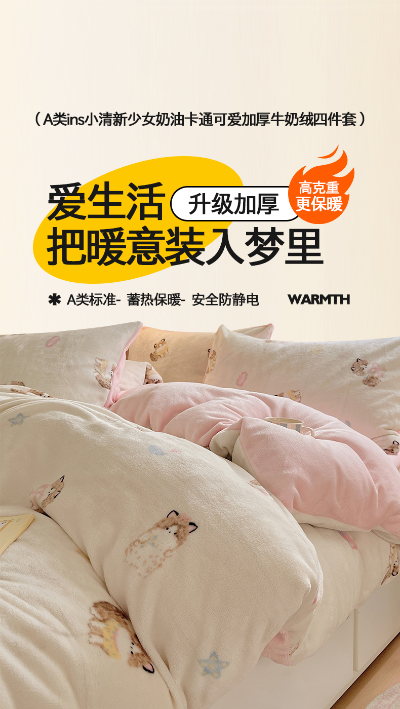 商品名称:金爱家 2025新款A类ins小清新少女奶油卡通可爱加厚牛奶绒四件套 绒-奶粉喵