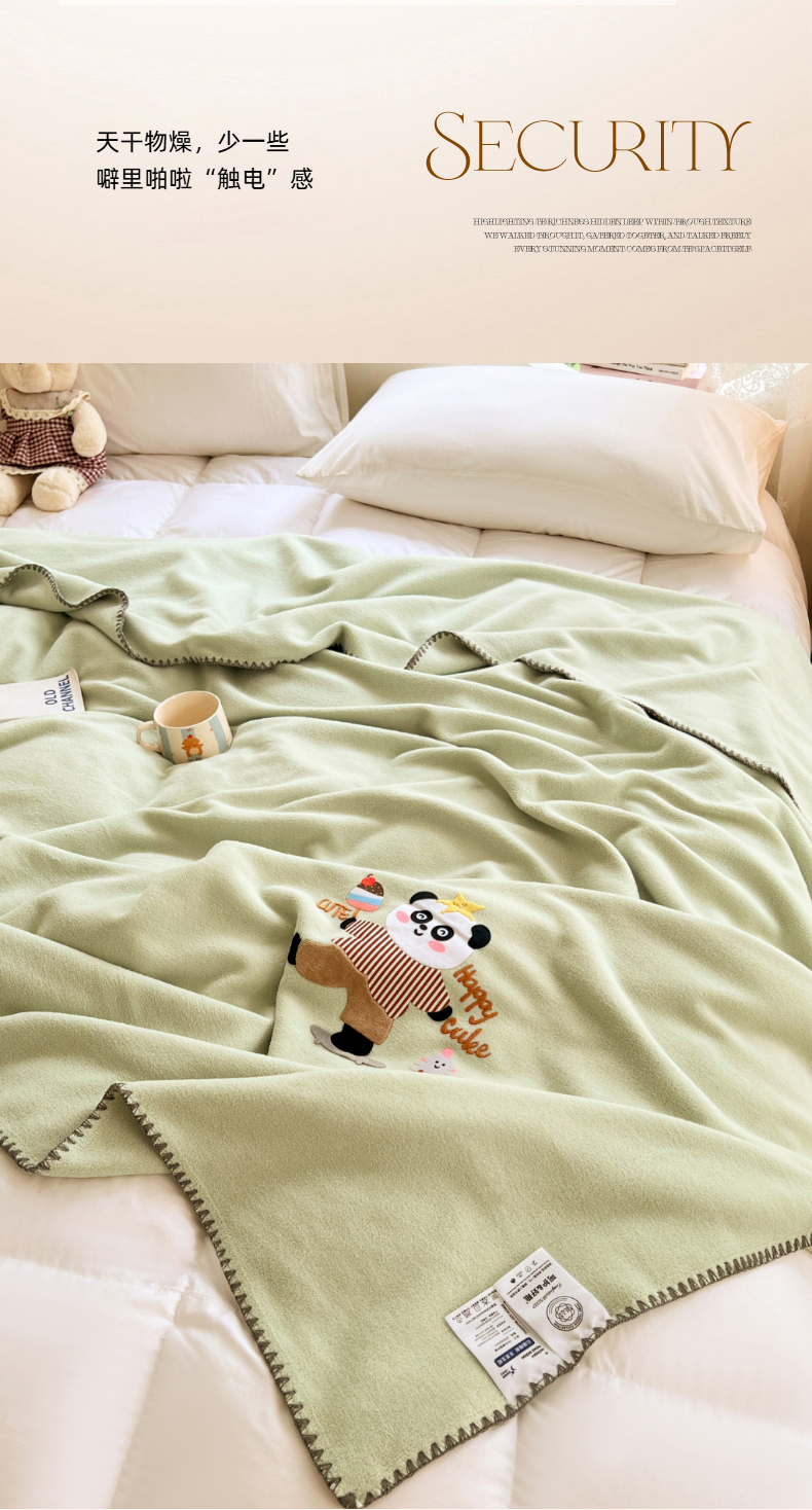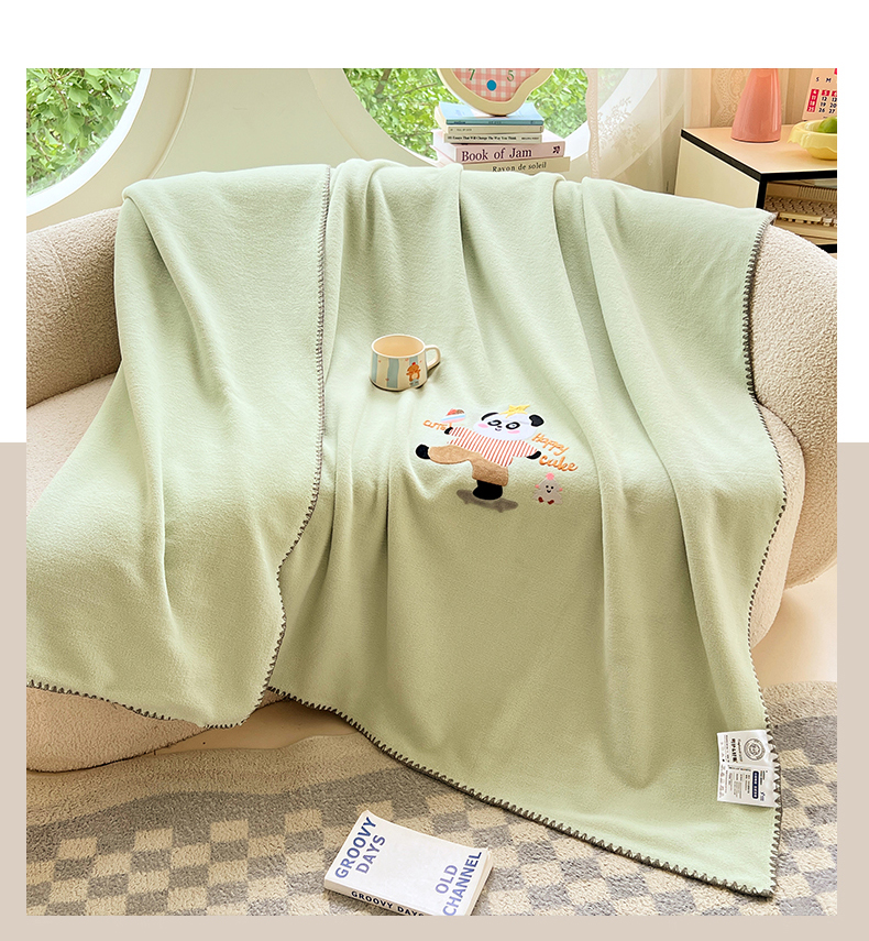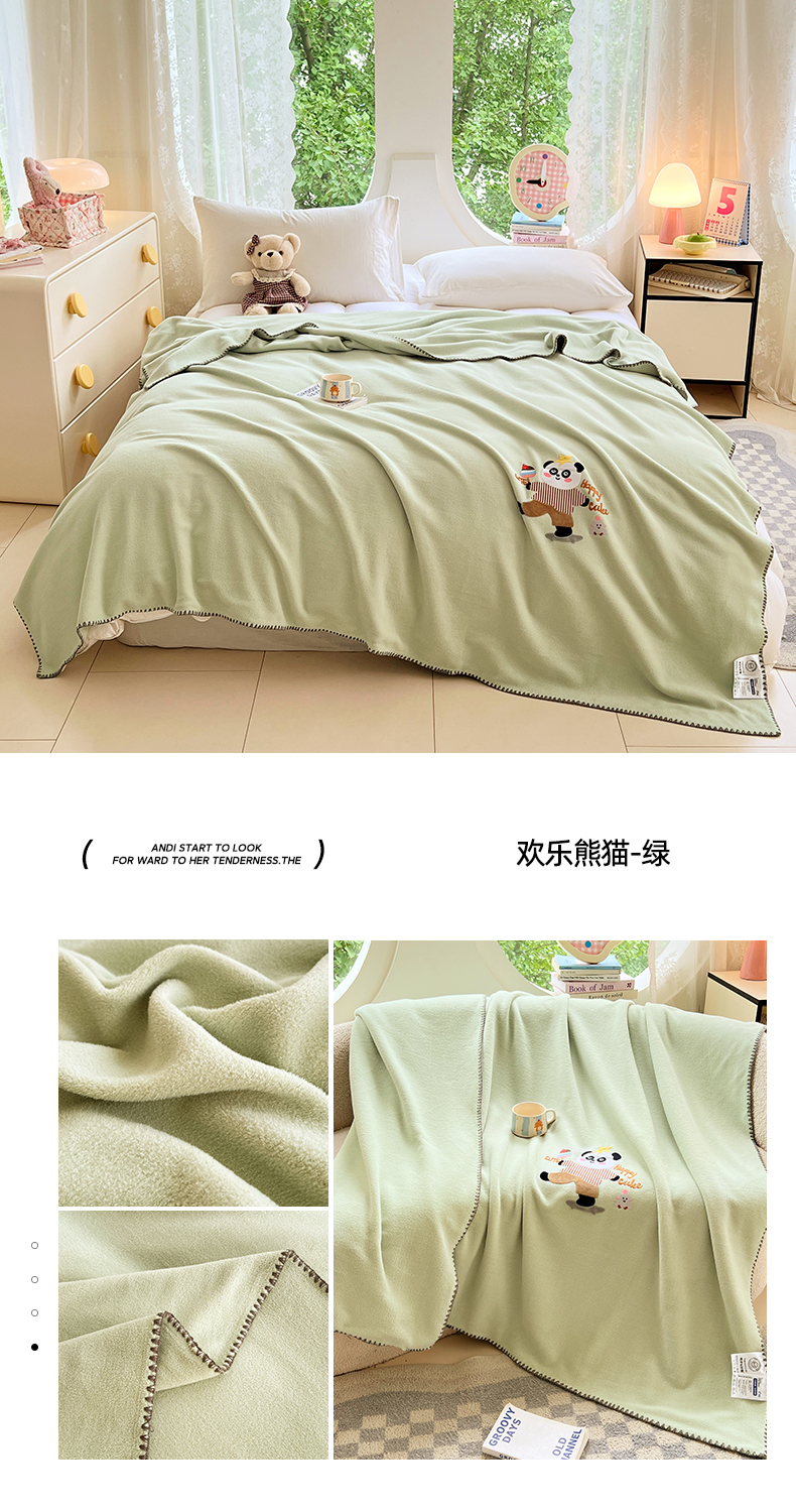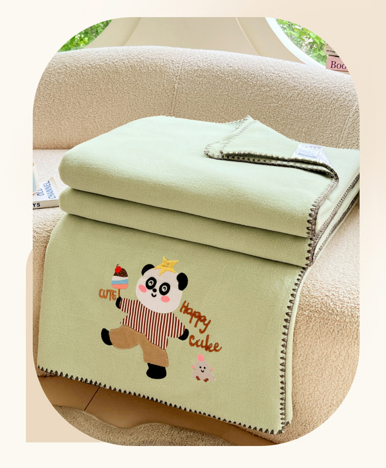 凯轩毛毯网销专供 2025新款仿羊绒贴布绣毛毯毯子 欢乐熊猫-绿