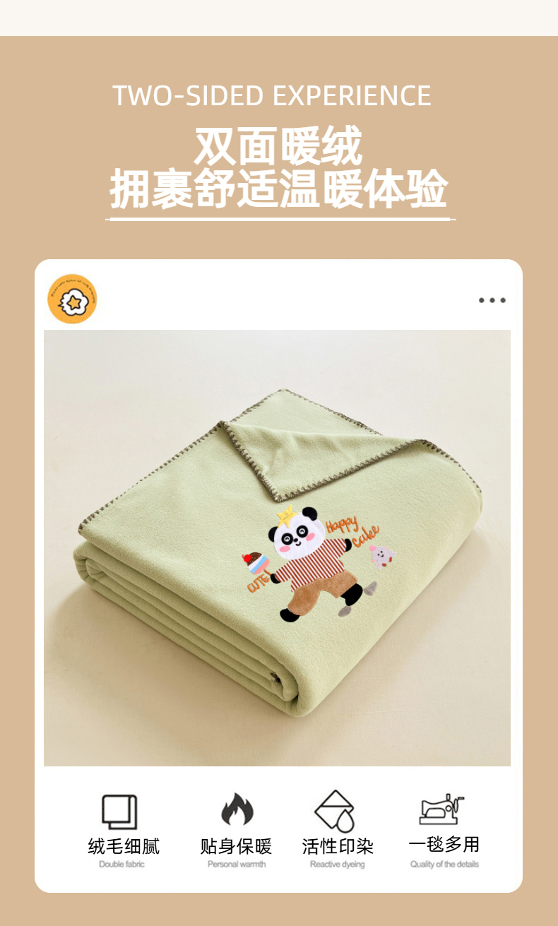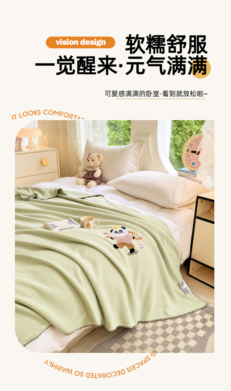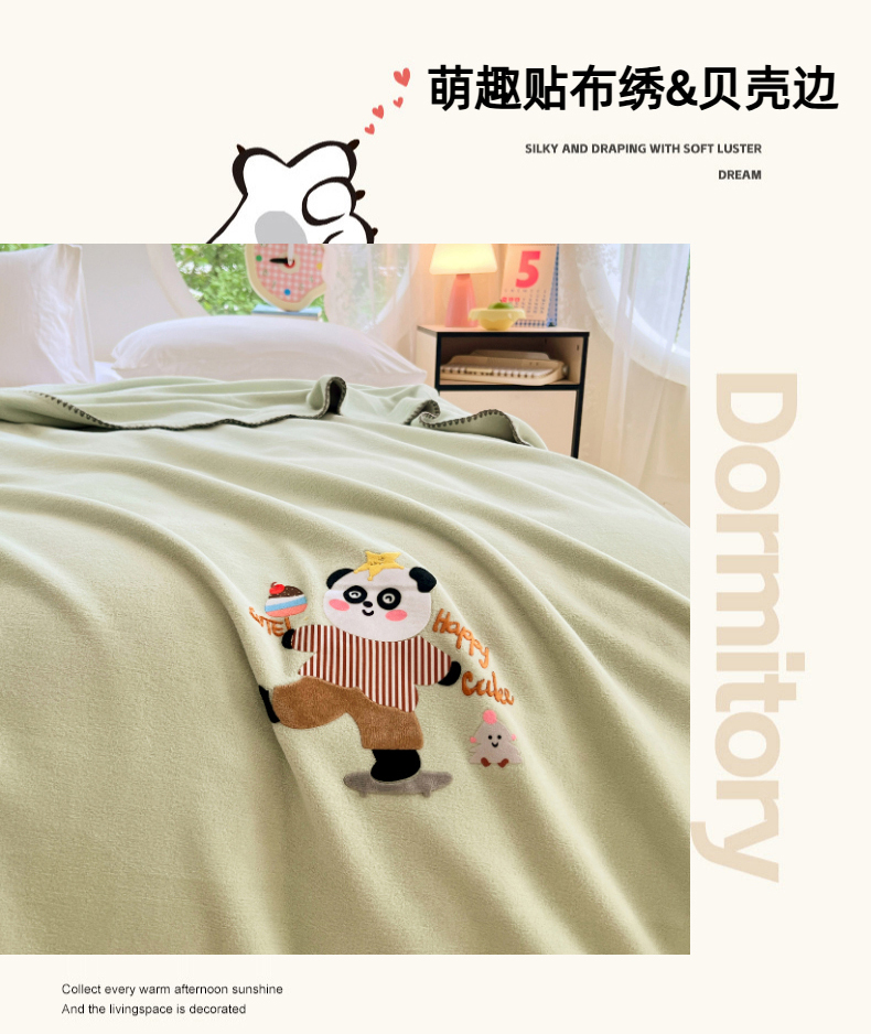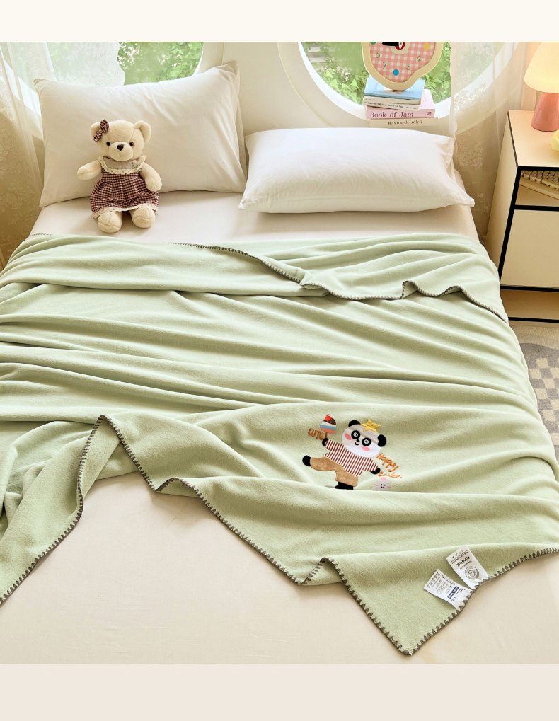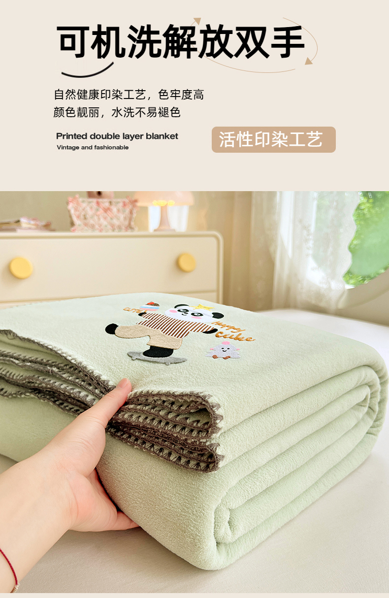 凯轩毛毯网销专供 2025新款仿羊绒贴布绣毛毯毯子 欢乐熊猫-绿