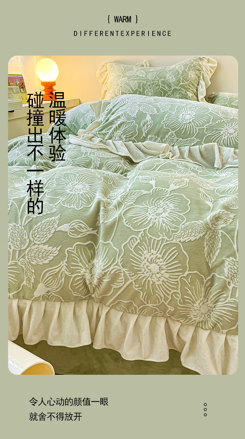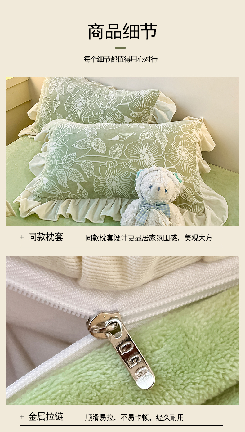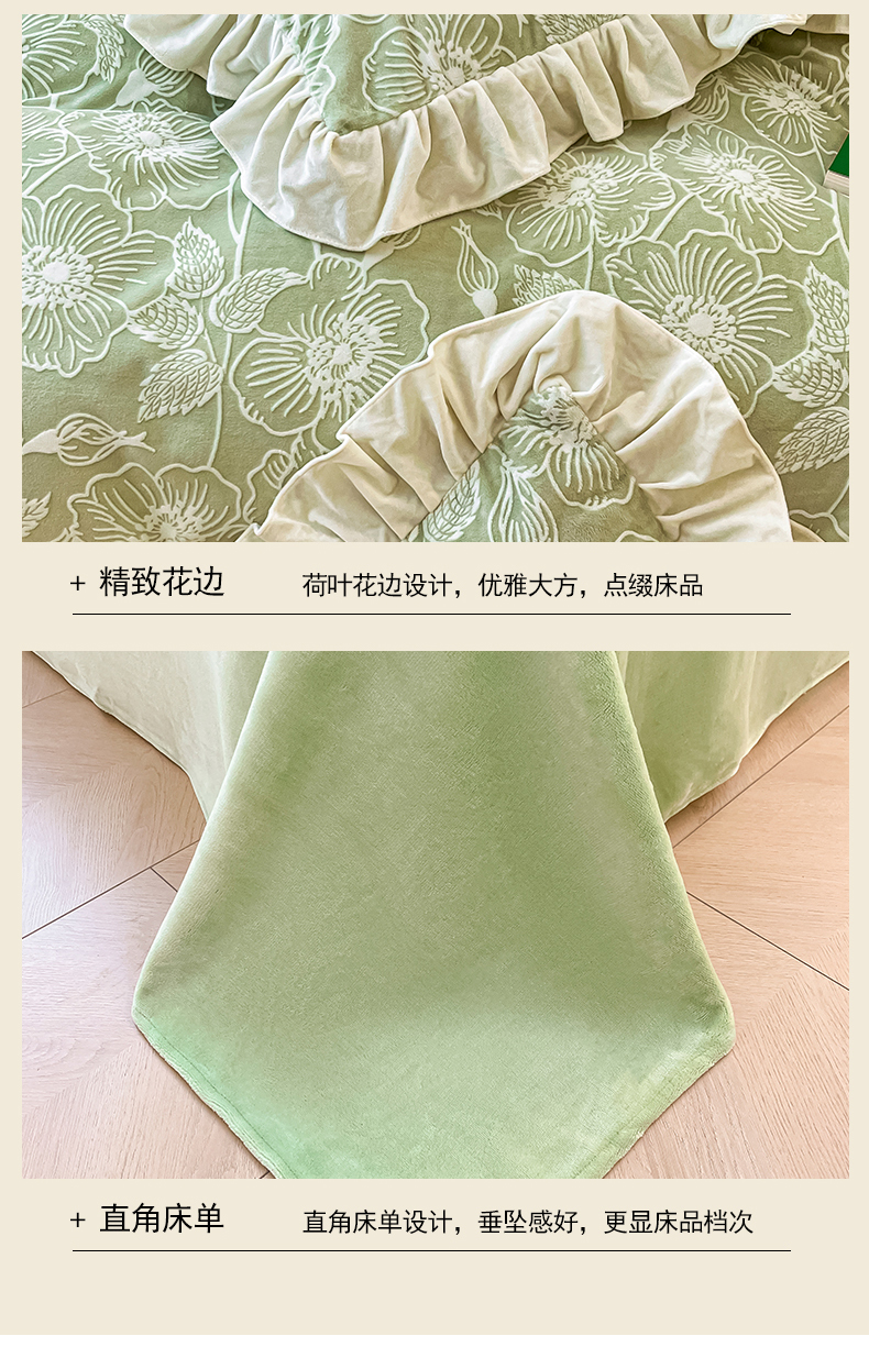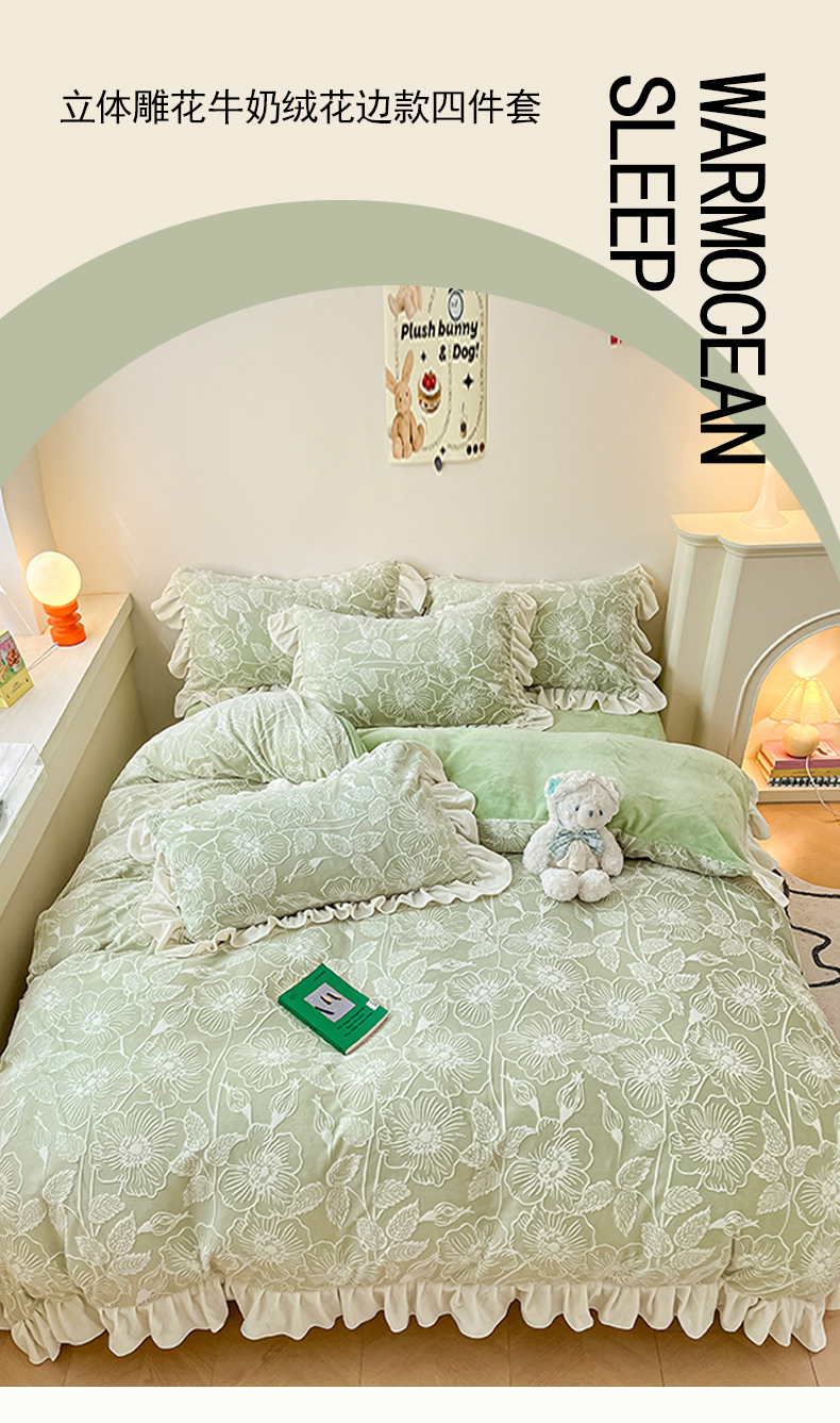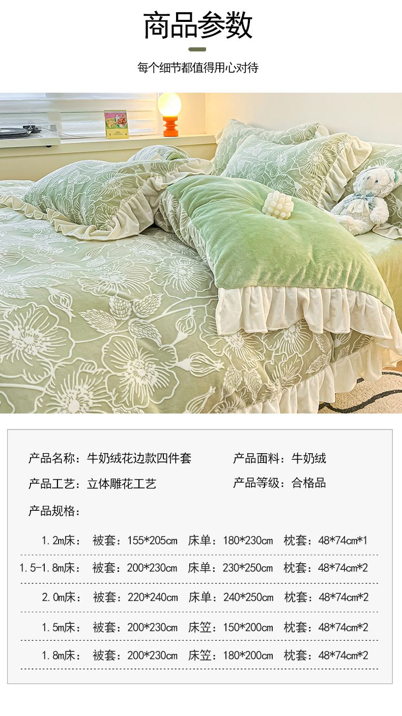当前位置: 91家纺网 > 商品网购 > 床品套件 > 四件套 > 牛奶绒四件套 > 琪格格纺织 2025新款全消光小清新花边款雕花牛奶绒四件套 雕花绒花边 安妮花苑 绿