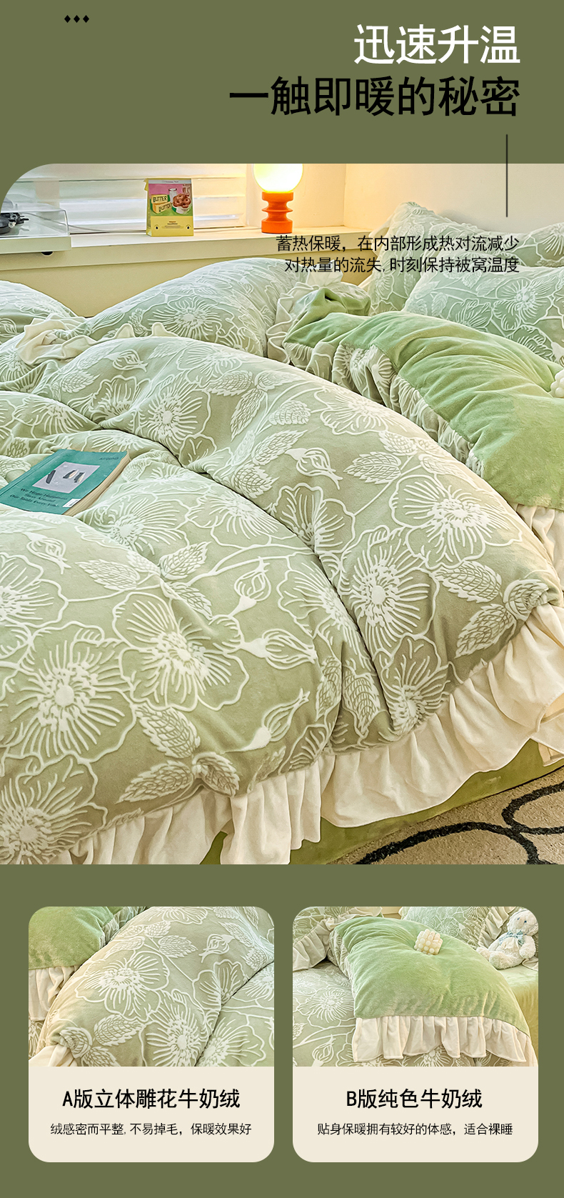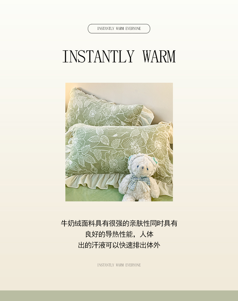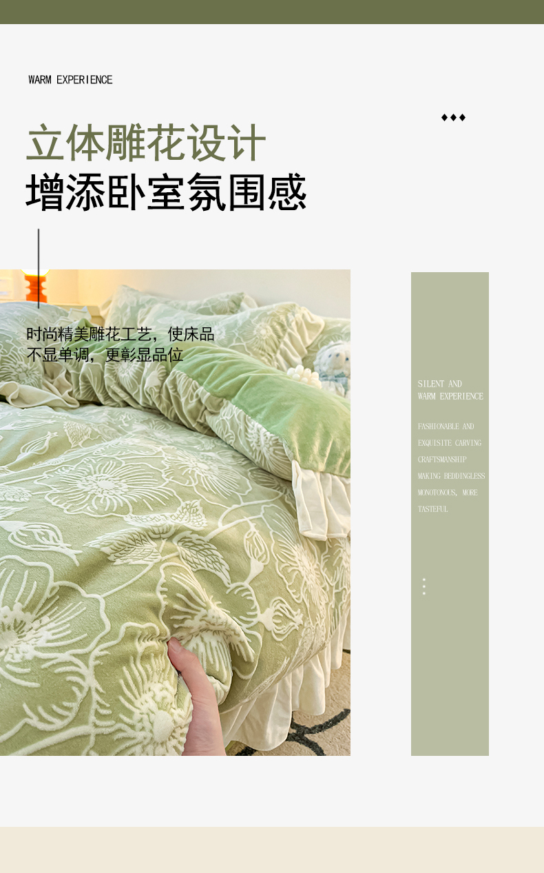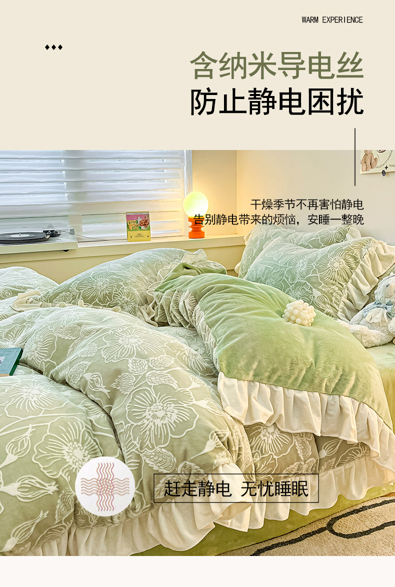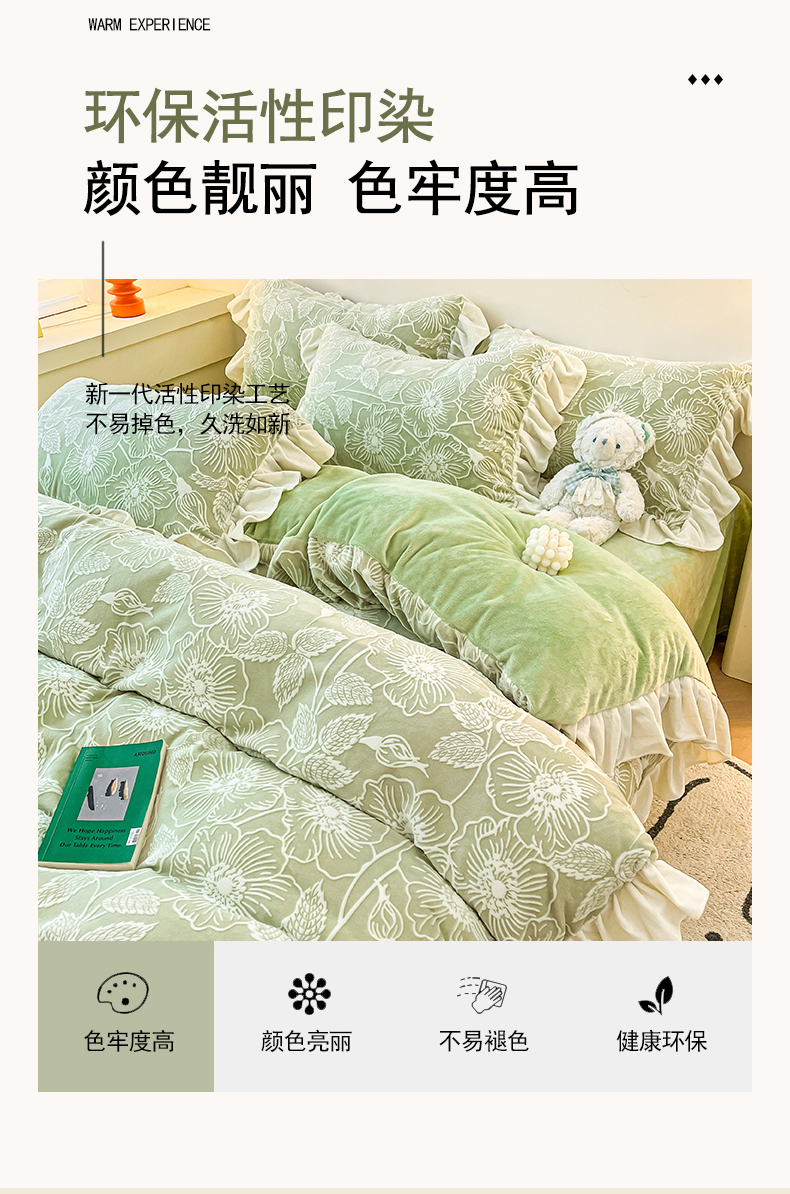 当前位置: 91家纺网 > 商品网购 > 床品套件 > 四件套 > 牛奶绒四件套 > 琪格格纺织 2025新款全消光小清新花边款雕花牛奶绒四件套 雕花绒花边 安妮花苑 绿