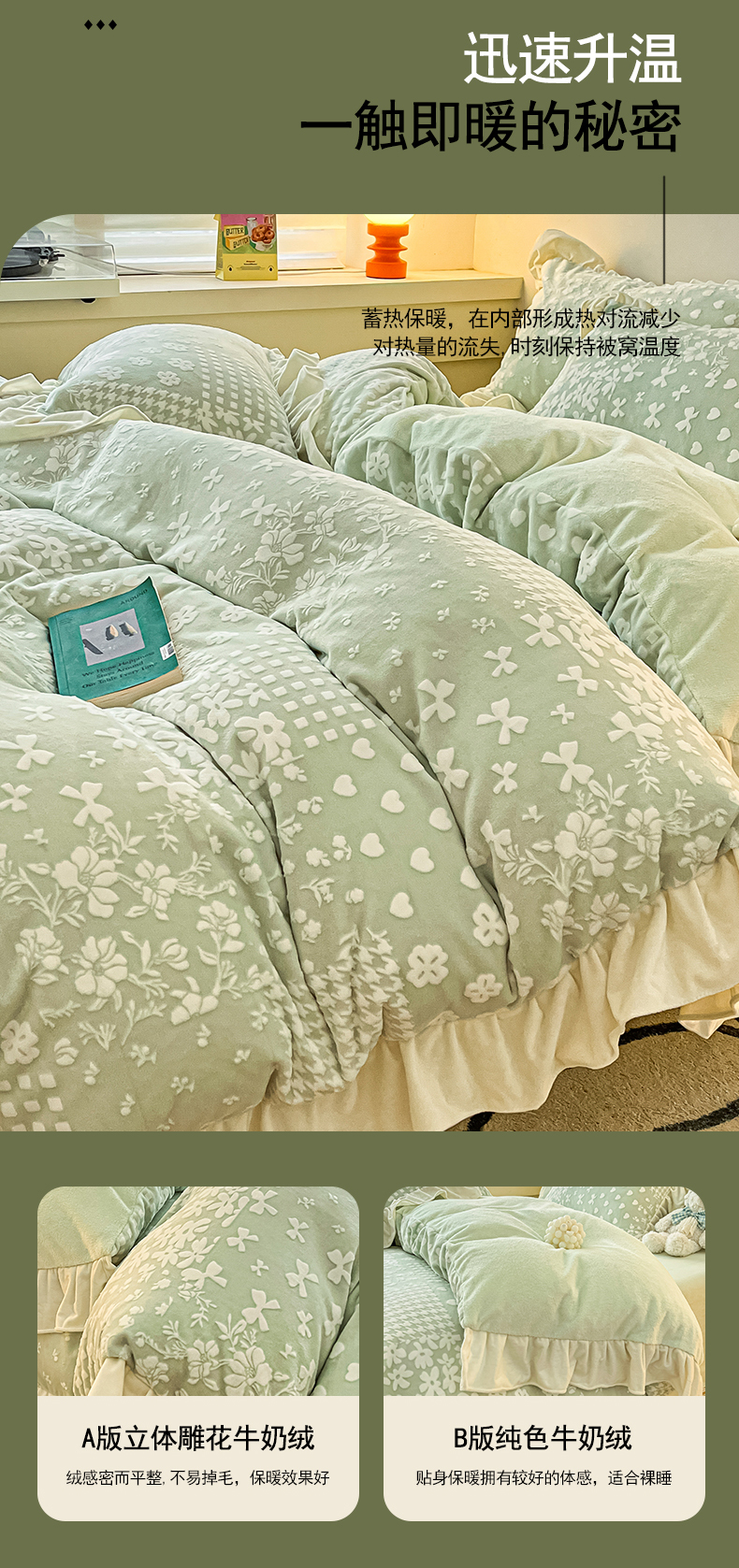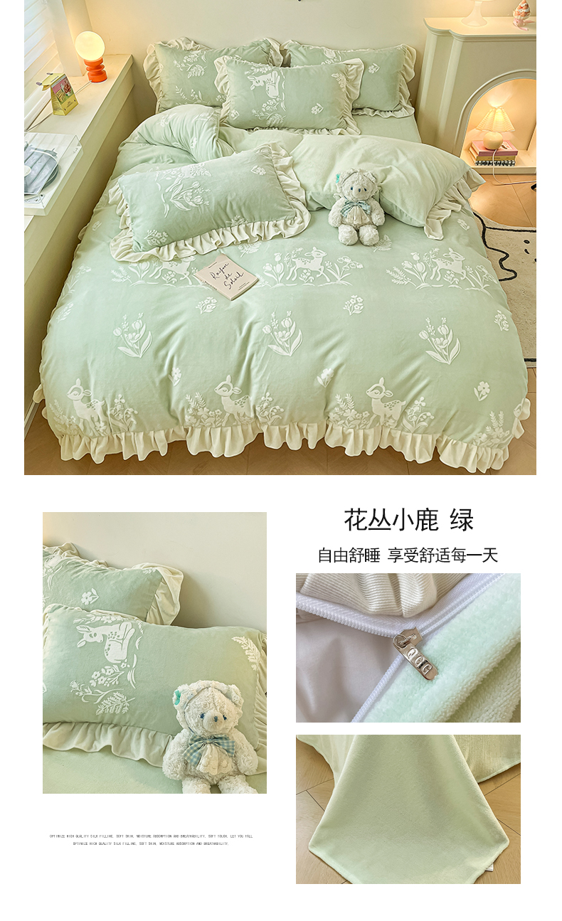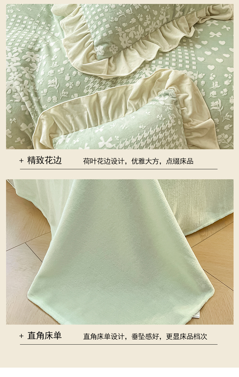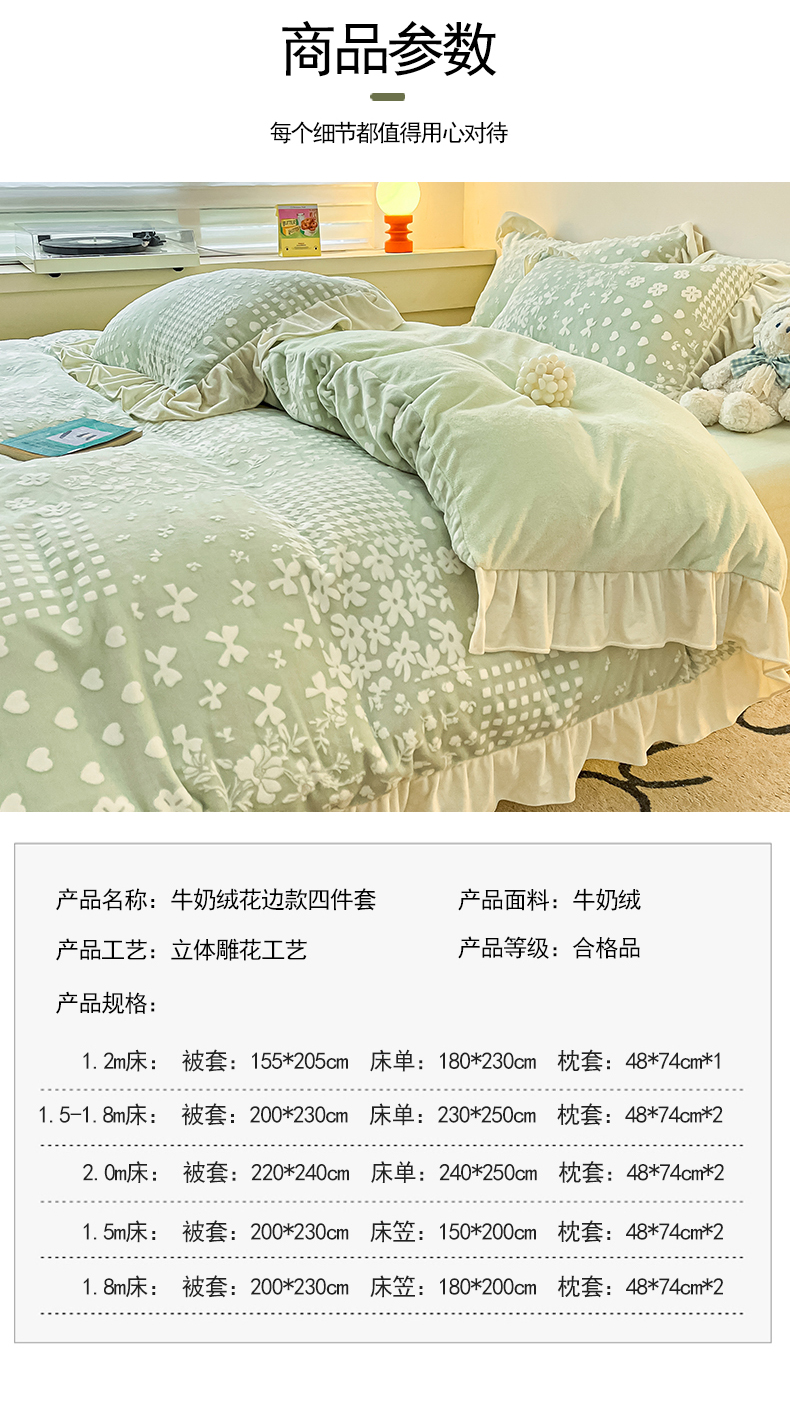 当前位置: 91家纺网 > 商品网购 > 床品套件 > 四件套 > 牛奶绒四件套 > 琪格格纺织 2025新款全消光小清新花边款雕花牛奶绒四件套 雕花绒花边-阿芙朵绿