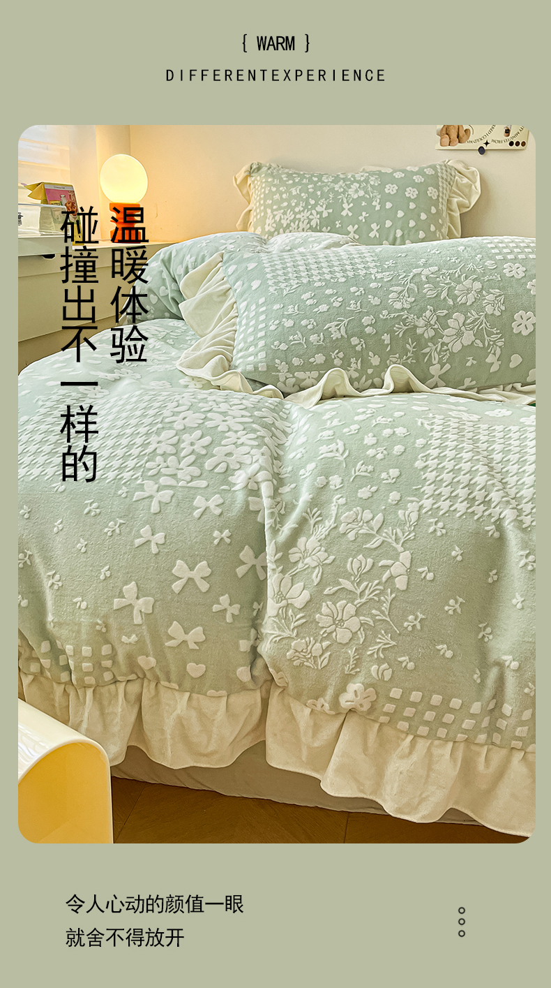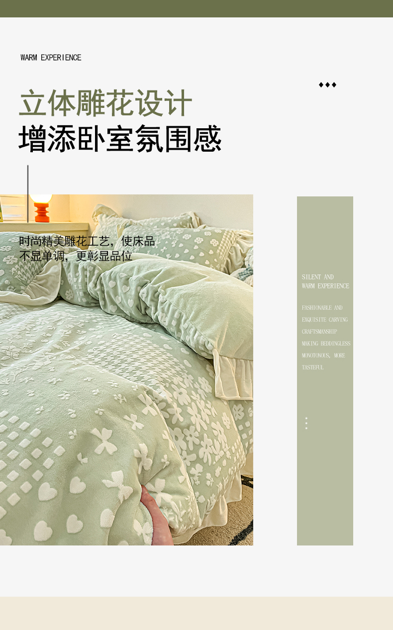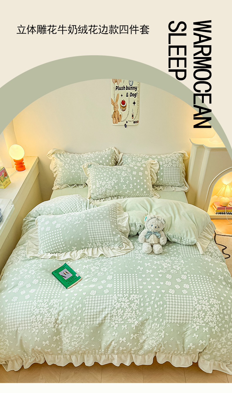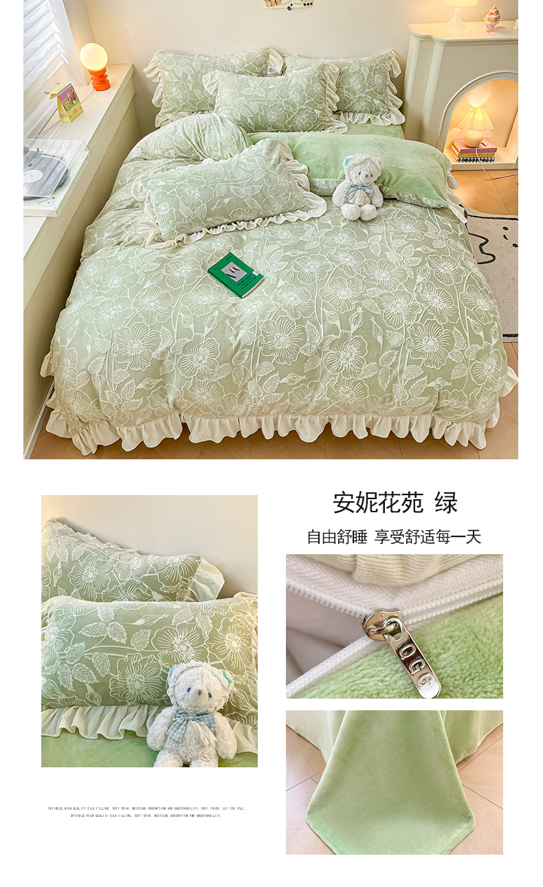 当前位置: 91家纺网 > 商品网购 > 床品套件 > 四件套 > 牛奶绒四件套 > 琪格格纺织 2025新款全消光小清新花边款雕花牛奶绒四件套 雕花绒花边-阿芙朵绿
