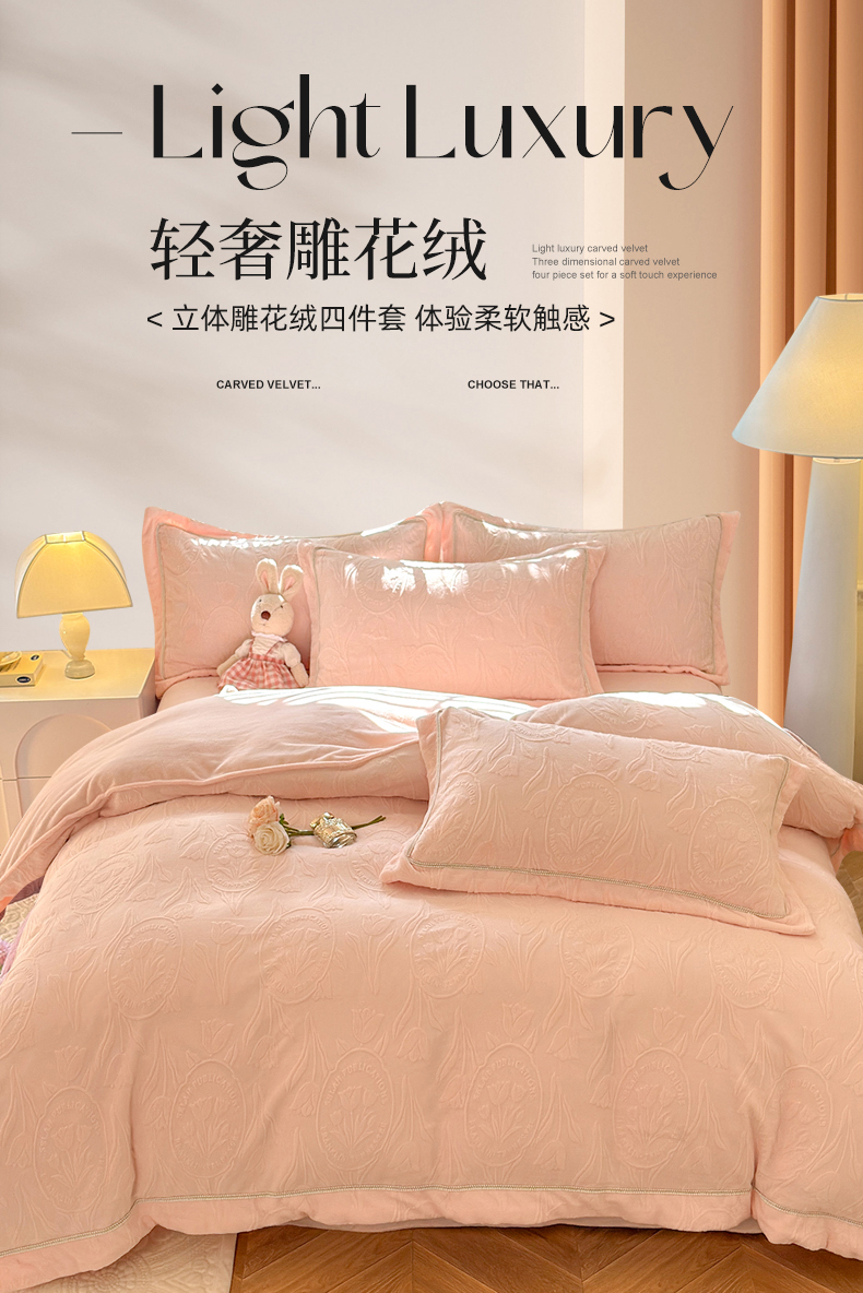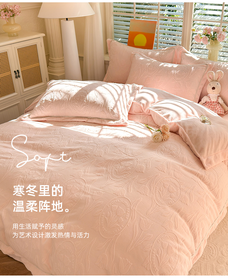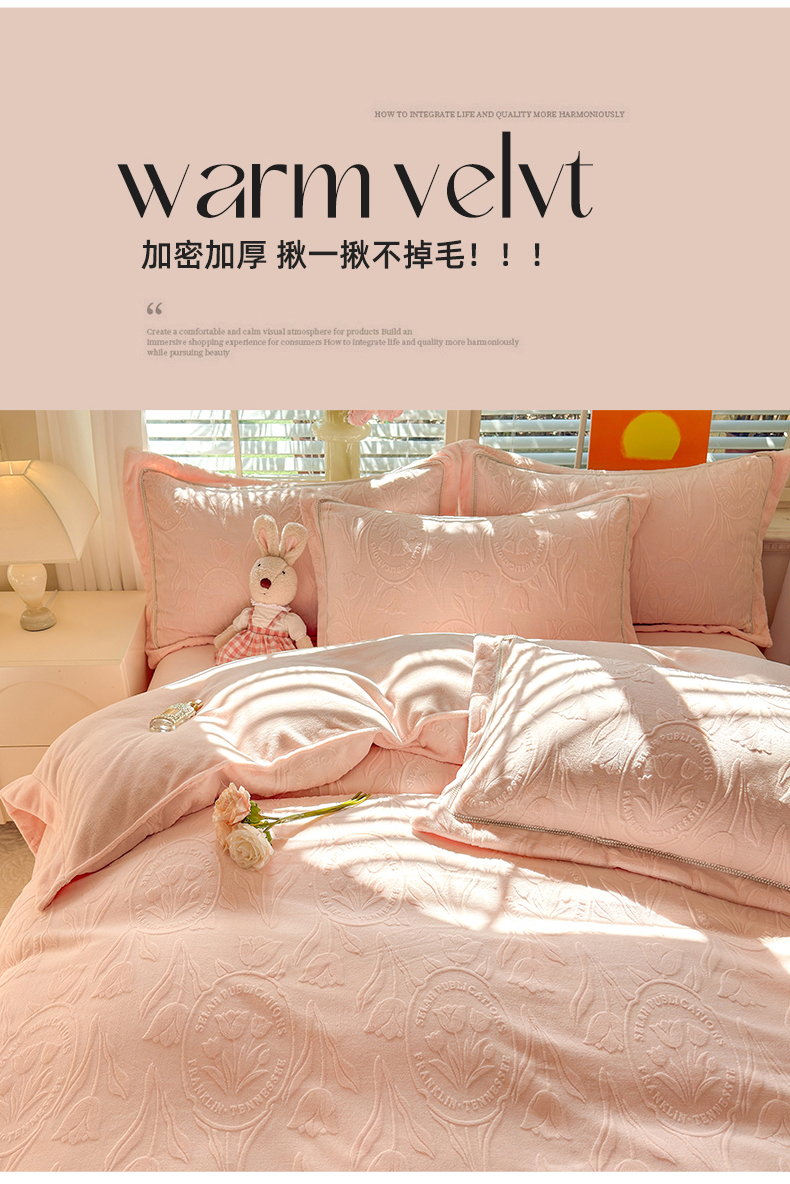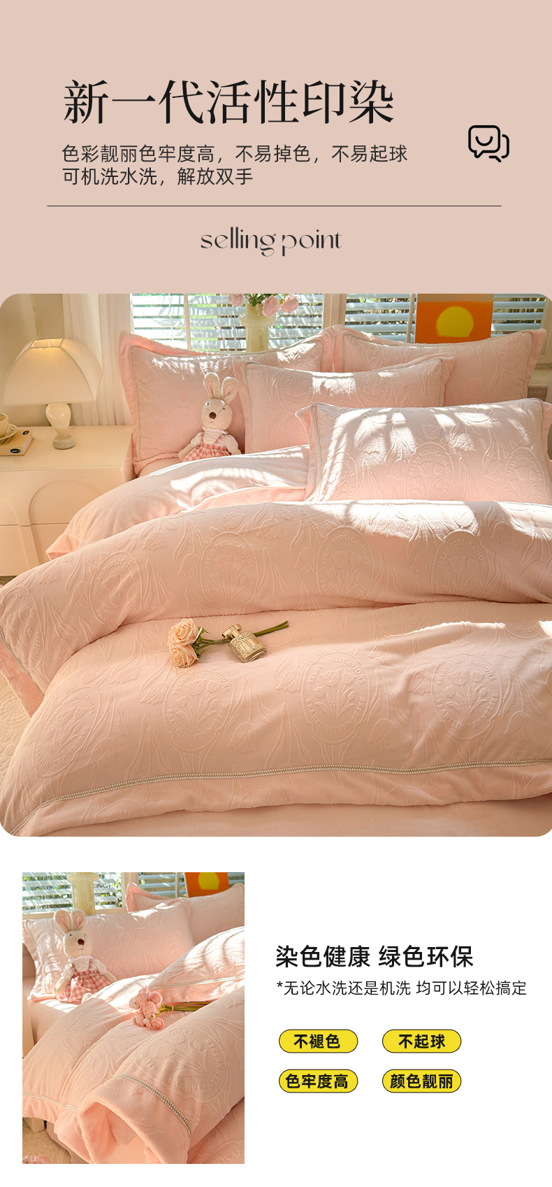 商品名称:艾唯希家纺 2025新款全消光雕花绒织带款四件套牛奶绒-雕花织带系列 郁金香-粉