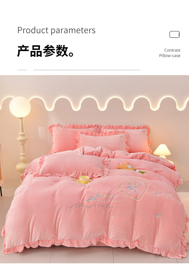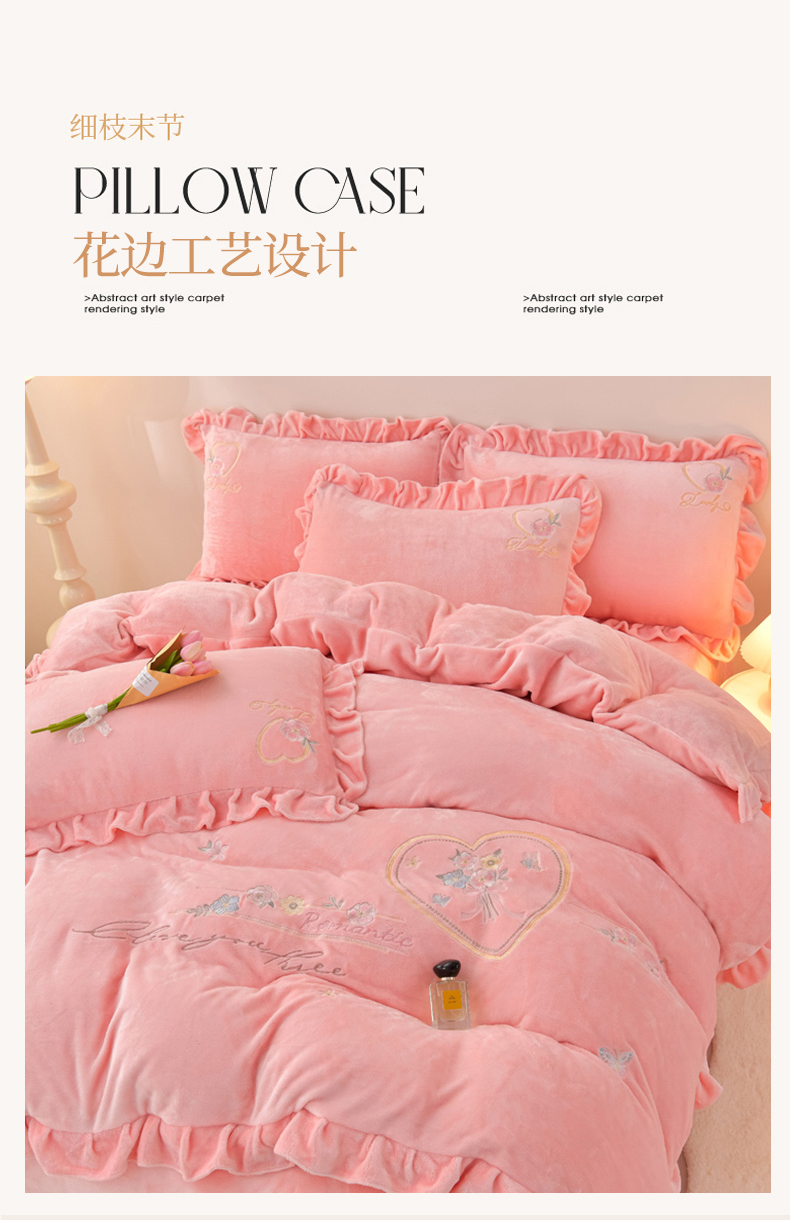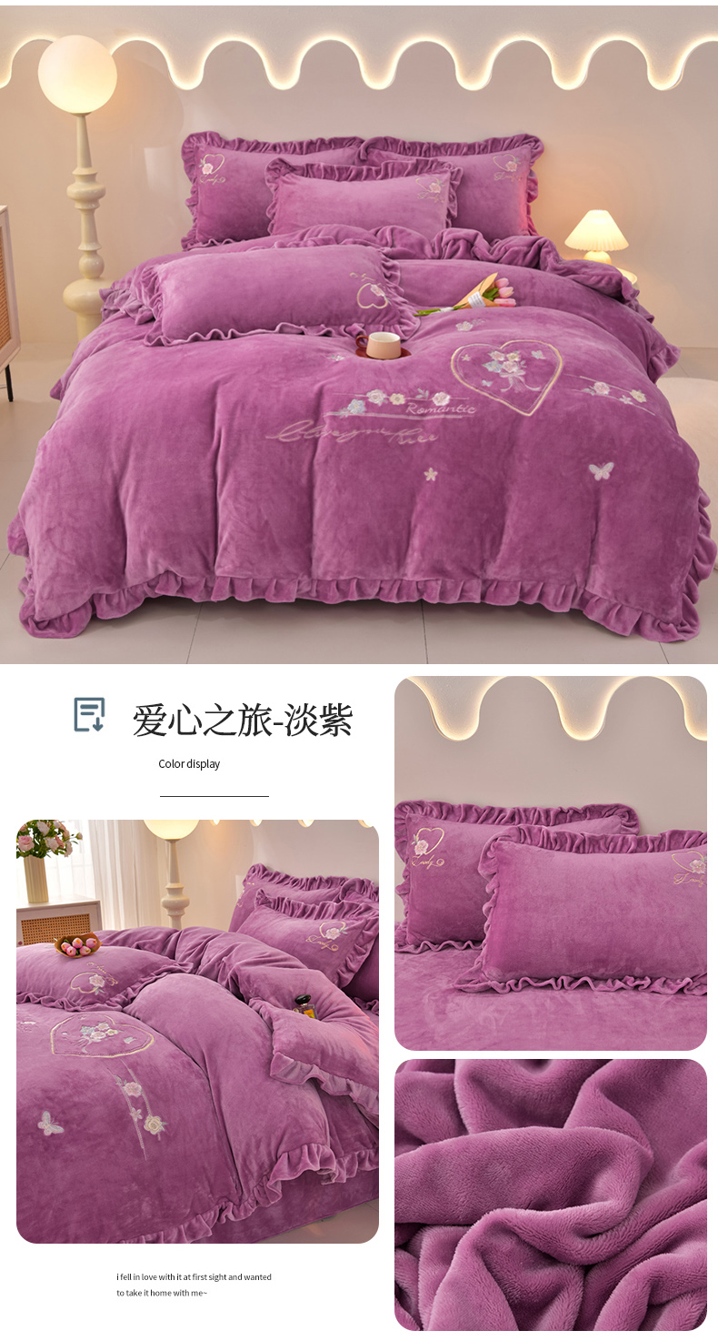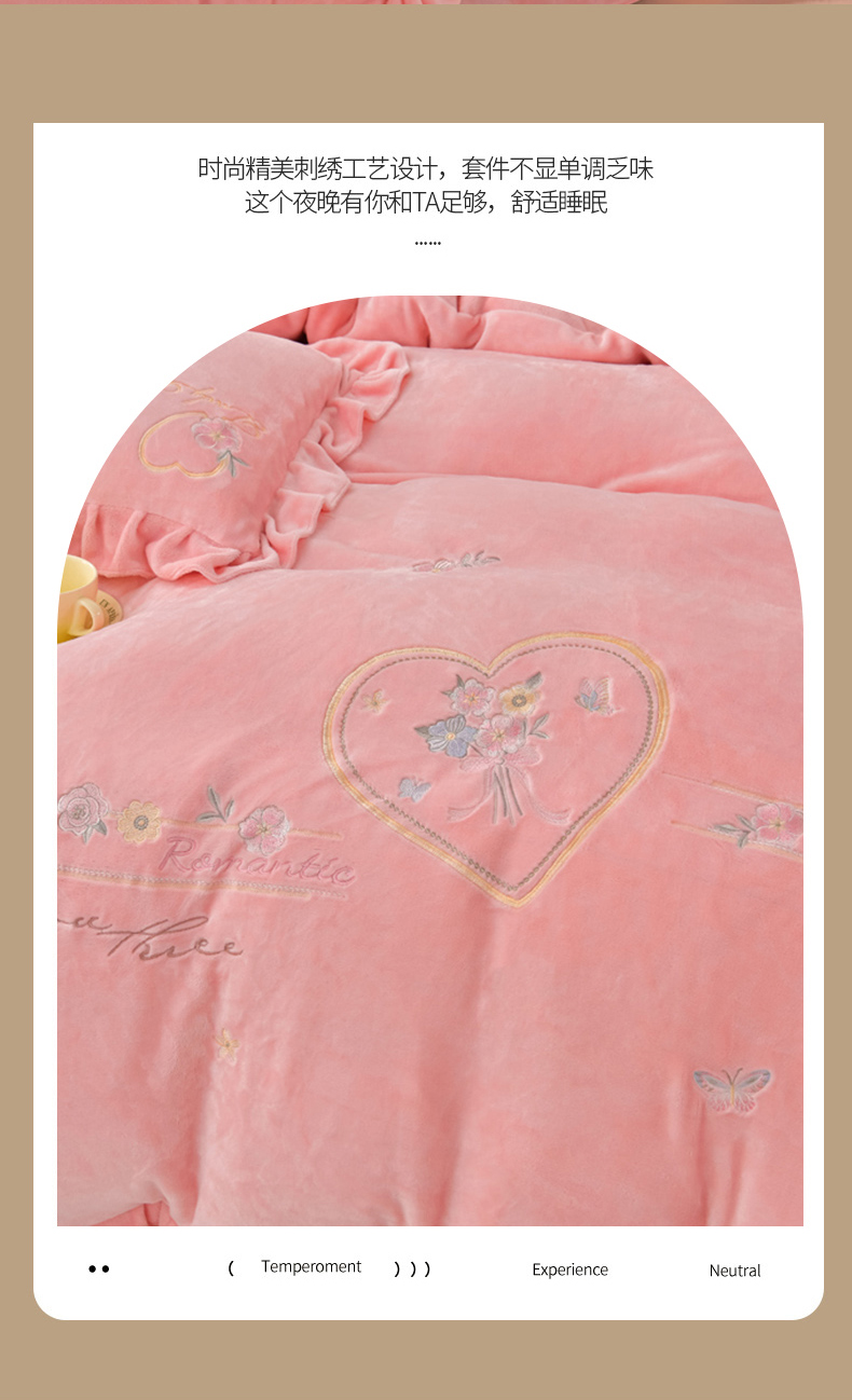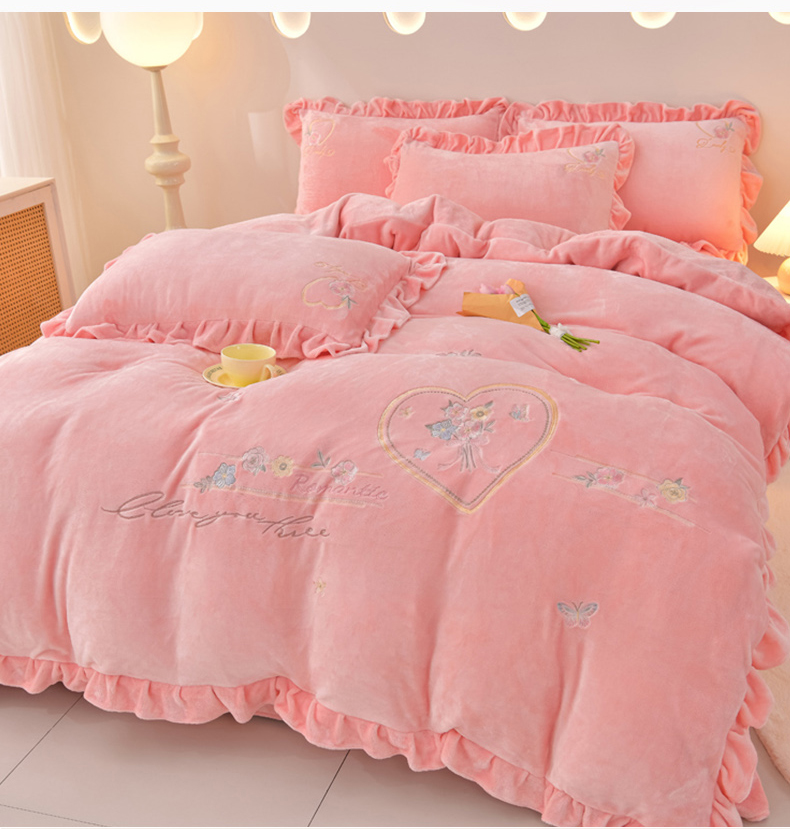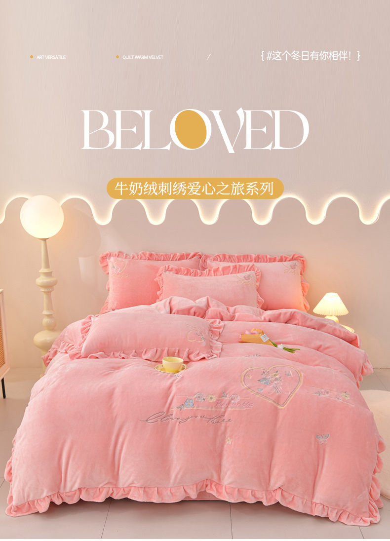 商品名称:畅畅家纺 2025新款亲肤舒适冬季刺绣花边保暖牛奶绒四件套-爱心之旅 爱心之旅-浅粉