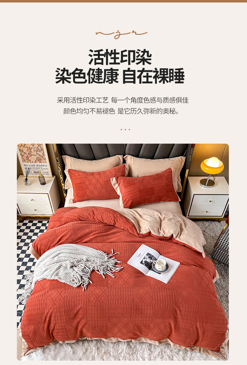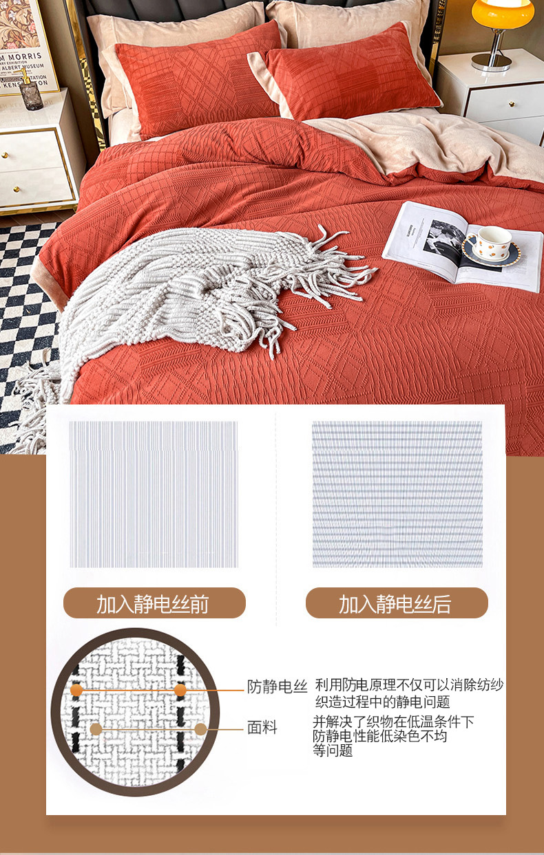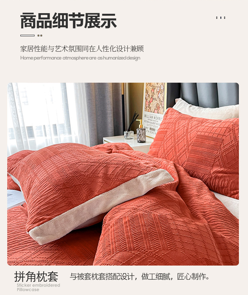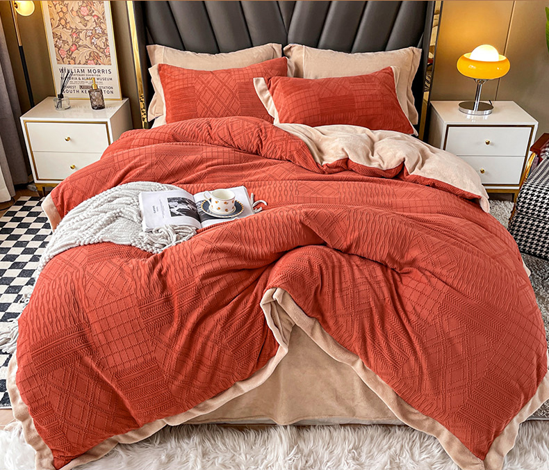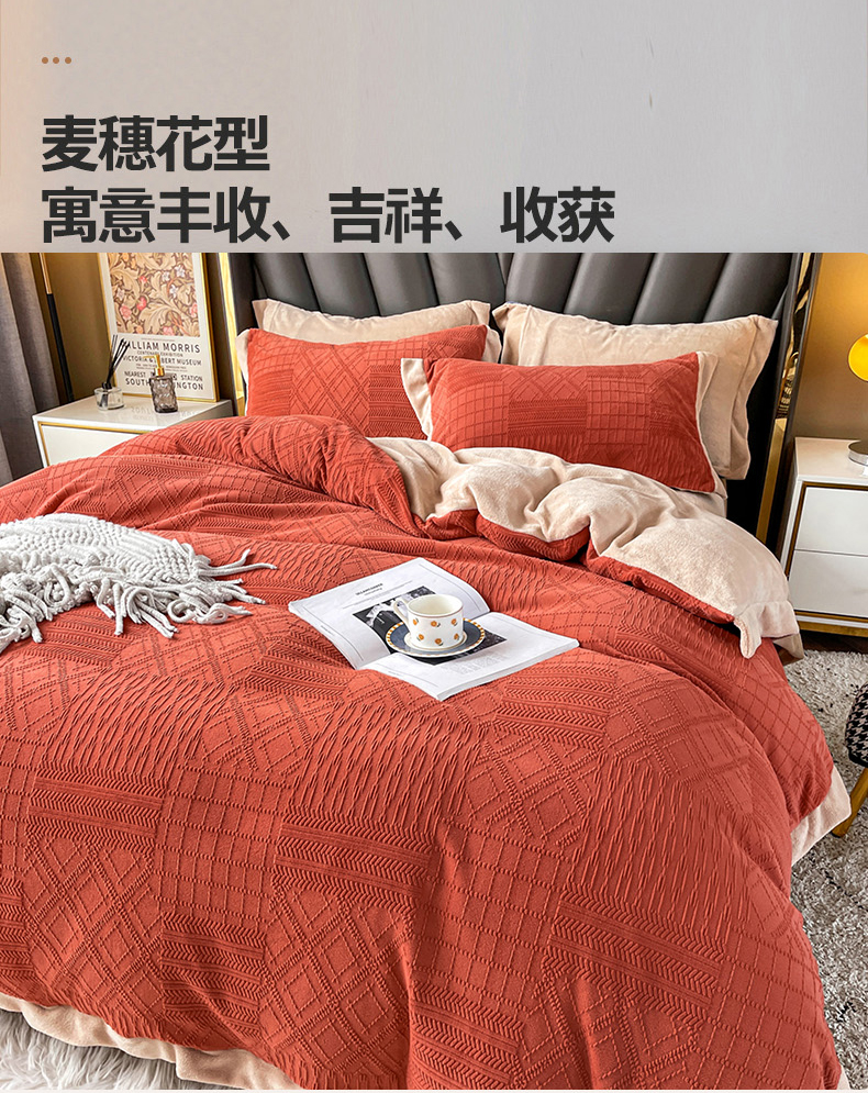梵克保罗 2025秋冬新款全消光拼角雕花绒牛奶绒四件套 安娜-奶油橙