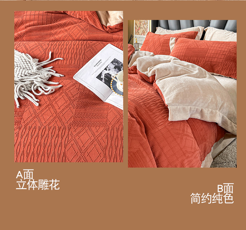 商品名称:梵克保罗 2025秋冬新款全消光拼角雕花绒牛奶绒四件套 安娜-奶油橙