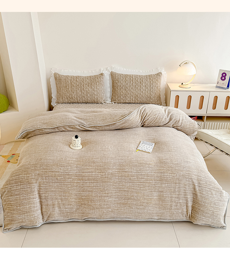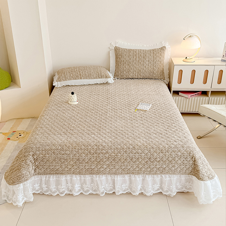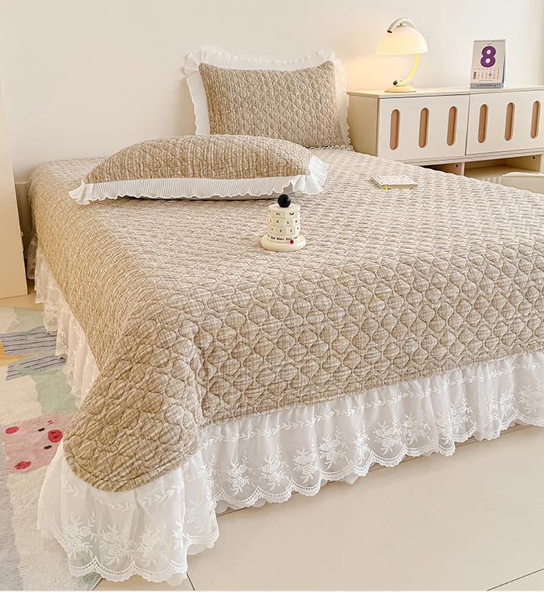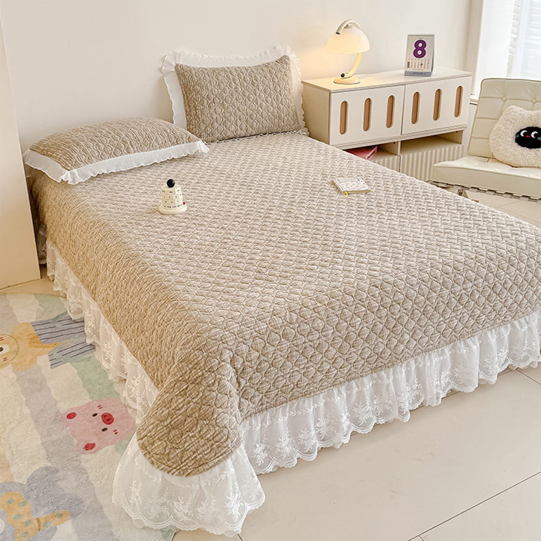 冬然家纺 2025新款高克重牛奶绒蕾丝花边床盖系列 肌理纹-咖