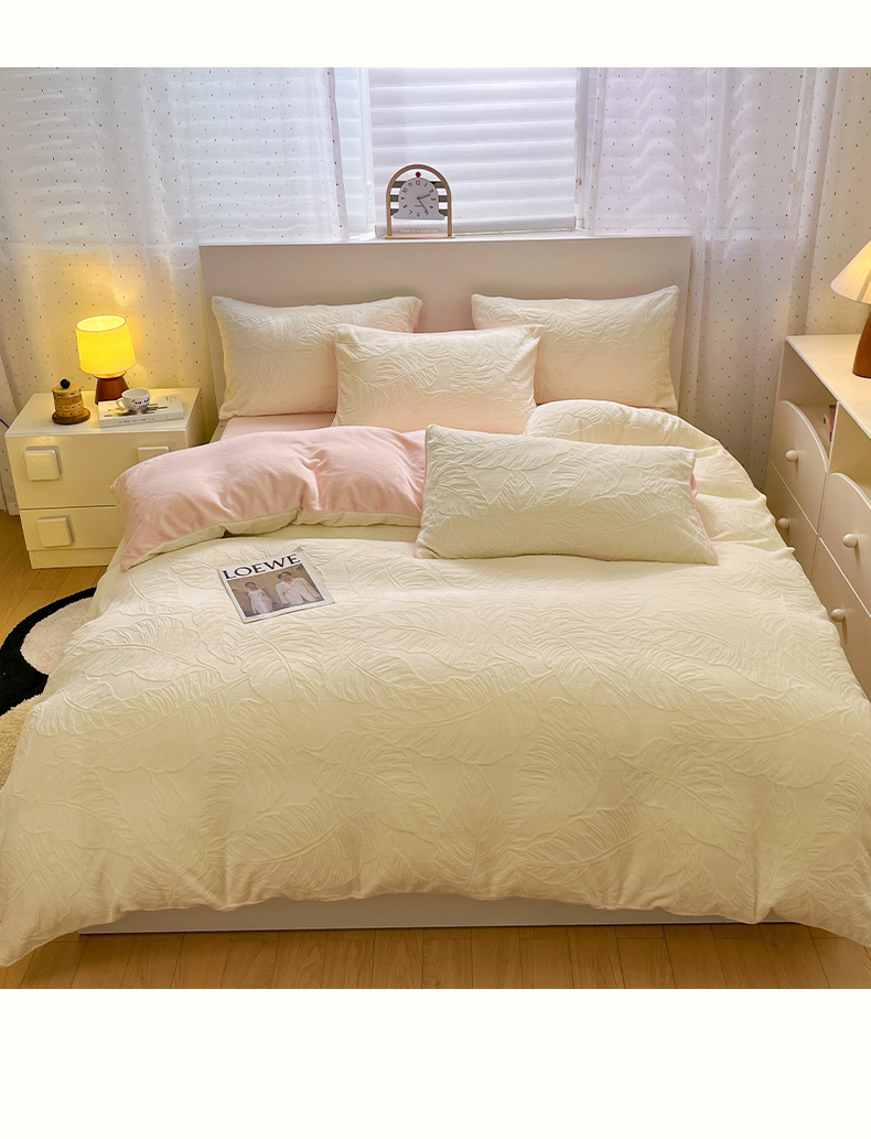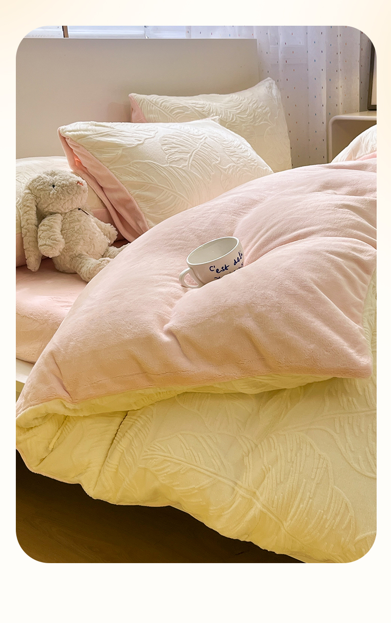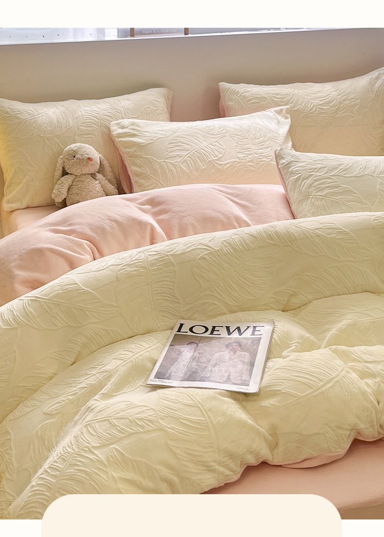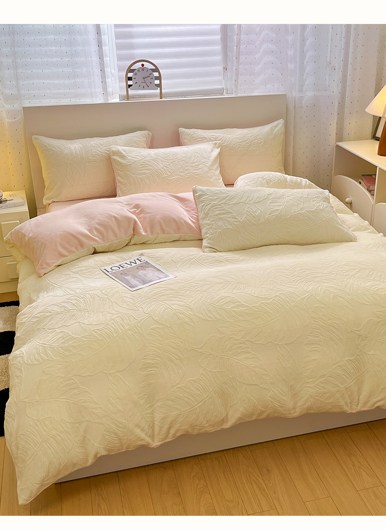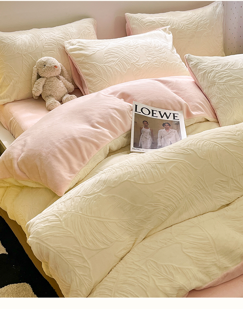 商品名称:如一 2025新款3D雕花牛奶绒四件套第三批 芭蕉叶-白粉