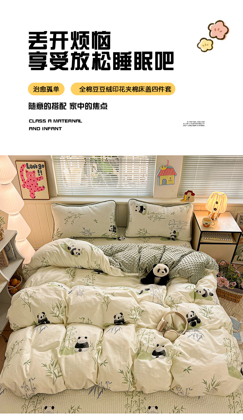 漫时光 2025新款正面纯棉反面宝宝绒印花夹棉砂洗床盖四件套 小熊猫