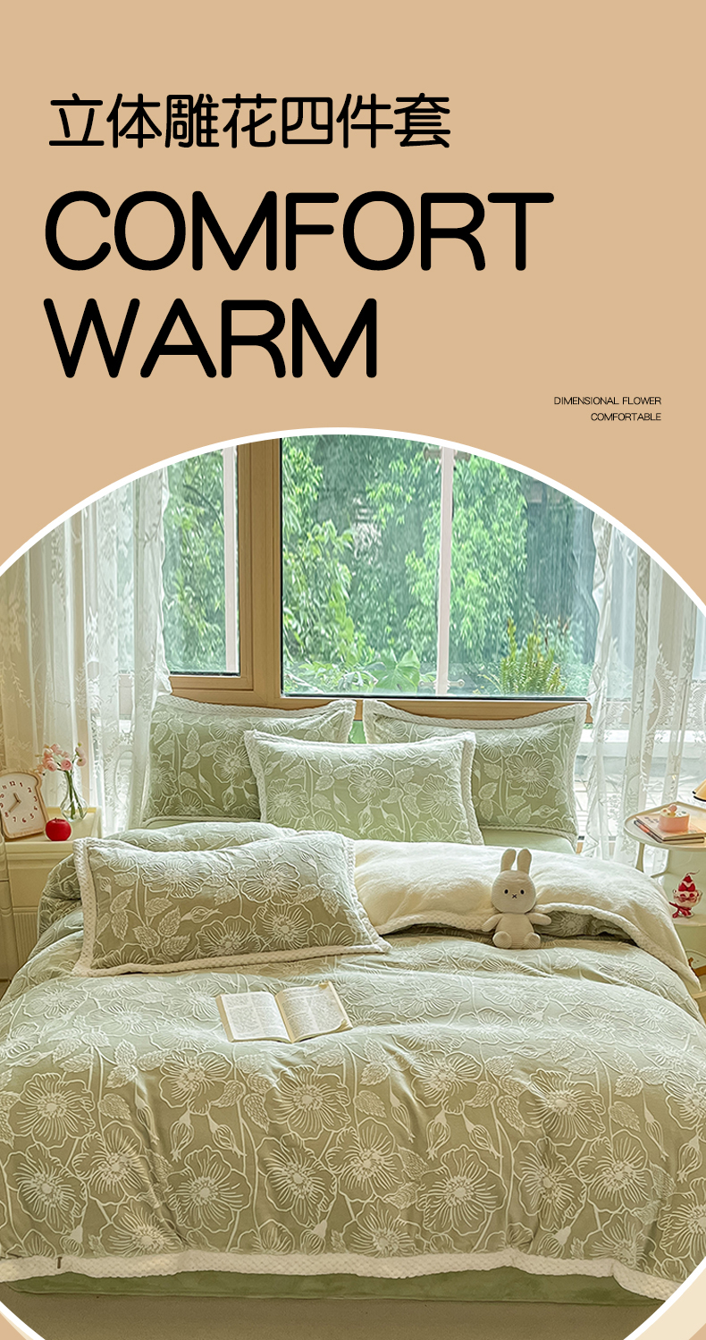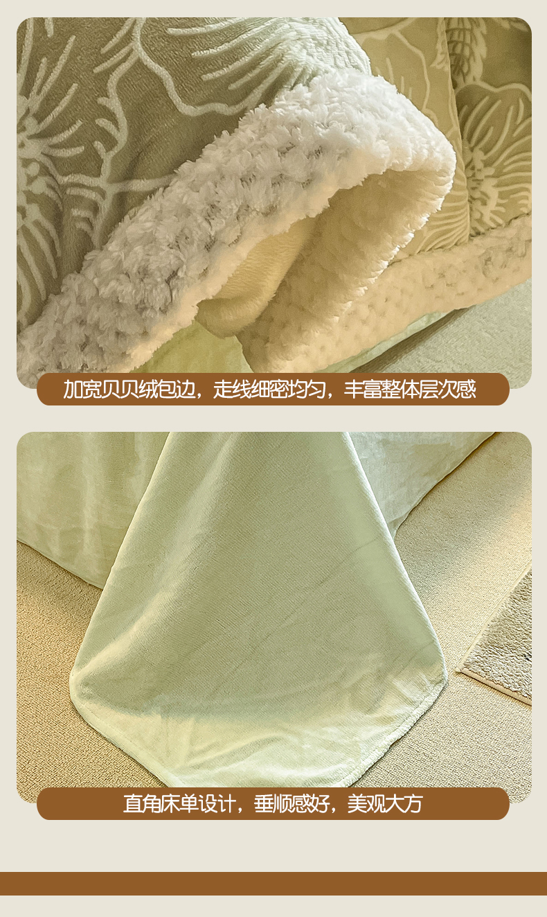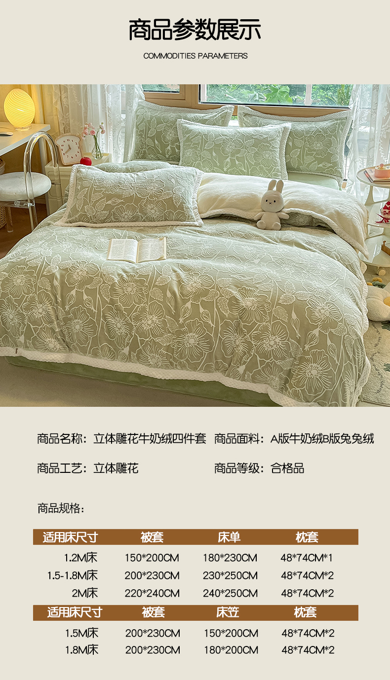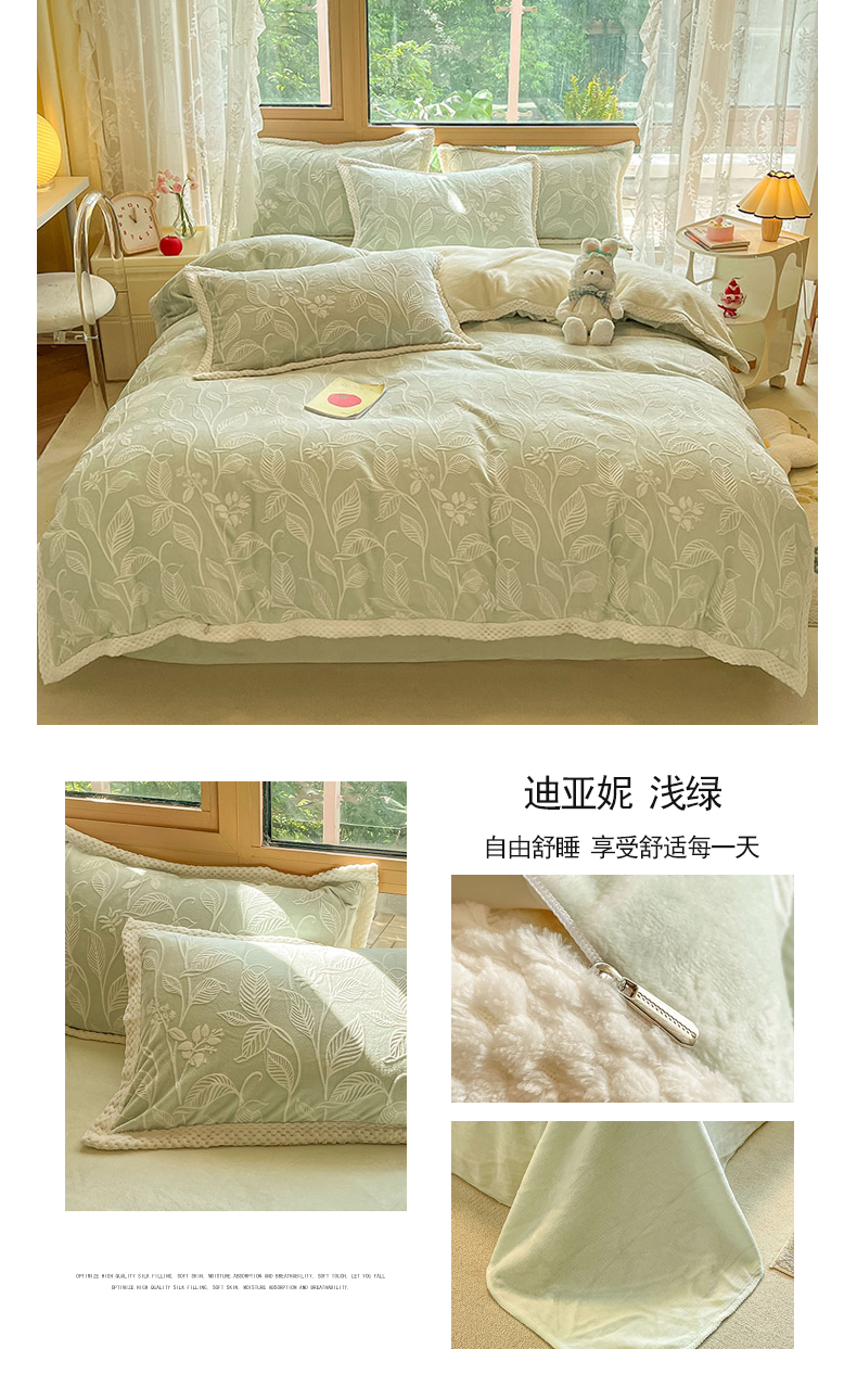 当前位置: 91家纺网 > 商品网购 > 床品套件 > 四件套 > 其它四件套 > 琪格格纺织 2025新款全消光包边立体简约清新雕花绒四件套 雕花包边- 安妮花苑 绿