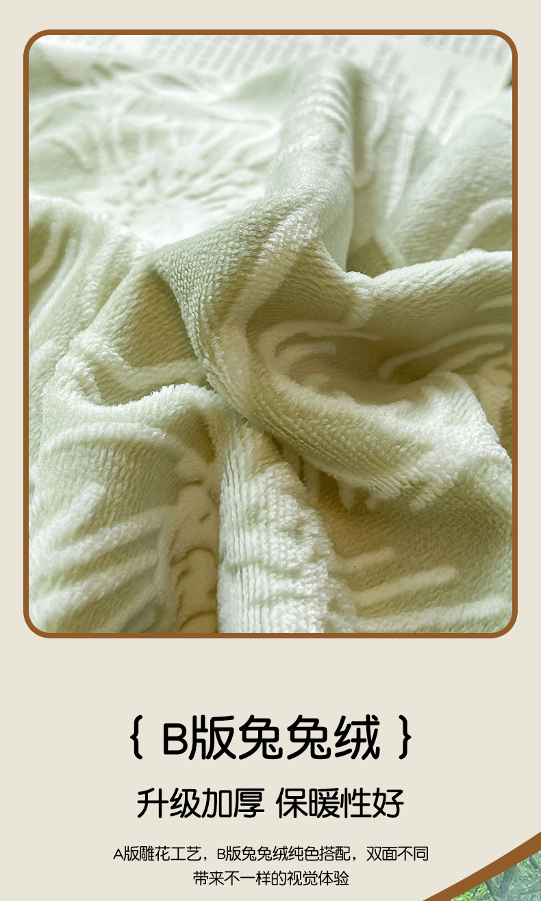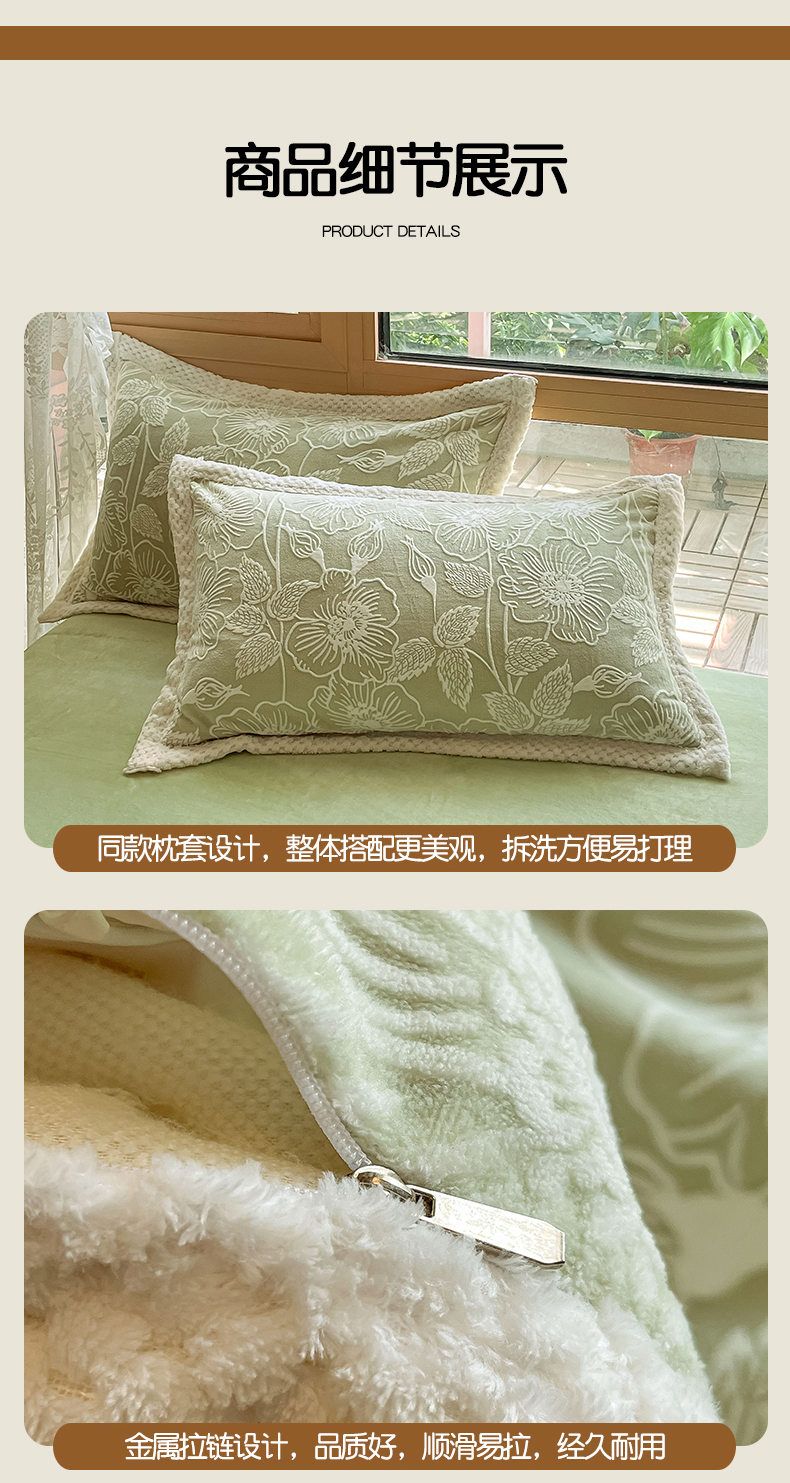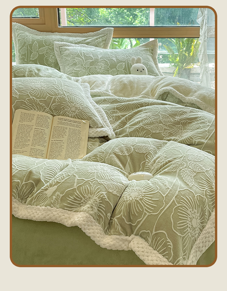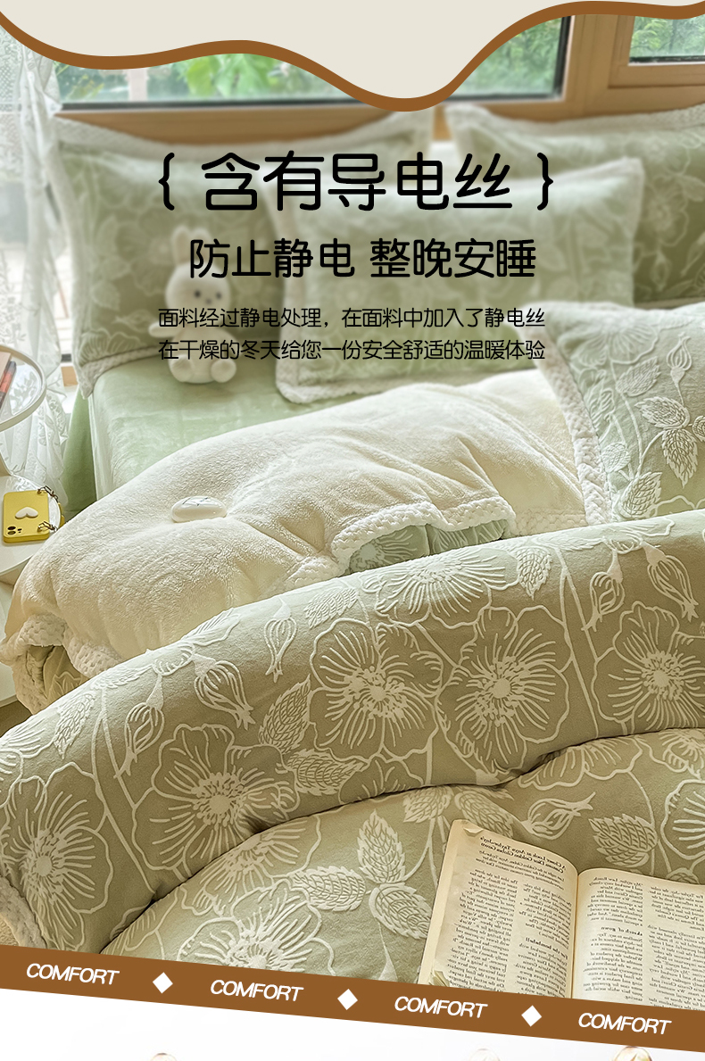 当前位置: 91家纺网 > 商品网购 > 床品套件 > 四件套 > 其它四件套 > 琪格格纺织 2025新款全消光包边立体简约清新雕花绒四件套 雕花包边- 安妮花苑 绿