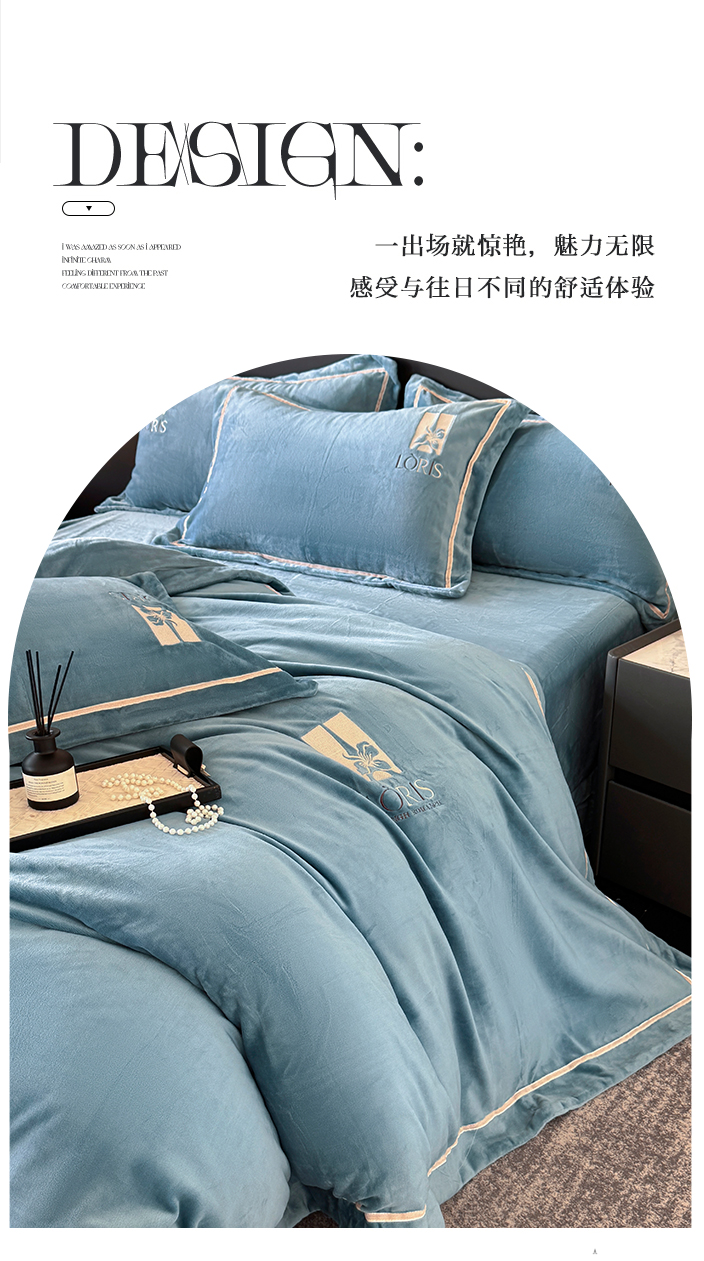 商品名称:宅家居 2025新款秋冬轻奢小香风刺绣全消光A类高克重牛奶绒四件套-艾菲尔 艾菲尔-雾蓝