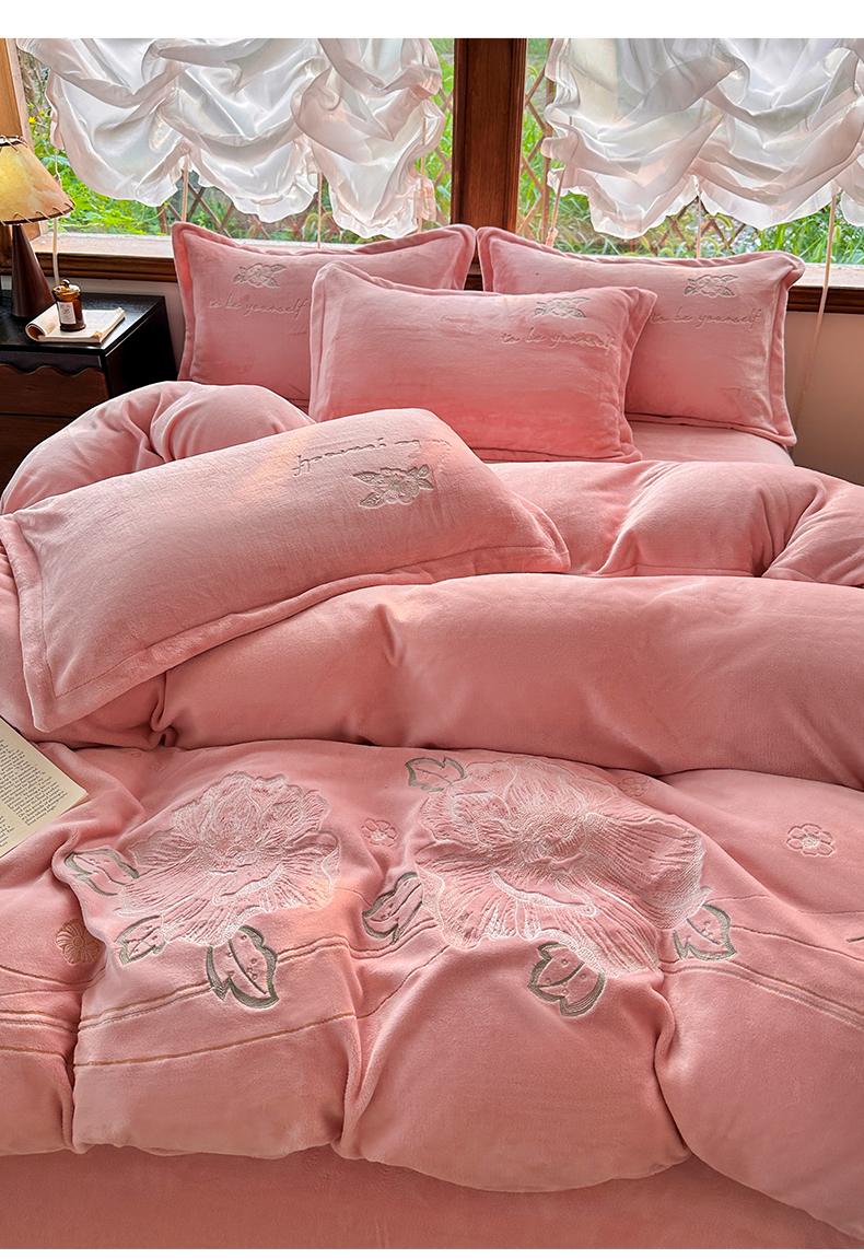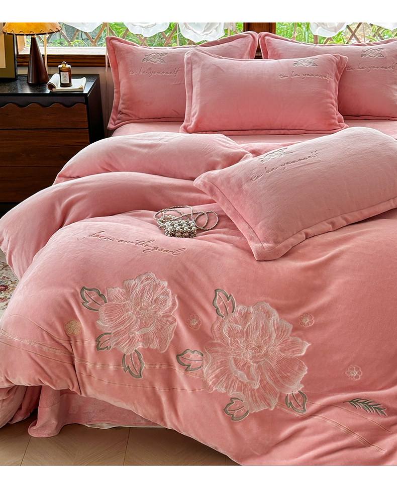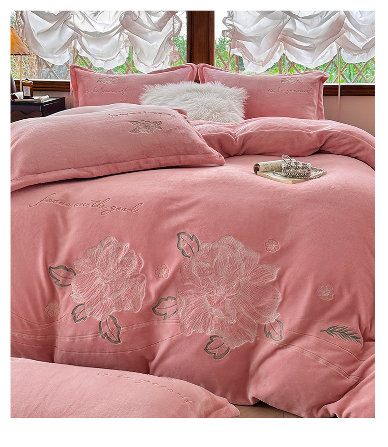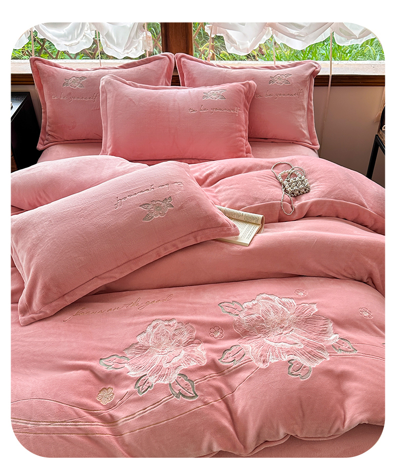 (总)2025外贸跑量款加厚清新公主法式风花卉纯色牛奶绒贴布绣刺绣花四件套单品床单被套婴儿绒法兰绒兔毛绒四件套,赫本粉,赫本紫,赫本玉色,赫本天蓝,赫本灰,心动粉,心动紫,心动玉色,心动灰,心动天蓝