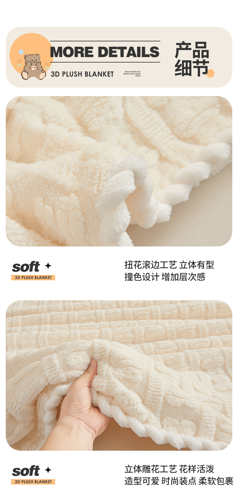 商品名称:世纪绒品 2025新款A类立体牛奶绒雕花绒单层毛毯毯子-多宝熊 多宝熊 月牙白