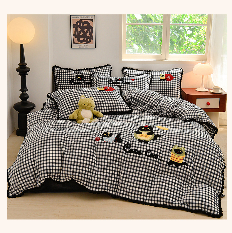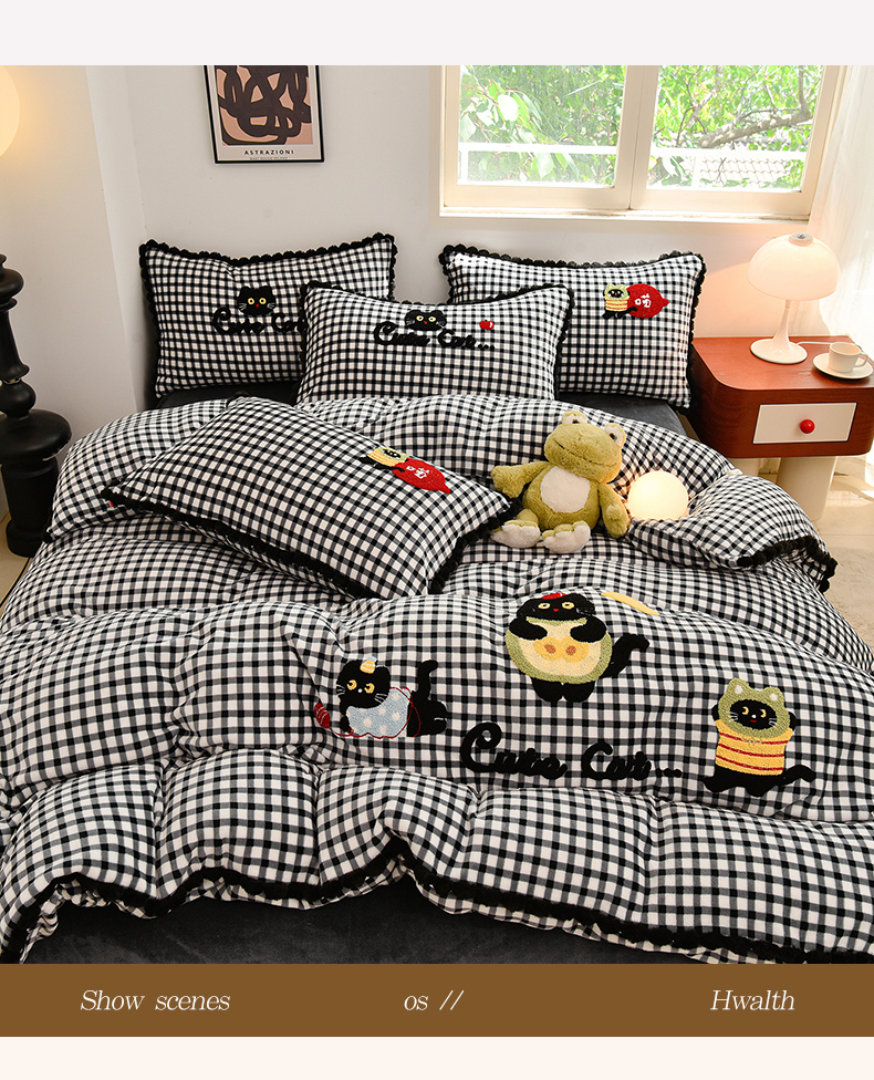 商品名称:炫拼家纺 2025新款大眼萌小熊韩系黑毛球毛巾绣牛奶绒四件套 大眼萌小猫-黑