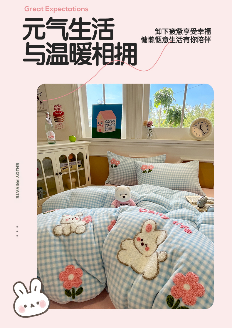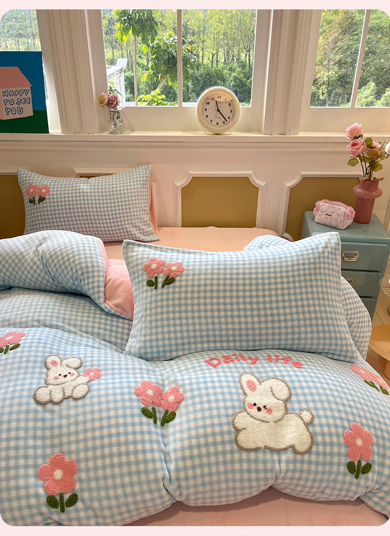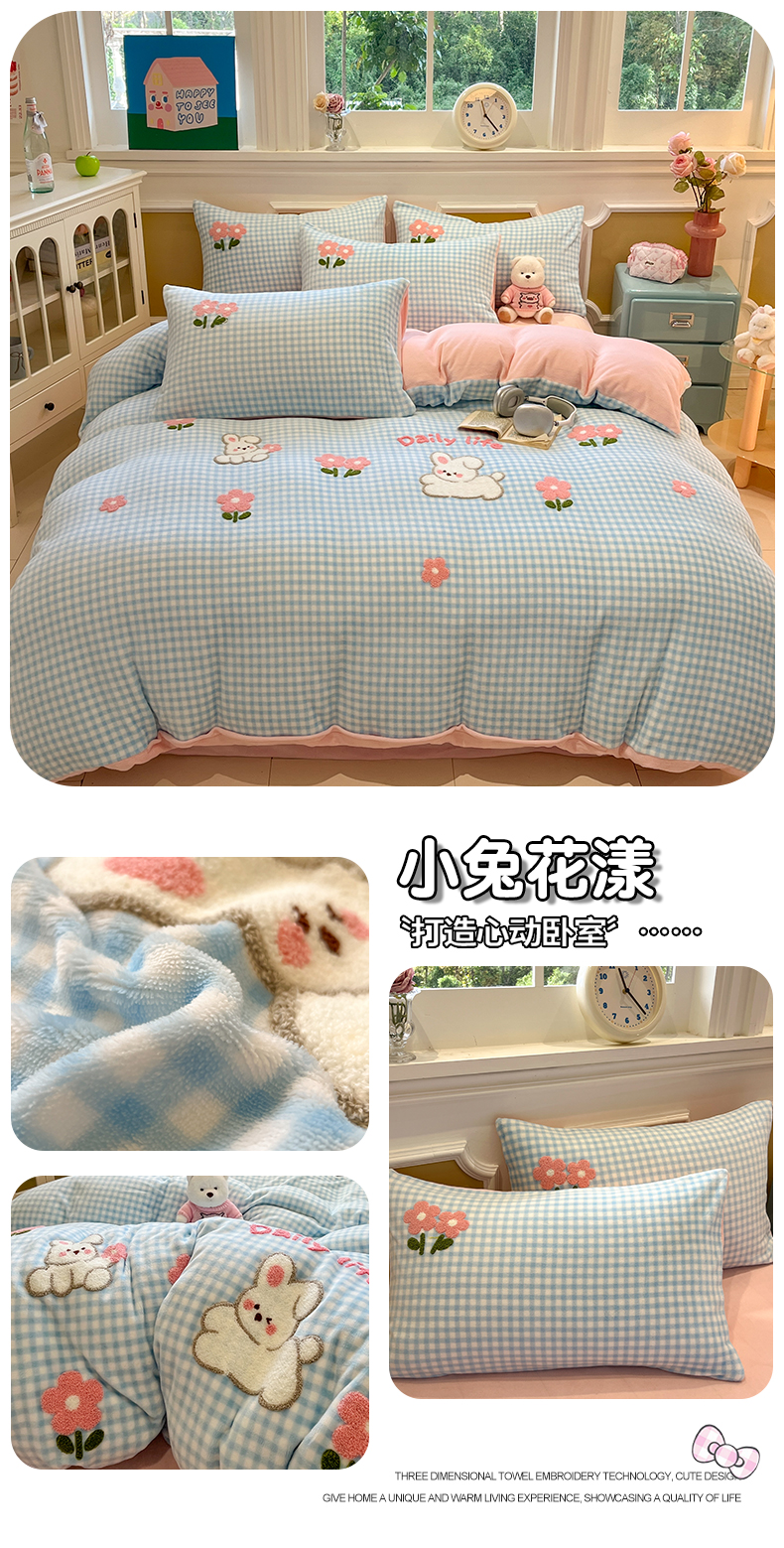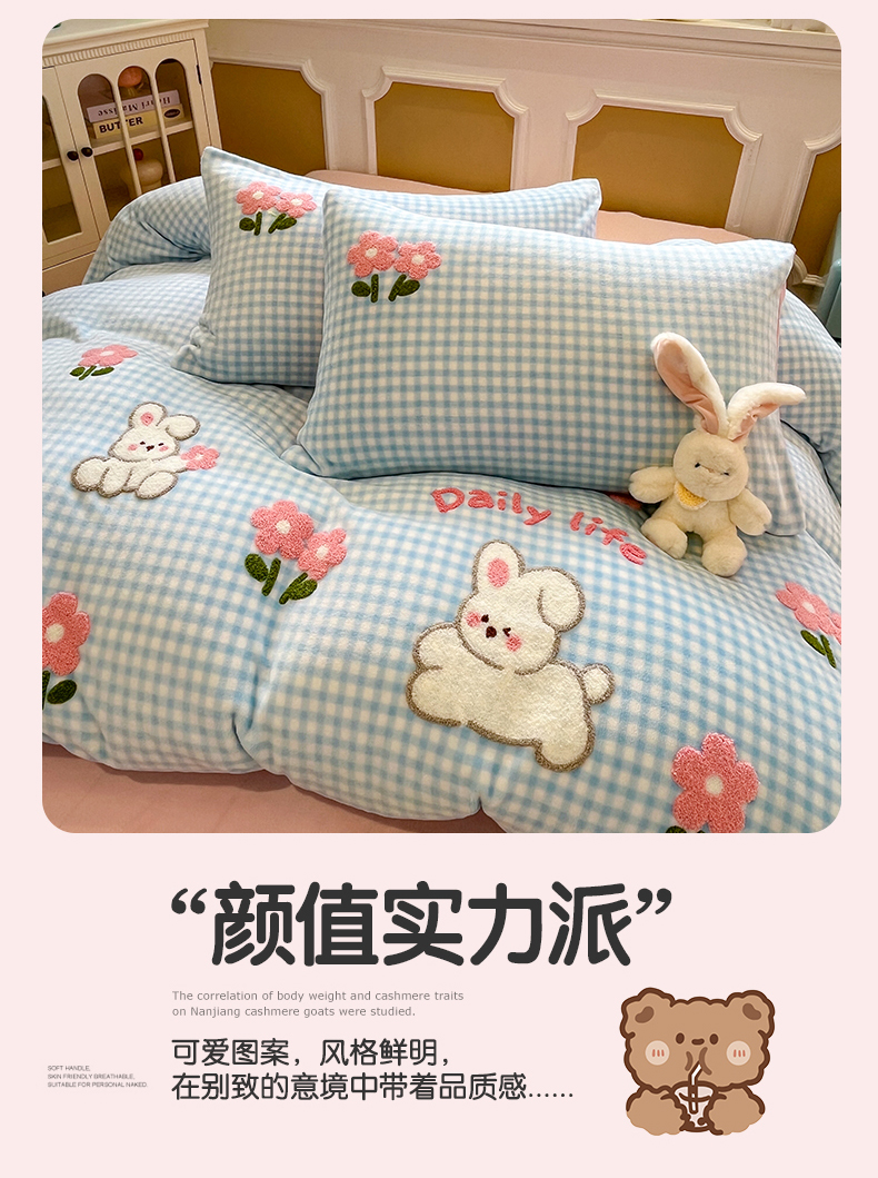 商品名称:优迈 2025新款A类卡通200g牛奶绒毛巾绣四件套 小兔花漾