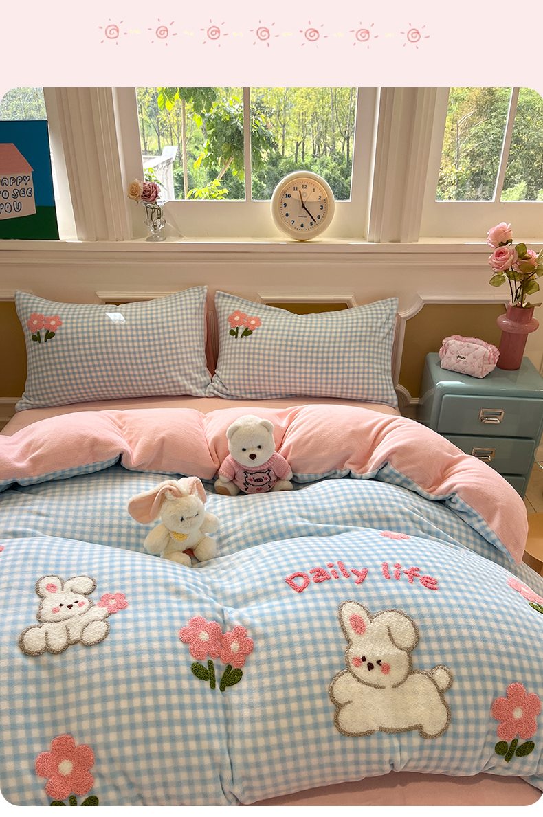 (总)优迈 2025新品全棉加厚水洗棉韩版小清新绣花工艺贴布绣四件套--郁金香小兔,郁金香小兔 粉白,郁金香小兔 浅粉,郁金香小兔 浅紫