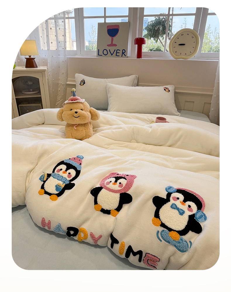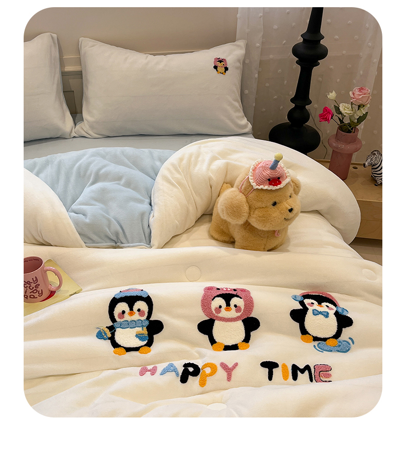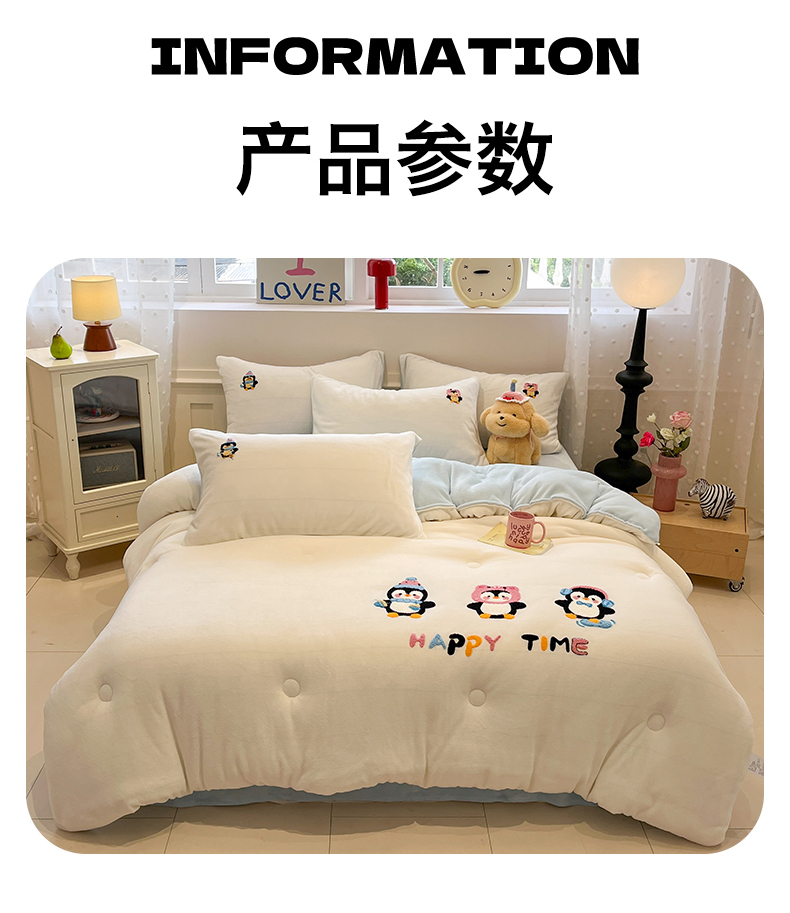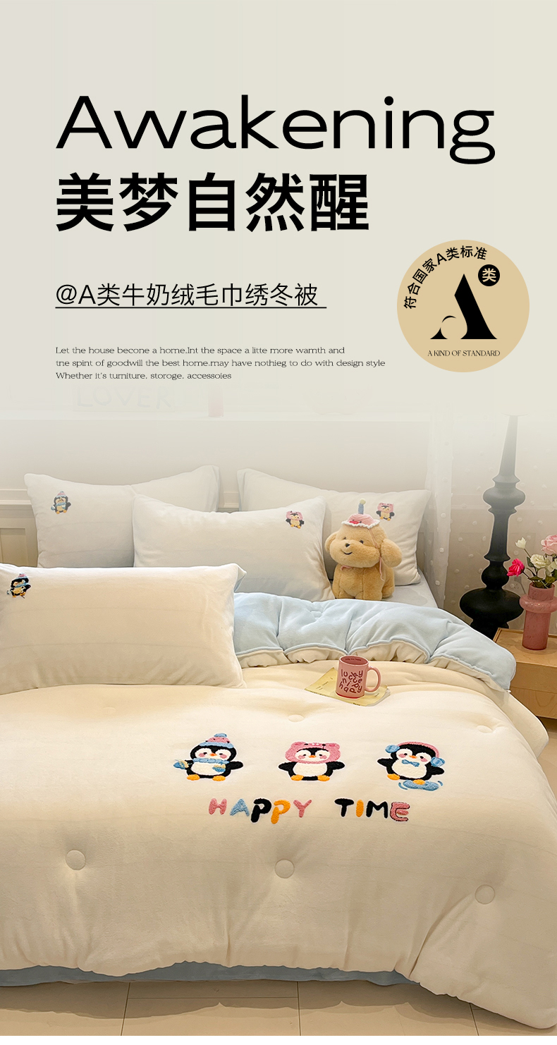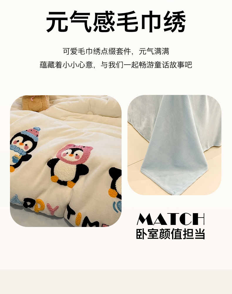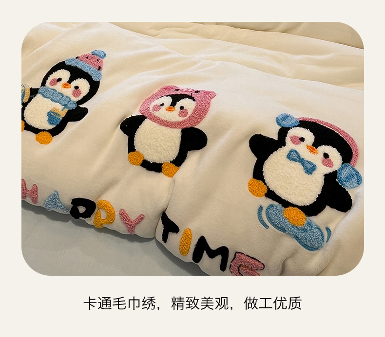 商品名称:优迈 2025新品牛奶绒毛巾绣冬被 被子被芯 冬被-企鹅伙伴